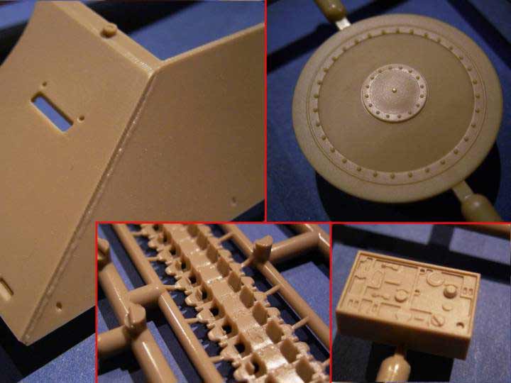 Die Teile selbst sind in aller Regel sehr gut detailliert, was besonders auf die Kleinteile zutrifft. Was auffällt ist die Tatsache, das obwohl es sich um einen brandneuen Bausatz handelt, die Teile nicht frei von leichtem Versatz sind und das bei einigen Teilen Versäuberungsarbeit anfällt. Das Plastik selbst erweist sich bei der Verarbeitung teilweise als etwas zu weich.