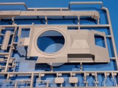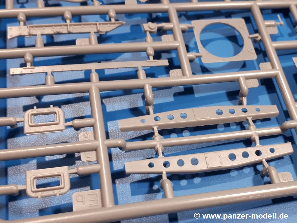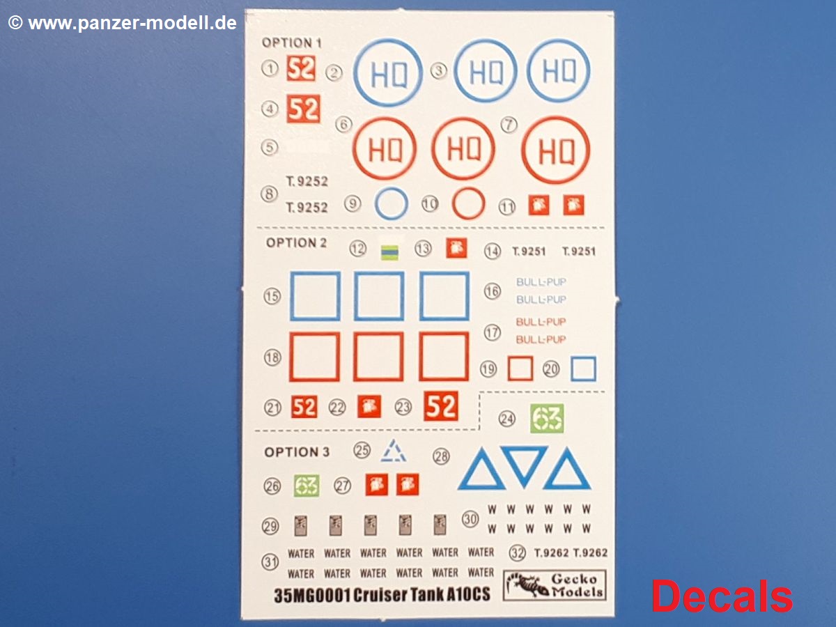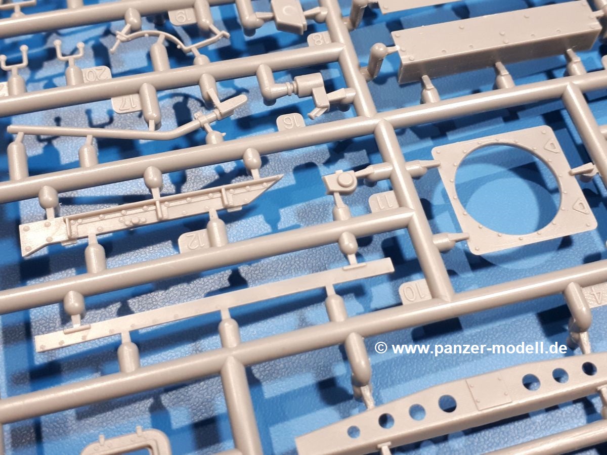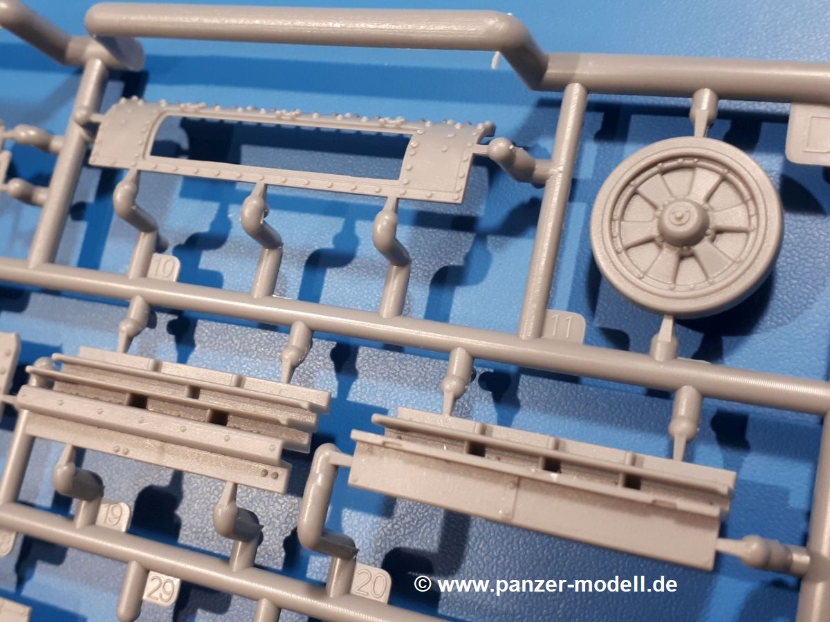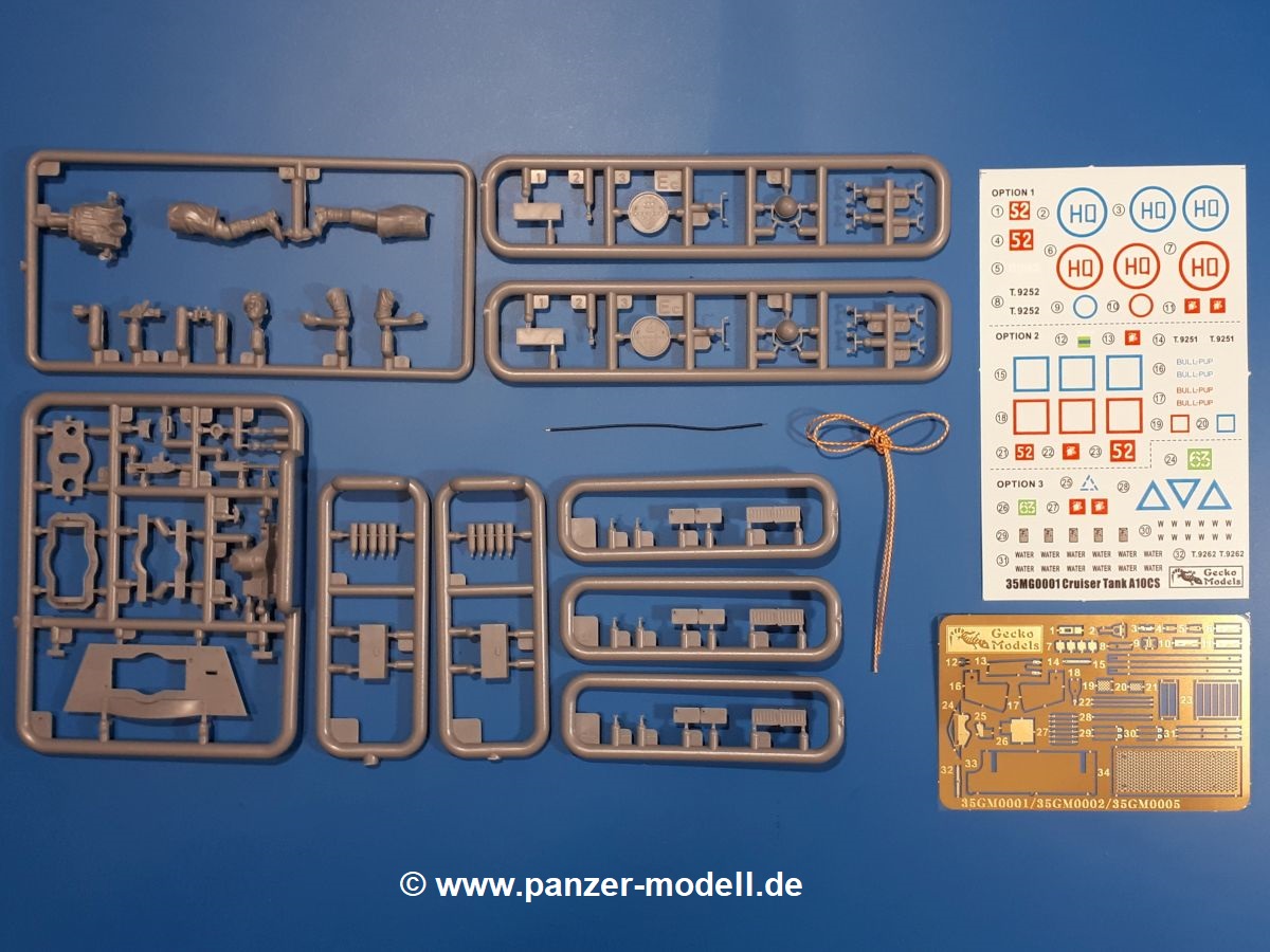 Das Original: In den 1930-er Jahren parallel zum Cruiser Mk. I (A9) entwickelt, war der A10 in der Rolle eines schweren Infanteriepanzers vorgesehen, die er aber nicht erfüllen konnte und deswegen als schwerer Kreuzerpanzer eingesetzt wurde. Es gab ihn in 3 Versionen - Mk. II (40mm 2-Pfünder Kanone, 1 koaxiales Vickers-MG), Mk. IIA (40mm 2-Pfünder Kanone, 1 koaxiales Besa-MG, 1 Besa Bug-MG) und Mk.IIA CS (94mm Howitzer, 1 koaxiales Besa-MG, 1 Besa Bug-MG). Mit seinem 150 PS Motor erreichte er grad mal 26 km/h auf der Strasse, 13 km/h im Gelände. Insgesamt wurden 175 Mk. II produziert. Er wurde Anfang des 2. Weltkrieges in Frankreich, später auch in Nordafrika und Griechenland eingesetzt. Er lieferte aber keine zufriedenstellenden Ergebnisse und wurde später durch den Cruiser Tank Mk. III (A13) ersetzt. Der Bausatz: Schon länger in der Vorankündigung kommen nun endlich die ersten Gecko Model Bausätze auch auf dem deutschen Markt an.Im Karton finden wir einen Klarsicht- und 35 hellgraue Spritzlinge. Dazu kommen Draht, Schnur, 1 Ätzteilplatine, ein Decalbogen und eine 28-seitige Bauanleitung.Die Verarbeitungsqualität ist hervorragend. Details wie z.B. Schrauben, Nieten, Schweißnähte und Bedienhebel fallen einem ebenso ins Auge wie die Schlieren freien, kristallklaren Scheinwerfergläser. Die Angüsse sind klein und gut zugänglich. Auswerferspuren sind, wo es geht auf den Gießästen zu finden, und sonst nur in geringer Anzahl auf den Teilen und an Stellen, die nach dem Zusammenbau nicht mehr ins Auge fallen. Zudem sind sie recht flach und gut zu entfernen, wenn man dies für nötig hält.Gleich vorweg - Gecko Models spendiert seinem A10 eine Inneneinrichtung für Fahrer-, Kampfraum und Turm. So besteht die Unterwanne aus Bodenplatte, Seitenteilen und Frontplatte, ausgestattet mit Details wie Wartungsdeckeln, Nieten und Lagerverschraubungen. Der Fahrerraum ist mit Fahrer-, Bug-MG Schützensitz und Bedienelementen wie Lenkhebel, Schaltung, Pedalen und Armaturentafel versehen. Das aus mehreren Teilen bestehende Bug-Mg samt Halterung kann beweglich in die Frontplatte eingebaut werden. Die Fahrersichtluke bietet die Option des offenen oder geschlossenen Anbaus. Die Trennwand im Rücken des Fahrers hat einen Durchlass zum Kampfraum. Im Kampfraum finden sich Halterungen mit insgesamt 10 Schuss 3,7 Zoll Haubitzen-Munition. Eine schön detaillierte Wand trennt Kampf- und Motorraum.Das Fahrgestell entspricht dem des Valentine - je Seite 2 große Lagerböcke, die die Rollenwagen mit je einem großen und 2 kleinen Laufrollen und ein Stützrad aufnehmen. Mittig zwischen den Lagerböcken findet man das 3. Stützrad. Lauf- und Stützrollen sind fein detailliert. Die Federbeine bestehen aus funktionsfähigen Plastikfedern. Das gesamte Fahrwerk ist beweglich ausgelegt, so dass man es z.B. an Bodenunebenheiten in einem Diorama anpassen kann. Dies wird durch die vollbewegliche Kette unterstützt, die sich aus Obergliedern mit Führungszähnen, Untergliedern und Endverbindern mit Kettenbolzen zusammensetzt. Es gibt eine Montagehilfe für den Bau der Kette. Der Getriebekasten am Heck hat eine separat anzubauende Wartungsklappe. Die Leitradlager mit der Kettenspannvorrichtung bestehen zwecks besserer Detaillierung aus mehreren Einzelteilen. Dies gilt auch für die Antriebszahnräder.Das große Oberteil muss im Fahrerbereich noch mit der Bugplatte und Seitenteilen ergänzt werden. Fahrer- und Bug-MG-Schützenluken können offen oder geschlossen, der Fahrerwinkelspiegel aus Klarsichtmaterial drehbar gebaut werden. Die Turmdrehringpanzerung besteht aus einem runden Teil mit vielen Nieten. Die großen Lufteinlässe links und rechts vom Motorraum werden zwecks besserer Detaillierung aus einzelnen Blechen zusammengesetzt. Die Motorraumklappen sind separat anzubringen. Ein schönes Teil ist der Auspuff. Dieser wird mit dem großen PE Gitter ummantelt und mit Zulauf- und Endrohr versehen. Er ruht in Halterungerungen aus PE-Teilen. Die Fahrscheinwerfer auf der Bugplatte können wahlweise mit Glaseinsatz oder Tarnscheibe gebaut werden. Die Zuleitungen der Scheinwerfer sind als Einzelteile dabei. Hier kommt auch der beiliegende Draht zum Einsatz.Die Kettenabdeckungen bestehen aus einem Guss. Auch wenn 4 Stück im Bausatz sind, benötigt man nur die zwei für die Griechenland, bzw. Nordafrika-Version. Große Staukästen müssen noch angebracht werden. Interessant ist, dass nur die linke Seite eine Kettenschürze besitzt. Ich konnte leider noch nicht herausfinden, warum dies so ist. Vorn auf der linken Kettenabdeckung wird der Außentank, wie wir ihn z.B. beim Matilda II oder auch beim Valentine wiederfinden. Er ruht auf mehrfach gewinkelten Halterungen, die mit PE-Teilen ergänzt werden. Das Außenbordwerkzeug beschränkt sich auf Schaufel, Spitzhacke und Stiel, einen Ratschenschlüssel (?) und eine Brechstange. Dazu gibt es noch kleine Feuerlöscher. Die Hupe wurde ebenso wenig vergessen wie der Fahrerspiegel. Auf der rechten, hinteren Kettenabdeckung gibt es eine Holzkiste mit einer schönen Maserung. Am Heck wird eine große Kanisterhalterung mit 6 Wasserkanistern angebracht. Die Ausgussstopfen sind winzig, aber separat anzubringen. Die Kanistergriffe bestehen aus PE.Der Bau des Turmes beginnt mit den Einzelteilen des Turmkorbes wie Bodenplatte, Stellmotor, Sitz und Behältern. Sämtliche Innenteile der 3,7 Zoll Haubitze wie Verschlussblock, Verschluss und Stelleinrichtung sind vorhanden. Ebenso findet man die Richtoptik und das koaxiale MG. Im Turmheck kommt ein schönes, mehrteiliges Funkgerät mit Schutzbügeln aus PE-Teilen zum Einsatz. Die Turmpanzerung besteht aus mehreren Teilen. Die Turmluken mit schönen Innendetails können offen oder geschlossen gebaut werden. Auch hier gibt einen Klarsicht-Winkelspiegel für den Kommandanten. Auch der Suchscheinwerfer wird mit einer Glasscheibe versehen. Lukenanschlag und Hilfsvisier des Kommandanten sind aus feinen Plastikteilen. Der Antennenfuß samt Antenne a