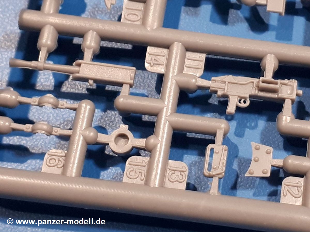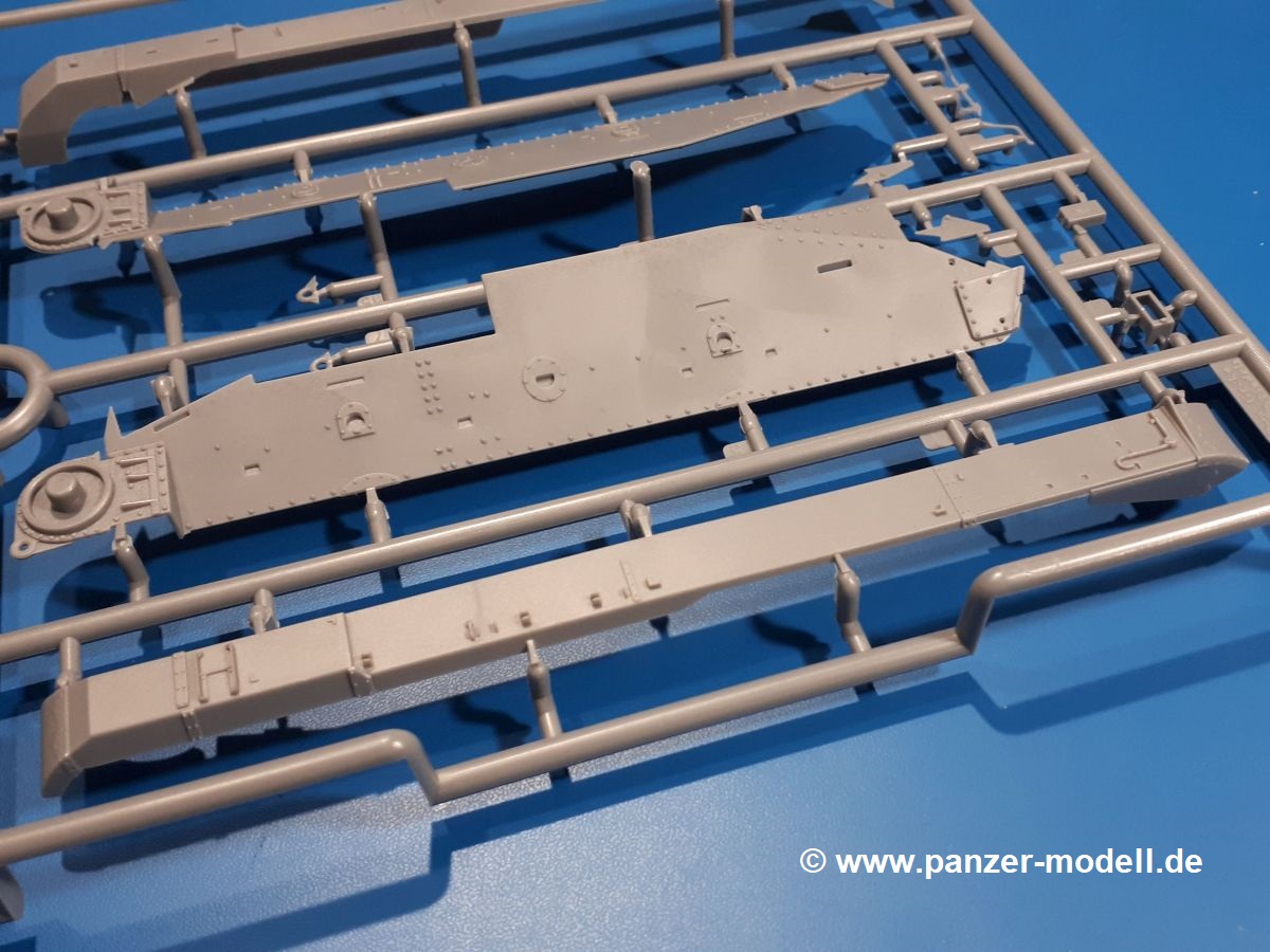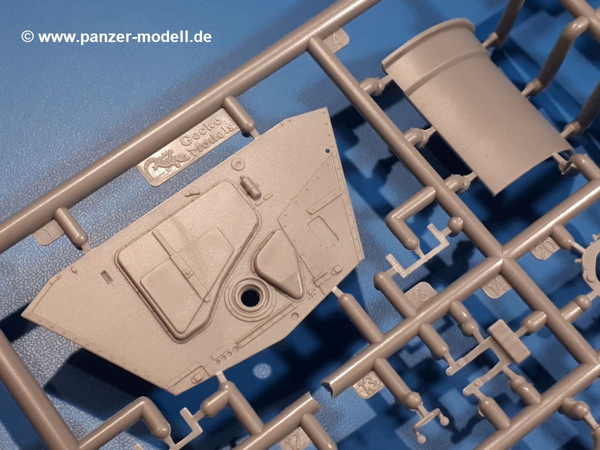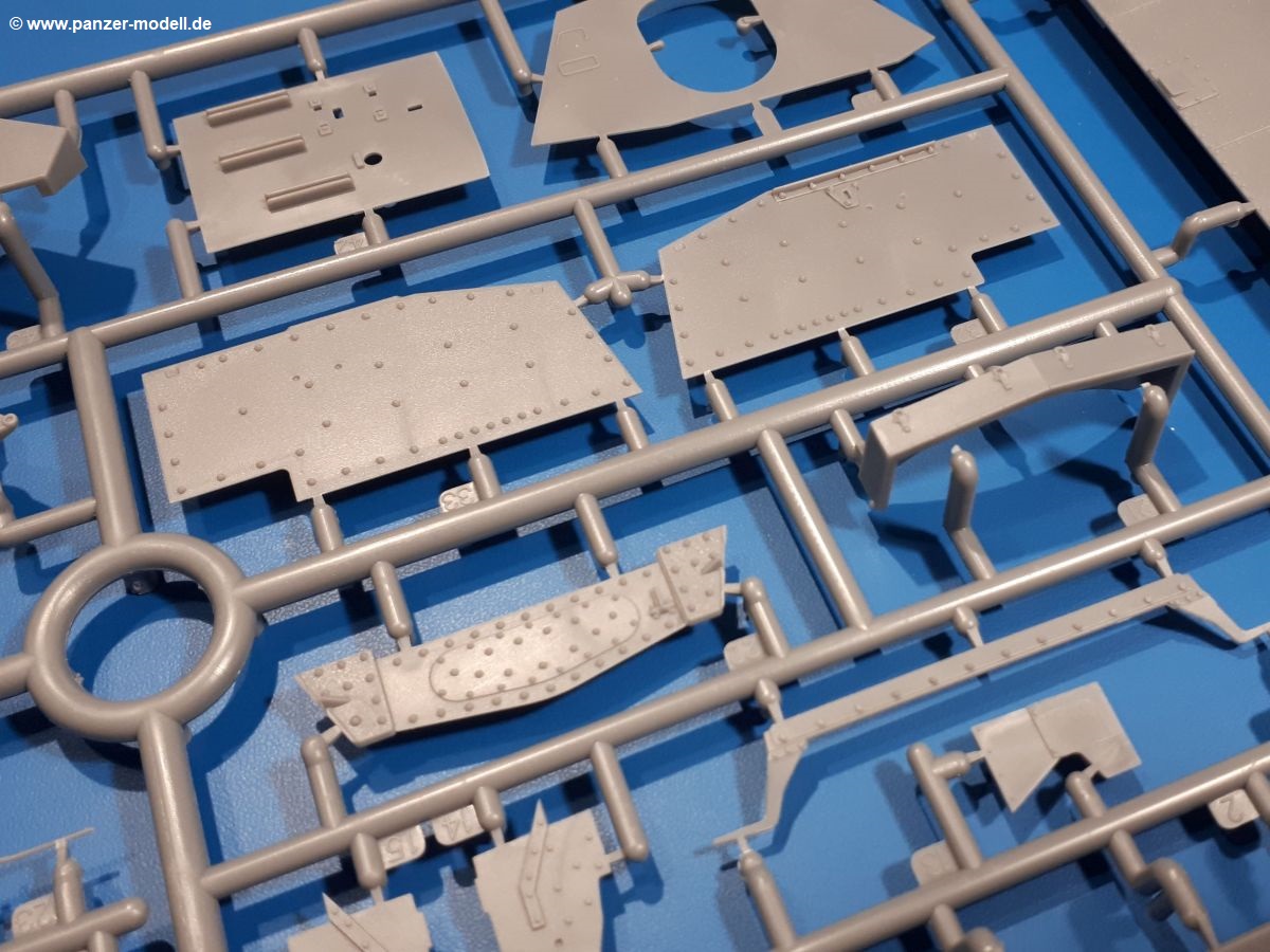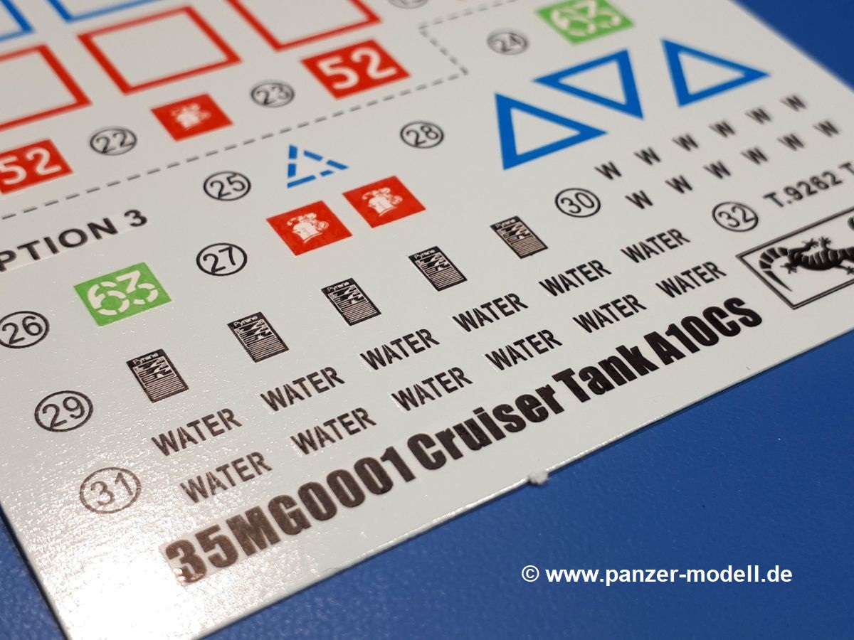 Das Original: In den 1930-er Jahren parallel zum Cruiser Mk. I (A9) entwickelt, war der A10 in der Rolle eines schweren Infanteriepanzers vorgesehen, die er aber nicht erfüllen konnte und deswegen als schwerer Kreuzerpanzer eingesetzt wurde. Es gab ihn in 3 Versionen - Mk. II (40mm 2-Pfünder Kanone, 1 koaxiales Vickers-MG), Mk. IIA (40mm 2-Pfünder Kanone, 1 koaxiales Besa-MG, 1 Besa Bug-MG) und Mk.IIA CS (94mm Howitzer, 1 koaxiales Besa-MG, 1 Besa Bug-MG). Mit seinem 150 PS Motor erreichte er grad mal 26 km/h auf der Strasse, 13 km/h im Gelände. Insgesamt wurden 175 Mk. II produziert. Er wurde Anfang des 2. Weltkrieges in Frankreich, später auch in Nordafrika und Griechenland eingesetzt. Er lieferte aber keine zufriedenstellenden Ergebnisse und wurde später durch den Cruiser Tank Mk. III (A13) ersetzt. Der Bausatz: Schon länger in der Vorankündigung kommen nun endlich die ersten Gecko Model Bausätze auch auf dem deutschen Markt an.Im Karton finden wir einen Klarsicht- und 35 hellgraue Spritzlinge. Dazu kommen Draht, Schnur, 1 Ätzteilplatine, ein Decalbogen und eine 28-seitige Bauanleitung.Die Verarbeitungsqualität ist hervorragend. Details wie z.B. Schrauben, Nieten, Schweißnähte und Bedienhebel fallen einem ebenso ins Auge wie die Schlieren freien, kristallklaren Scheinwerfergläser. Die Angüsse sind klein und gut zugänglich. Auswerferspuren sind, wo es geht auf den Gießästen zu finden, und sonst nur in geringer Anzahl auf den Teilen und an Stellen, die nach dem Zusammenbau nicht mehr ins Auge fallen. Zudem sind sie recht flach und gut zu entfernen, wenn man dies für nötig hält.Gleich vorweg - Gecko Models spendiert seinem A10 eine Inneneinrichtung für Fahrer-, Kampfraum und Turm. So besteht die Unterwanne aus Bodenplatte, Seitenteilen und Frontplatte, ausgestattet mit Details wie Wartungsdeckeln, Nieten und Lagerverschraubungen. Der Fahrerraum ist mit Fahrer-, Bug-MG Schützensitz und Bedienelementen wie Lenkhebel, Schaltung, Pedalen und Armaturentafel versehen. Das aus mehreren Teilen bestehende Bug-Mg samt Halterung kann beweglich in die Frontplatte eingebaut werden. Die Fahrersichtluke bietet die Option des offenen oder geschlossenen Anbaus. Die Trennwand im Rücken des Fahrers hat einen Durchlass zum Kampfraum. Im Kampfraum finden sich Halterungen mit insgesamt 10 Schuss 3,7 Zoll Haubitzen-Munition. Eine schön detaillierte Wand trennt Kampf- und Motorraum.Das Fahrgestell entspricht dem des Valentine - je Seite 2 große Lagerböcke, die die Rollenwagen mit je einem großen und 2 kleinen Laufrollen und ein Stützrad aufnehmen. Mittig zwischen den Lagerböcken findet man das 3. Stützrad. Lauf- und Stützrollen sind fein detailliert. Die Federbeine bestehen aus funktionsfähigen Plastikfedern. Das gesamte Fahrwerk ist beweglich ausgelegt, so dass man es z.B. an Bodenunebenheiten in einem Diorama anpassen kann. Dies wird durch die vollbewegliche Kette unterstützt, die sich aus Obergliedern mit Führungszähnen, Untergliedern und Endverbindern mit Kettenbolzen zusammensetzt. Es gibt eine Montagehilfe für den Bau der Kette. Der Getriebekasten am Heck hat eine separat anzubauende Wartungsklappe. Die Leitradlager mit der Kettenspannvorrichtung bestehen zwecks besserer Detaillierung aus mehreren Einzelteilen. Dies gilt auch für die Antriebszahnräder.Das große Oberteil muss im Fahrerbereich noch mit der Bugplatte und Seitenteilen ergänzt werden. Fahrer- und Bug-MG-Schützenluken können offen oder geschlossen, der Fahrerwinkelspiegel aus Klarsichtmaterial drehbar gebaut werden. Die Turmdrehringpanzerung besteht aus einem runden Teil mit vielen Nieten. Die großen Lufteinlässe links und rechts vom Motorraum werden zwecks besserer Detaillierung aus einzelnen Blechen zusammengesetzt. Die Motorraumklappen sind separat anzubringen. Ein schönes Teil ist der Auspuff. Dieser wird mit dem großen PE Gitter ummantelt und mit Zulauf- und Endrohr versehen. Er ruht in Halterungerungen aus PE-Teilen. Die Fahrscheinwerfer auf der Bugplatte können wahlweise mit Glaseinsatz oder Tarnscheibe gebaut werden. Die Zuleitungen der Scheinwerfer sind als Einzelteile dabei. Hier kommt auch der beiliegende Draht zum Einsatz.Die Kettenabdeckungen bestehen aus einem Guss. Auch wenn 4 Stück im Bausatz sind, benötigt man nur die zwei für die Griechenland, bzw. Nordafrika-Version. Große Staukästen müssen noch angebracht werden. Interessant ist, dass nur die linke Seite eine Kettenschürze besitzt. Ich konnte leider noch nicht herausfinden, warum dies so ist. Vorn auf der linken Kettenabdeckung wird der Außentank, wie wir ihn z.B. beim Matilda II oder auch beim Valentine wiederfinden. Er ruht auf mehrfach gewinkelten Halterungen, die mit PE-Teilen ergänzt werden. Das Außenbordwerkzeug beschränkt sich auf Schaufel, Spitzhacke und Stiel, einen Ratschenschlüssel (?) und eine Brechstange. Dazu gibt es noch kleine Feuerlöscher. Die Hupe wurde ebenso wenig vergessen wie der Fahrerspiegel. Auf der rechten, hinteren Kettenabdeckung gibt es eine Holzkiste mit einer schönen Maserung. Am Heck wird eine große Kanisterhalterung mit 6 Wasserkanistern angebracht. Die Ausgussstopfen sind winzig, aber separat anzubringen. Die Kanistergriffe bestehen aus PE.Der Bau des Turmes beginnt mit den Einzelteilen des Turmkorbes wie Bodenplatte, Stellmotor, Sitz und Behältern. Sämtliche Innenteile der 3,7 Zoll Haubitze wie Verschlussblock, Verschluss und Stelleinrichtung sind vorhanden. Ebenso findet man die Richtoptik und das koaxiale MG. Im Turmheck kommt ein schönes, mehrteiliges Funkgerät mit Schutzbügeln aus PE-Teilen zum Einsatz. Die Turmpanzerung besteht aus mehreren Teilen. Die Turmluken mit schönen Innendetails können offen oder geschlossen gebaut werden. Auch hier gibt einen Klarsicht-Winkelspiegel für den Kommandanten. Auch der Suchscheinwerfer wird mit einer Glasscheibe versehen. Lukenanschlag und Hilfsvisier des Kommandanten sind aus feinen Plastikteilen. Der Antennenfuß samt Antenne a