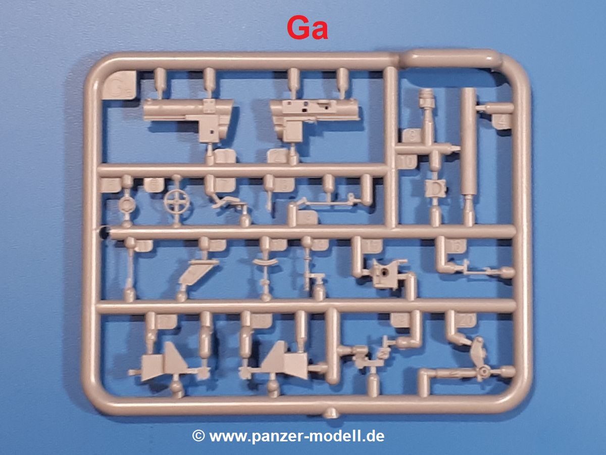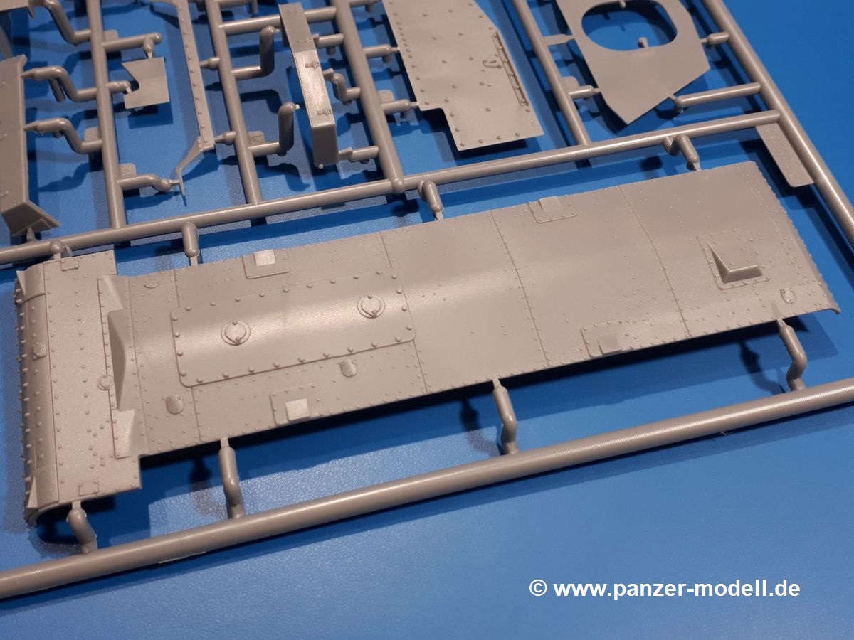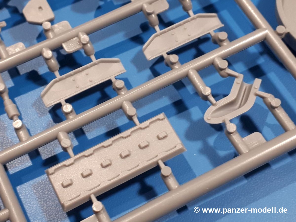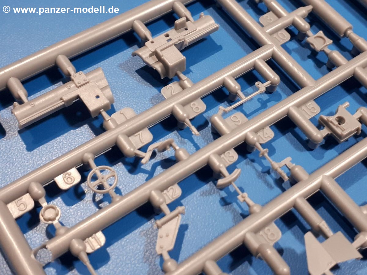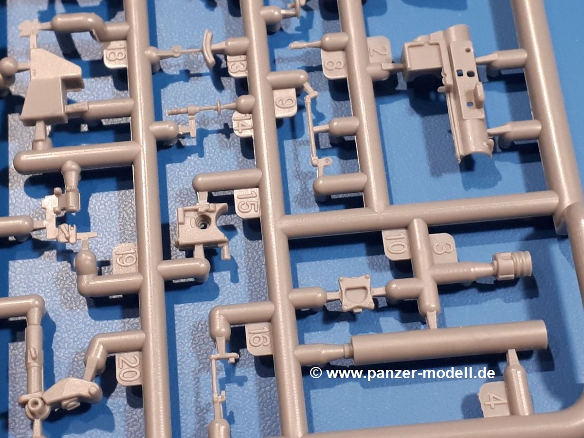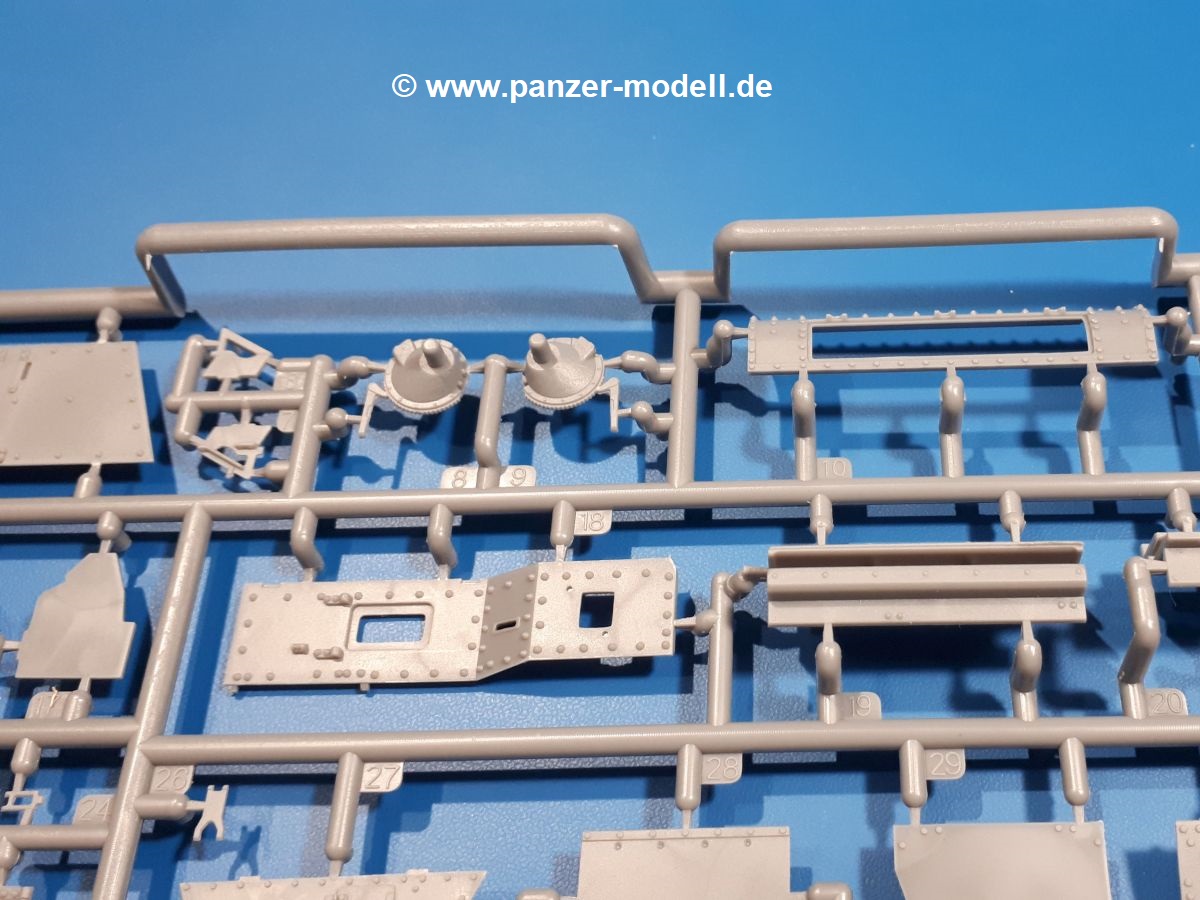 Das Original: In den 1930-er Jahren parallel zum Cruiser Mk. I (A9) entwickelt, war der A10 in der Rolle eines schweren Infanteriepanzers vorgesehen, die er aber nicht erfüllen konnte und deswegen als schwerer Kreuzerpanzer eingesetzt wurde. Es gab ihn in 3 Versionen - Mk. II (40mm 2-Pfünder Kanone, 1 koaxiales Vickers-MG), Mk. IIA (40mm 2-Pfünder Kanone, 1 koaxiales Besa-MG, 1 Besa Bug-MG) und Mk.IIA CS (94mm Howitzer, 1 koaxiales Besa-MG, 1 Besa Bug-MG). Mit seinem 150 PS Motor erreichte er grad mal 26 km/h auf der Strasse, 13 km/h im Gelände. Insgesamt wurden 175 Mk. II produziert. Er wurde Anfang des 2. Weltkrieges in Frankreich, später auch in Nordafrika und Griechenland eingesetzt. Er lieferte aber keine zufriedenstellenden Ergebnisse und wurde später durch den Cruiser Tank Mk. III (A13) ersetzt. Der Bausatz: Schon länger in der Vorankündigung kommen nun endlich die ersten Gecko Model Bausätze auch auf dem deutschen Markt an.Im Karton finden wir einen Klarsicht- und 35 hellgraue Spritzlinge. Dazu kommen Draht, Schnur, 1 Ätzteilplatine, ein Decalbogen und eine 28-seitige Bauanleitung.Die Verarbeitungsqualität ist hervorragend. Details wie z.B. Schrauben, Nieten, Schweißnähte und Bedienhebel fallen einem ebenso ins Auge wie die Schlieren freien, kristallklaren Scheinwerfergläser. Die Angüsse sind klein und gut zugänglich. Auswerferspuren sind, wo es geht auf den Gießästen zu finden, und sonst nur in geringer Anzahl auf den Teilen und an Stellen, die nach dem Zusammenbau nicht mehr ins Auge fallen. Zudem sind sie recht flach und gut zu entfernen, wenn man dies für nötig hält.Gleich vorweg - Gecko Models spendiert seinem A10 eine Inneneinrichtung für Fahrer-, Kampfraum und Turm. So besteht die Unterwanne aus Bodenplatte, Seitenteilen und Frontplatte, ausgestattet mit Details wie Wartungsdeckeln, Nieten und Lagerverschraubungen. Der Fahrerraum ist mit Fahrer-, Bug-MG Schützensitz und Bedienelementen wie Lenkhebel, Schaltung, Pedalen und Armaturentafel versehen. Das aus mehreren Teilen bestehende Bug-Mg samt Halterung kann beweglich in die Frontplatte eingebaut werden. Die Fahrersichtluke bietet die Option des offenen oder geschlossenen Anbaus. Die Trennwand im Rücken des Fahrers hat einen Durchlass zum Kampfraum. Im Kampfraum finden sich Halterungen mit insgesamt 10 Schuss 3,7 Zoll Haubitzen-Munition. Eine schön detaillierte Wand trennt Kampf- und Motorraum.Das Fahrgestell entspricht dem des Valentine - je Seite 2 große Lagerböcke, die die Rollenwagen mit je einem großen und 2 kleinen Laufrollen und ein Stützrad aufnehmen. Mittig zwischen den Lagerböcken findet man das 3. Stützrad. Lauf- und Stützrollen sind fein detailliert. Die Federbeine bestehen aus funktionsfähigen Plastikfedern. Das gesamte Fahrwerk ist beweglich ausgelegt, so dass man es z.B. an Bodenunebenheiten in einem Diorama anpassen kann. Dies wird durch die vollbewegliche Kette unterstützt, die sich aus Obergliedern mit Führungszähnen, Untergliedern und Endverbindern mit Kettenbolzen zusammensetzt. Es gibt eine Montagehilfe für den Bau der Kette. Der Getriebekasten am Heck hat eine separat anzubauende Wartungsklappe. Die Leitradlager mit der Kettenspannvorrichtung bestehen zwecks besserer Detaillierung aus mehreren Einzelteilen. Dies gilt auch für die Antriebszahnräder.Das große Oberteil muss im Fahrerbereich noch mit der Bugplatte und Seitenteilen ergänzt werden. Fahrer- und Bug-MG-Schützenluken können offen oder geschlossen, der Fahrerwinkelspiegel aus Klarsichtmaterial drehbar gebaut werden. Die Turmdrehringpanzerung besteht aus einem runden Teil mit vielen Nieten. Die großen Lufteinlässe links und rechts vom Motorraum werden zwecks besserer Detaillierung aus einzelnen Blechen zusammengesetzt. Die Motorraumklappen sind separat anzubringen. Ein schönes Teil ist der Auspuff. Dieser wird mit dem großen PE Gitter ummantelt und mit Zulauf- und Endrohr versehen. Er ruht in Halterungerungen aus PE-Teilen. Die Fahrscheinwerfer auf der Bugplatte können wahlweise mit Glaseinsatz oder Tarnscheibe gebaut werden. Die Zuleitungen der Scheinwerfer sind als Einzelteile dabei. Hier kommt auch der beiliegende Draht zum Einsatz.Die Kettenabdeckungen bestehen aus einem Guss. Auch wenn 4 Stück im Bausatz sind, benötigt man nur die zwei für die Griechenland, bzw. Nordafrika-Version. Große Staukästen müssen noch angebracht werden. Interessant ist, dass nur die linke Seite eine Kettenschürze besitzt. Ich konnte leider noch nicht herausfinden, warum dies so ist. Vorn auf der linken Kettenabdeckung wird der Außentank, wie wir ihn z.B. beim Matilda II oder auch beim Valentine wiederfinden. Er ruht auf mehrfach gewinkelten Halterungen, die mit PE-Teilen ergänzt werden. Das Außenbordwerkzeug beschränkt sich auf Schaufel, Spitzhacke und Stiel, einen Ratschenschlüssel (?) und eine Brechstange. Dazu gibt es noch kleine Feuerlöscher. Die Hupe wurde ebenso wenig vergessen wie der Fahrerspiegel. Auf der rechten, hinteren Kettenabdeckung gibt es eine Holzkiste mit einer schönen Maserung. Am Heck wird eine große Kanisterhalterung mit 6 Wasserkanistern angebracht. Die Ausgussstopfen sind winzig, aber separat anzubringen. Die Kanistergriffe bestehen aus PE.Der Bau des Turmes beginnt mit den Einzelteilen des Turmkorbes wie Bodenplatte, Stellmotor, Sitz und Behältern. Sämtliche Innenteile der 3,7 Zoll Haubitze wie Verschlussblock, Verschluss und Stelleinrichtung sind vorhanden. Ebenso findet man die Richtoptik und das koaxiale MG. Im Turmheck kommt ein schönes, mehrteiliges Funkgerät mit Schutzbügeln aus PE-Teilen zum Einsatz. Die Turmpanzerung besteht aus mehreren Teilen. Die Turmluken mit schönen Innendetails können offen oder geschlossen gebaut werden. Auch hier gibt einen Klarsicht-Winkelspiegel für den Kommandanten. Auch der Suchscheinwerfer wird mit einer Glasscheibe versehen. Lukenanschlag und Hilfsvisier des Kommandanten sind aus feinen Plastikteilen. Der Antennenfuß samt Antenne a