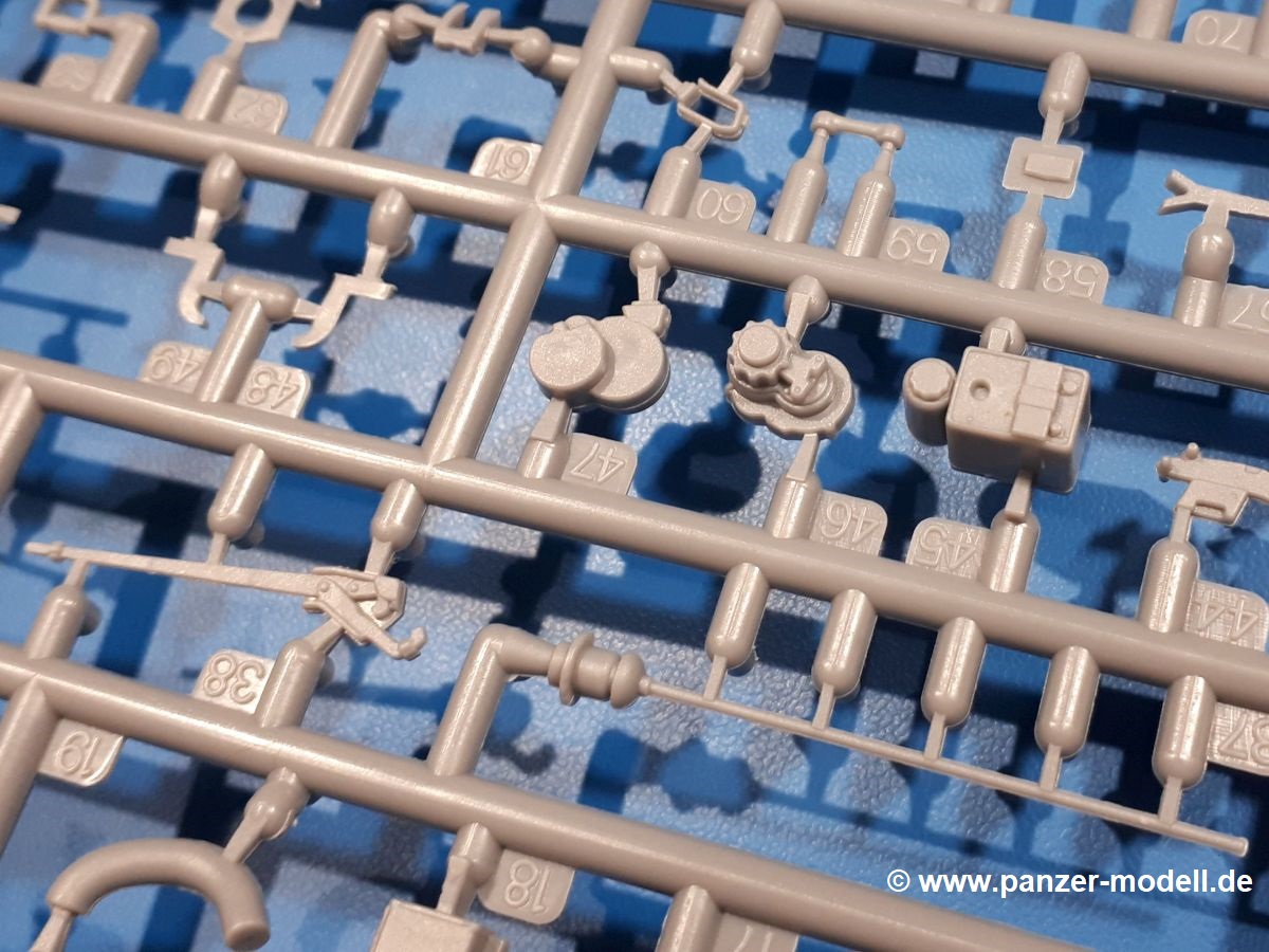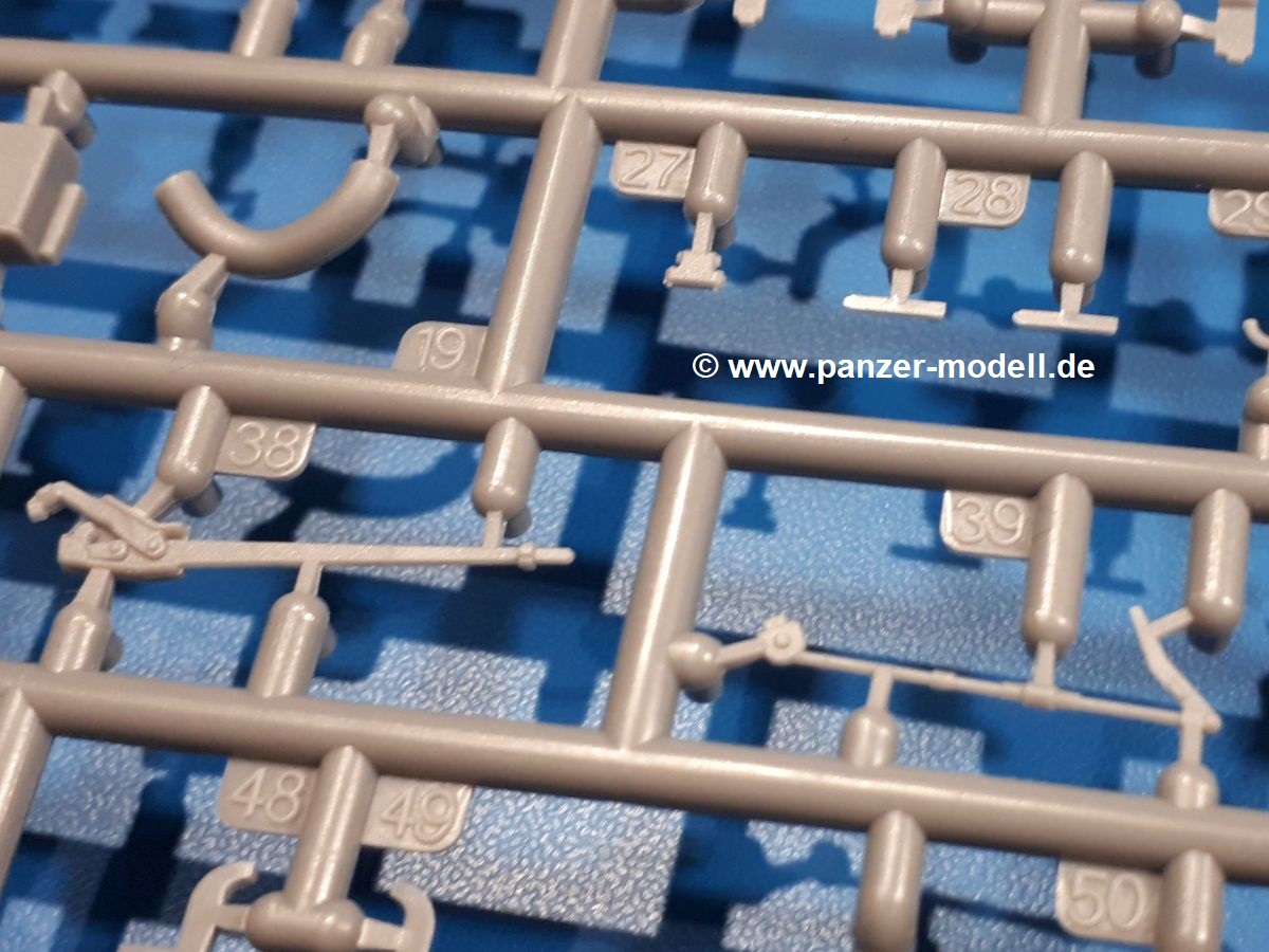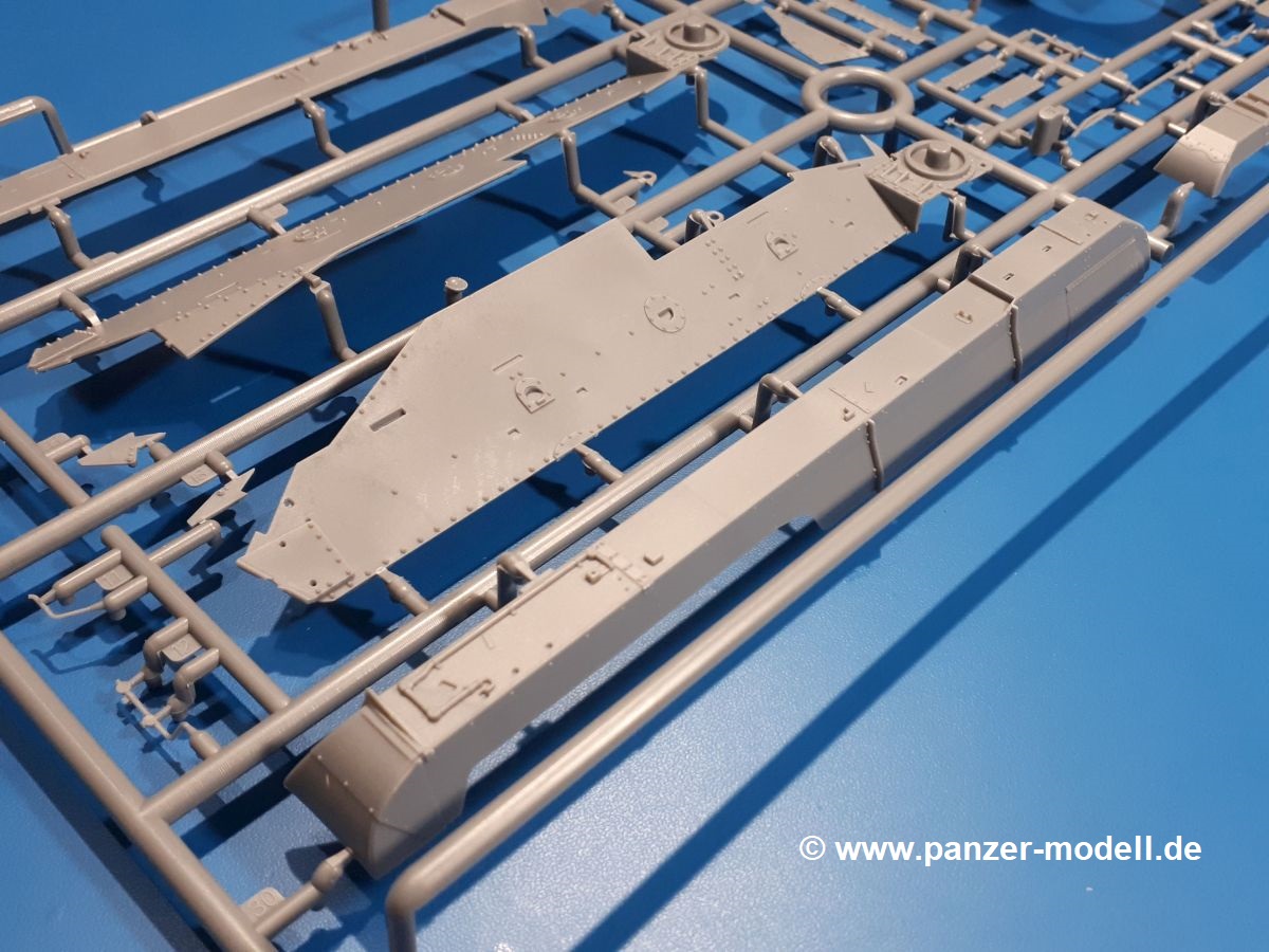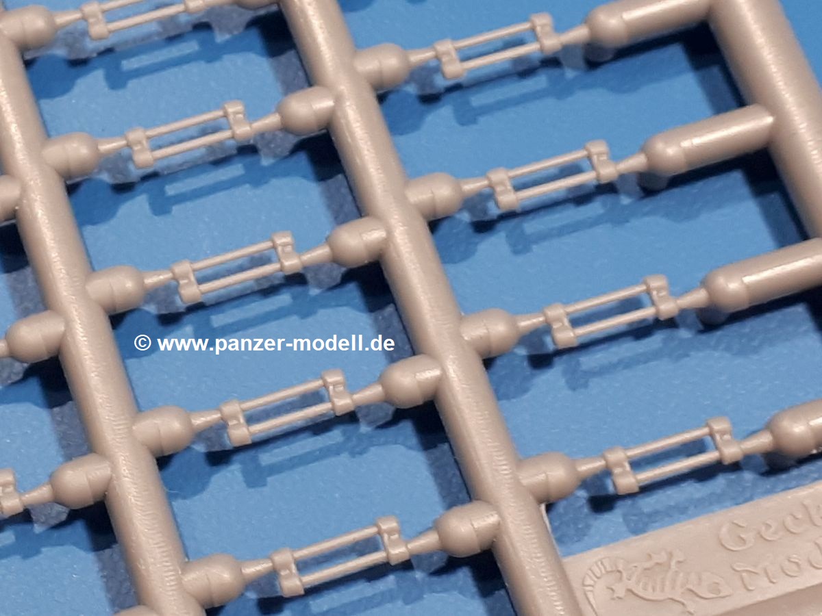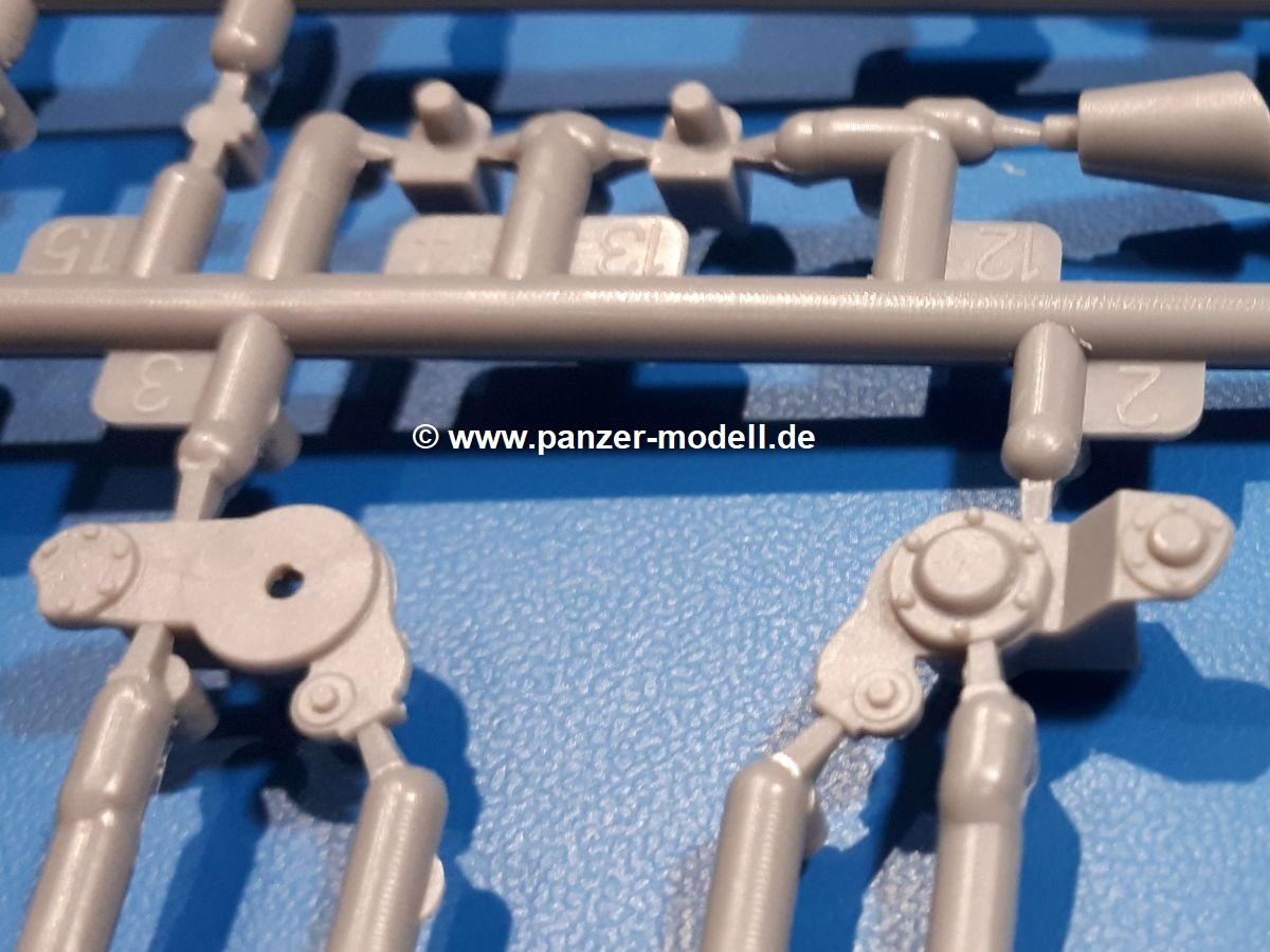 Das Original: In den 1930-er Jahren parallel zum Cruiser Mk. I (A9) entwickelt, war der A10 in der Rolle eines schweren Infanteriepanzers vorgesehen, die er aber nicht erfüllen konnte und deswegen als schwerer Kreuzerpanzer eingesetzt wurde. Es gab ihn in 3 Versionen - Mk. II (40mm 2-Pfünder Kanone, 1 koaxiales Vickers-MG), Mk. IIA (40mm 2-Pfünder Kanone, 1 koaxiales Besa-MG, 1 Besa Bug-MG) und Mk.IIA CS (94mm Howitzer, 1 koaxiales Besa-MG, 1 Besa Bug-MG). Mit seinem 150 PS Motor erreichte er grad mal 26 km/h auf der Strasse, 13 km/h im Gelände. Insgesamt wurden 175 Mk. II produziert. Er wurde Anfang des 2. Weltkrieges in Frankreich, später auch in Nordafrika und Griechenland eingesetzt. Er lieferte aber keine zufriedenstellenden Ergebnisse und wurde später durch den Cruiser Tank Mk. III (A13) ersetzt. Der Bausatz: Schon länger in der Vorankündigung kommen nun endlich die ersten Gecko Model Bausätze auch auf dem deutschen Markt an.Im Karton finden wir einen Klarsicht- und 35 hellgraue Spritzlinge. Dazu kommen Draht, Schnur, 1 Ätzteilplatine, ein Decalbogen und eine 28-seitige Bauanleitung.Die Verarbeitungsqualität ist hervorragend. Details wie z.B. Schrauben, Nieten, Schweißnähte und Bedienhebel fallen einem ebenso ins Auge wie die Schlieren freien, kristallklaren Scheinwerfergläser. Die Angüsse sind klein und gut zugänglich. Auswerferspuren sind, wo es geht auf den Gießästen zu finden, und sonst nur in geringer Anzahl auf den Teilen und an Stellen, die nach dem Zusammenbau nicht mehr ins Auge fallen. Zudem sind sie recht flach und gut zu entfernen, wenn man dies für nötig hält.Gleich vorweg - Gecko Models spendiert seinem A10 eine Inneneinrichtung für Fahrer-, Kampfraum und Turm. So besteht die Unterwanne aus Bodenplatte, Seitenteilen und Frontplatte, ausgestattet mit Details wie Wartungsdeckeln, Nieten und Lagerverschraubungen. Der Fahrerraum ist mit Fahrer-, Bug-MG Schützensitz und Bedienelementen wie Lenkhebel, Schaltung, Pedalen und Armaturentafel versehen. Das aus mehreren Teilen bestehende Bug-Mg samt Halterung kann beweglich in die Frontplatte eingebaut werden. Die Fahrersichtluke bietet die Option des offenen oder geschlossenen Anbaus. Die Trennwand im Rücken des Fahrers hat einen Durchlass zum Kampfraum. Im Kampfraum finden sich Halterungen mit insgesamt 10 Schuss 3,7 Zoll Haubitzen-Munition. Eine schön detaillierte Wand trennt Kampf- und Motorraum.Das Fahrgestell entspricht dem des Valentine - je Seite 2 große Lagerböcke, die die Rollenwagen mit je einem großen und 2 kleinen Laufrollen und ein Stützrad aufnehmen. Mittig zwischen den Lagerböcken findet man das 3. Stützrad. Lauf- und Stützrollen sind fein detailliert. Die Federbeine bestehen aus funktionsfähigen Plastikfedern. Das gesamte Fahrwerk ist beweglich ausgelegt, so dass man es z.B. an Bodenunebenheiten in einem Diorama anpassen kann. Dies wird durch die vollbewegliche Kette unterstützt, die sich aus Obergliedern mit Führungszähnen, Untergliedern und Endverbindern mit Kettenbolzen zusammensetzt. Es gibt eine Montagehilfe für den Bau der Kette. Der Getriebekasten am Heck hat eine separat anzubauende Wartungsklappe. Die Leitradlager mit der Kettenspannvorrichtung bestehen zwecks besserer Detaillierung aus mehreren Einzelteilen. Dies gilt auch für die Antriebszahnräder.Das große Oberteil muss im Fahrerbereich noch mit der Bugplatte und Seitenteilen ergänzt werden. Fahrer- und Bug-MG-Schützenluken können offen oder geschlossen, der Fahrerwinkelspiegel aus Klarsichtmaterial drehbar gebaut werden. Die Turmdrehringpanzerung besteht aus einem runden Teil mit vielen Nieten. Die großen Lufteinlässe links und rechts vom Motorraum werden zwecks besserer Detaillierung aus einzelnen Blechen zusammengesetzt. Die Motorraumklappen sind separat anzubringen. Ein schönes Teil ist der Auspuff. Dieser wird mit dem großen PE Gitter ummantelt und mit Zulauf- und Endrohr versehen. Er ruht in Halterungerungen aus PE-Teilen. Die Fahrscheinwerfer auf der Bugplatte können wahlweise mit Glaseinsatz oder Tarnscheibe gebaut werden. Die Zuleitungen der Scheinwerfer sind als Einzelteile dabei. Hier kommt auch der beiliegende Draht zum Einsatz.Die Kettenabdeckungen bestehen aus einem Guss. Auch wenn 4 Stück im Bausatz sind, benötigt man nur die zwei für die Griechenland, bzw. Nordafrika-Version. Große Staukästen müssen noch angebracht werden. Interessant ist, dass nur die linke Seite eine Kettenschürze besitzt. Ich konnte leider noch nicht herausfinden, warum dies so ist. Vorn auf der linken Kettenabdeckung wird der Außentank, wie wir ihn z.B. beim Matilda II oder auch beim Valentine wiederfinden. Er ruht auf mehrfach gewinkelten Halterungen, die mit PE-Teilen ergänzt werden. Das Außenbordwerkzeug beschränkt sich auf Schaufel, Spitzhacke und Stiel, einen Ratschenschlüssel (?) und eine Brechstange. Dazu gibt es noch kleine Feuerlöscher. Die Hupe wurde ebenso wenig vergessen wie der Fahrerspiegel. Auf der rechten, hinteren Kettenabdeckung gibt es eine Holzkiste mit einer schönen Maserung. Am Heck wird eine große Kanisterhalterung mit 6 Wasserkanistern angebracht. Die Ausgussstopfen sind winzig, aber separat anzubringen. Die Kanistergriffe bestehen aus PE.Der Bau des Turmes beginnt mit den Einzelteilen des Turmkorbes wie Bodenplatte, Stellmotor, Sitz und Behältern. Sämtliche Innenteile der 3,7 Zoll Haubitze wie Verschlussblock, Verschluss und Stelleinrichtung sind vorhanden. Ebenso findet man die Richtoptik und das koaxiale MG. Im Turmheck kommt ein schönes, mehrteiliges Funkgerät mit Schutzbügeln aus PE-Teilen zum Einsatz. Die Turmpanzerung besteht aus mehreren Teilen. Die Turmluken mit schönen Innendetails können offen oder geschlossen gebaut werden. Auch hier gibt einen Klarsicht-Winkelspiegel für den Kommandanten. Auch der Suchscheinwerfer wird mit einer Glasscheibe versehen. Lukenanschlag und Hilfsvisier des Kommandanten sind aus feinen Plastikteilen. Der Antennenfuß samt Antenne a