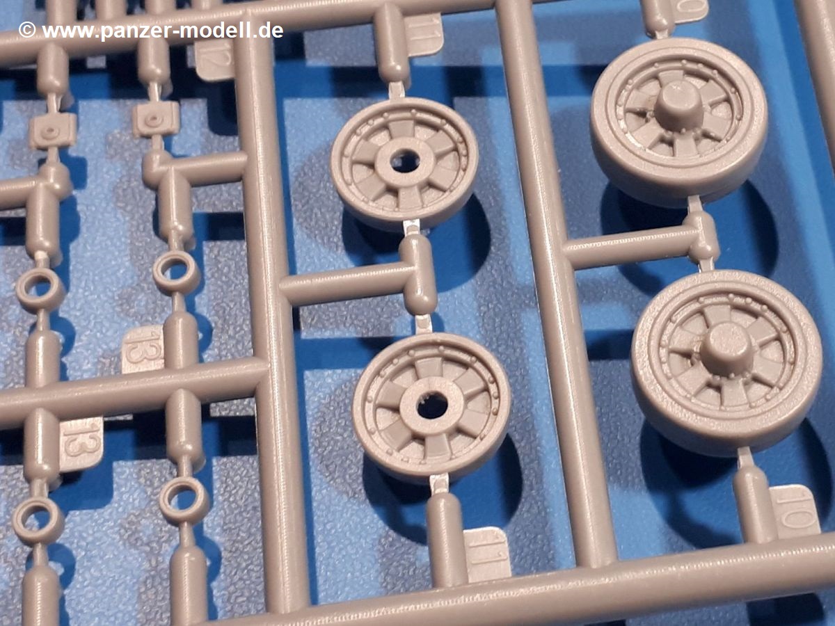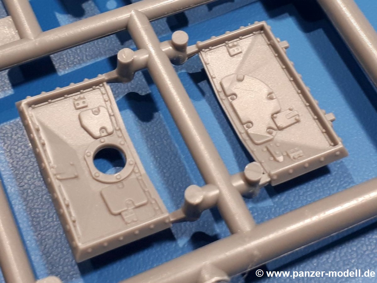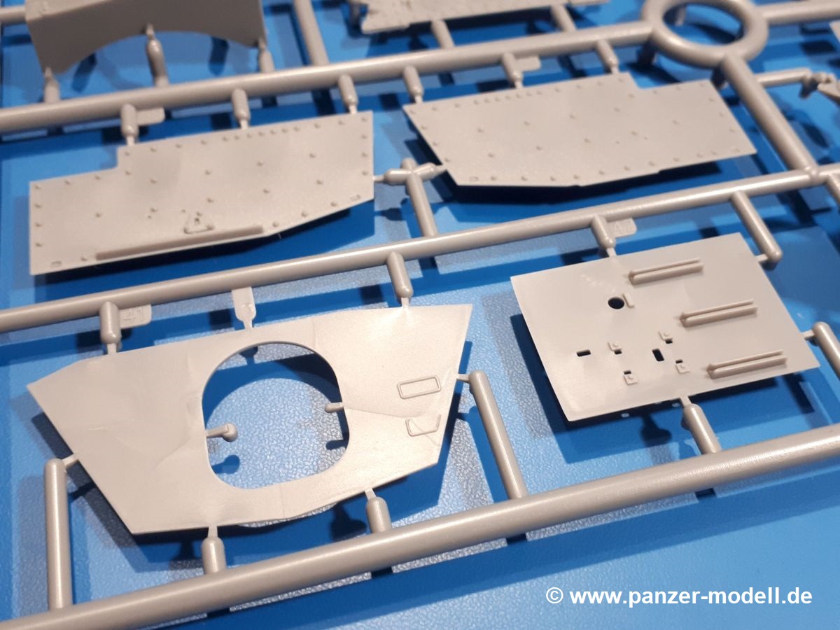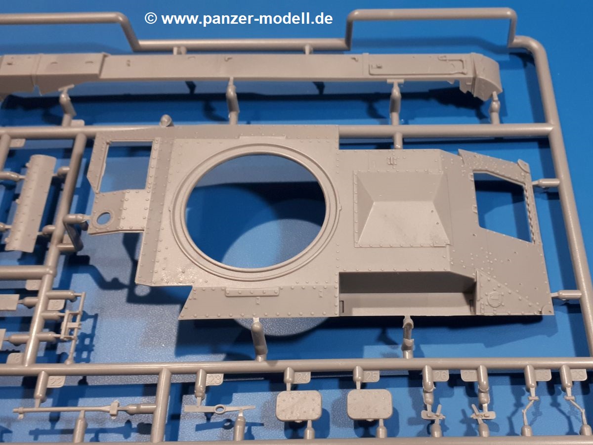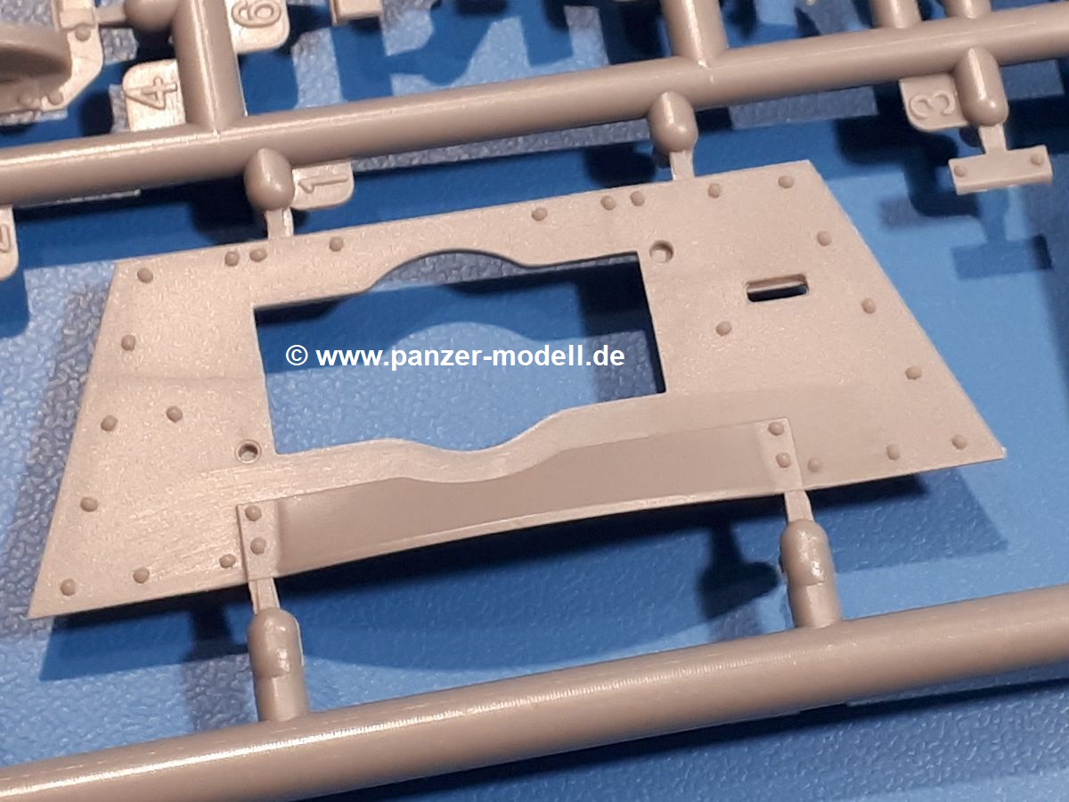 Das Original: In den 1930-er Jahren parallel zum Cruiser Mk. I (A9) entwickelt, war der A10 in der Rolle eines schweren Infanteriepanzers vorgesehen, die er aber nicht erfüllen konnte und deswegen als schwerer Kreuzerpanzer eingesetzt wurde. Es gab ihn in 3 Versionen - Mk. II (40mm 2-Pfünder Kanone, 1 koaxiales Vickers-MG), Mk. IIA (40mm 2-Pfünder Kanone, 1 koaxiales Besa-MG, 1 Besa Bug-MG) und Mk.IIA CS (94mm Howitzer, 1 koaxiales Besa-MG, 1 Besa Bug-MG). Mit seinem 150 PS Motor erreichte er grad mal 26 km/h auf der Strasse, 13 km/h im Gelände. Insgesamt wurden 175 Mk. II produziert. Er wurde Anfang des 2. Weltkrieges in Frankreich, später auch in Nordafrika und Griechenland eingesetzt. Er lieferte aber keine zufriedenstellenden Ergebnisse und wurde später durch den Cruiser Tank Mk. III (A13) ersetzt. Der Bausatz: Schon länger in der Vorankündigung kommen nun endlich die ersten Gecko Model Bausätze auch auf dem deutschen Markt an.Im Karton finden wir einen Klarsicht- und 35 hellgraue Spritzlinge. Dazu kommen Draht, Schnur, 1 Ätzteilplatine, ein Decalbogen und eine 28-seitige Bauanleitung.Die Verarbeitungsqualität ist hervorragend. Details wie z.B. Schrauben, Nieten, Schweißnähte und Bedienhebel fallen einem ebenso ins Auge wie die Schlieren freien, kristallklaren Scheinwerfergläser. Die Angüsse sind klein und gut zugänglich. Auswerferspuren sind, wo es geht auf den Gießästen zu finden, und sonst nur in geringer Anzahl auf den Teilen und an Stellen, die nach dem Zusammenbau nicht mehr ins Auge fallen. Zudem sind sie recht flach und gut zu entfernen, wenn man dies für nötig hält.Gleich vorweg - Gecko Models spendiert seinem A10 eine Inneneinrichtung für Fahrer-, Kampfraum und Turm. So besteht die Unterwanne aus Bodenplatte, Seitenteilen und Frontplatte, ausgestattet mit Details wie Wartungsdeckeln, Nieten und Lagerverschraubungen. Der Fahrerraum ist mit Fahrer-, Bug-MG Schützensitz und Bedienelementen wie Lenkhebel, Schaltung, Pedalen und Armaturentafel versehen. Das aus mehreren Teilen bestehende Bug-Mg samt Halterung kann beweglich in die Frontplatte eingebaut werden. Die Fahrersichtluke bietet die Option des offenen oder geschlossenen Anbaus. Die Trennwand im Rücken des Fahrers hat einen Durchlass zum Kampfraum. Im Kampfraum finden sich Halterungen mit insgesamt 10 Schuss 3,7 Zoll Haubitzen-Munition. Eine schön detaillierte Wand trennt Kampf- und Motorraum.Das Fahrgestell entspricht dem des Valentine - je Seite 2 große Lagerböcke, die die Rollenwagen mit je einem großen und 2 kleinen Laufrollen und ein Stützrad aufnehmen. Mittig zwischen den Lagerböcken findet man das 3. Stützrad. Lauf- und Stützrollen sind fein detailliert. Die Federbeine bestehen aus funktionsfähigen Plastikfedern. Das gesamte Fahrwerk ist beweglich ausgelegt, so dass man es z.B. an Bodenunebenheiten in einem Diorama anpassen kann. Dies wird durch die vollbewegliche Kette unterstützt, die sich aus Obergliedern mit Führungszähnen, Untergliedern und Endverbindern mit Kettenbolzen zusammensetzt. Es gibt eine Montagehilfe für den Bau der Kette. Der Getriebekasten am Heck hat eine separat anzubauende Wartungsklappe. Die Leitradlager mit der Kettenspannvorrichtung bestehen zwecks besserer Detaillierung aus mehreren Einzelteilen. Dies gilt auch für die Antriebszahnräder.Das große Oberteil muss im Fahrerbereich noch mit der Bugplatte und Seitenteilen ergänzt werden. Fahrer- und Bug-MG-Schützenluken können offen oder geschlossen, der Fahrerwinkelspiegel aus Klarsichtmaterial drehbar gebaut werden. Die Turmdrehringpanzerung besteht aus einem runden Teil mit vielen Nieten. Die großen Lufteinlässe links und rechts vom Motorraum werden zwecks besserer Detaillierung aus einzelnen Blechen zusammengesetzt. Die Motorraumklappen sind separat anzubringen. Ein schönes Teil ist der Auspuff. Dieser wird mit dem großen PE Gitter ummantelt und mit Zulauf- und Endrohr versehen. Er ruht in Halterungerungen aus PE-Teilen. Die Fahrscheinwerfer auf der Bugplatte können wahlweise mit Glaseinsatz oder Tarnscheibe gebaut werden. Die Zuleitungen der Scheinwerfer sind als Einzelteile dabei. Hier kommt auch der beiliegende Draht zum Einsatz.Die Kettenabdeckungen bestehen aus einem Guss. Auch wenn 4 Stück im Bausatz sind, benötigt man nur die zwei für die Griechenland, bzw. Nordafrika-Version. Große Staukästen müssen noch angebracht werden. Interessant ist, dass nur die linke Seite eine Kettenschürze besitzt. Ich konnte leider noch nicht herausfinden, warum dies so ist. Vorn auf der linken Kettenabdeckung wird der Außentank, wie wir ihn z.B. beim Matilda II oder auch beim Valentine wiederfinden. Er ruht auf mehrfach gewinkelten Halterungen, die mit PE-Teilen ergänzt werden. Das Außenbordwerkzeug beschränkt sich auf Schaufel, Spitzhacke und Stiel, einen Ratschenschlüssel (?) und eine Brechstange. Dazu gibt es noch kleine Feuerlöscher. Die Hupe wurde ebenso wenig vergessen wie der Fahrerspiegel. Auf der rechten, hinteren Kettenabdeckung gibt es eine Holzkiste mit einer schönen Maserung. Am Heck wird eine große Kanisterhalterung mit 6 Wasserkanistern angebracht. Die Ausgussstopfen sind winzig, aber separat anzubringen. Die Kanistergriffe bestehen aus PE.Der Bau des Turmes beginnt mit den Einzelteilen des Turmkorbes wie Bodenplatte, Stellmotor, Sitz und Behältern. Sämtliche Innenteile der 3,7 Zoll Haubitze wie Verschlussblock, Verschluss und Stelleinrichtung sind vorhanden. Ebenso findet man die Richtoptik und das koaxiale MG. Im Turmheck kommt ein schönes, mehrteiliges Funkgerät mit Schutzbügeln aus PE-Teilen zum Einsatz. Die Turmpanzerung besteht aus mehreren Teilen. Die Turmluken mit schönen Innendetails können offen oder geschlossen gebaut werden. Auch hier gibt einen Klarsicht-Winkelspiegel für den Kommandanten. Auch der Suchscheinwerfer wird mit einer Glasscheibe versehen. Lukenanschlag und Hilfsvisier des Kommandanten sind aus feinen Plastikteilen. Der Antennenfuß samt Antenne a
