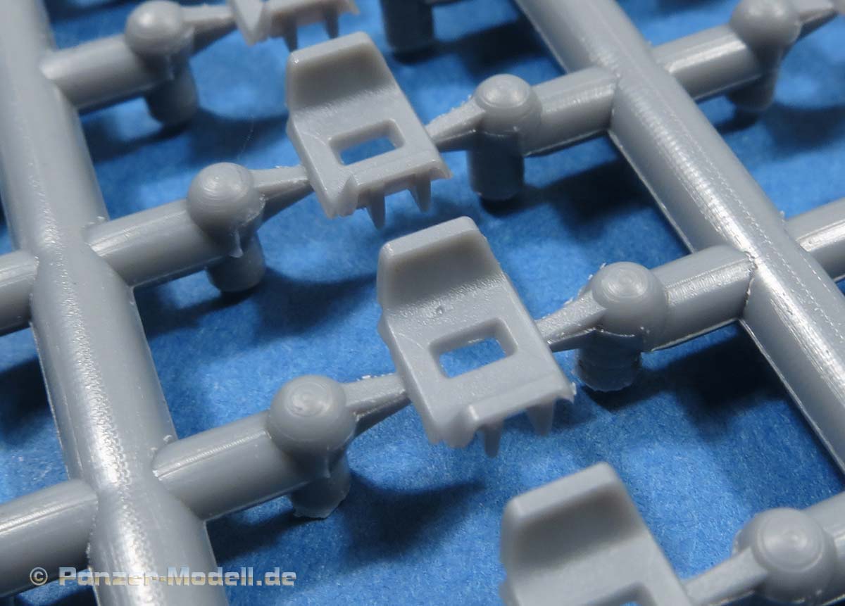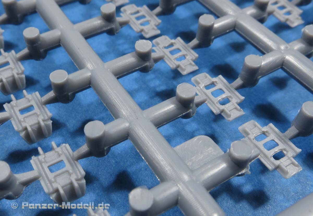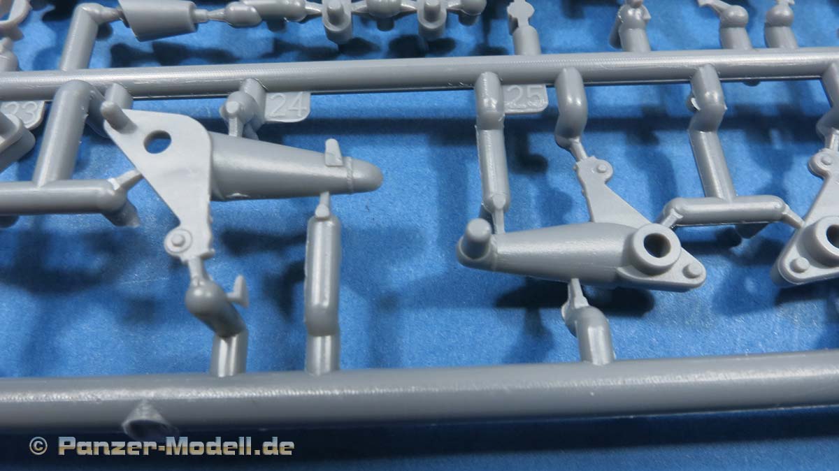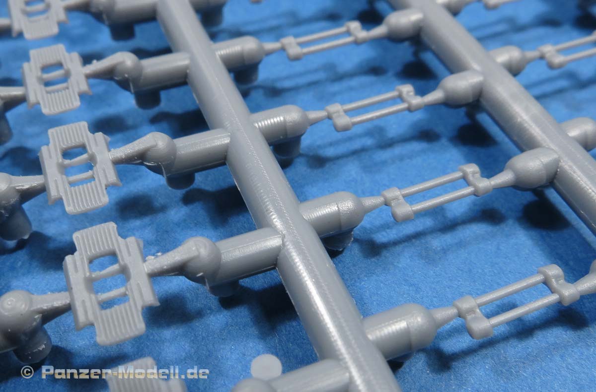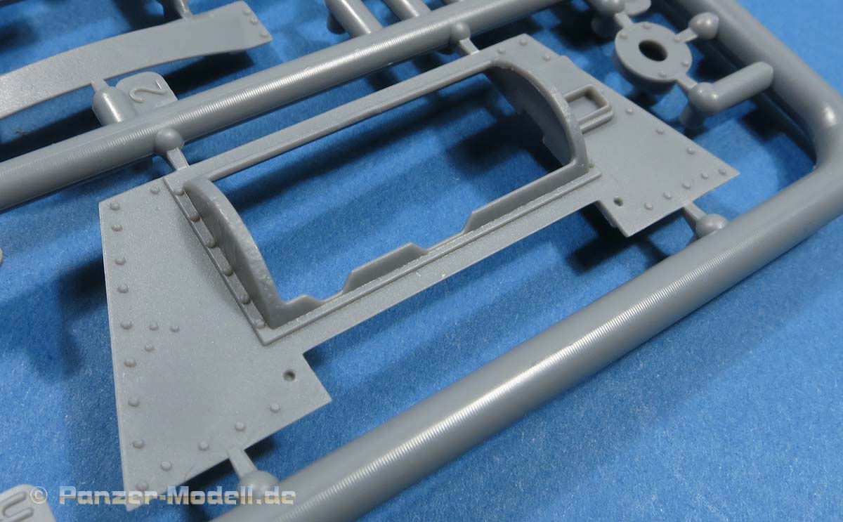 Die Gusssqualität ist ganz hervorragend. Details wie z.B. Schrauben, Nieten, Schweißnähte und Bedienhebel fallen positiv ins Auge mit scharfen, klaren Detailguss. Die Angüsse sind klein und gut zugänglich. Auswerferspuren sind, wo es geht auf den Gießästen zu finden, und sonst nur in geringer Anzahl auf den Teilen und an Stellen, die nach dem Zusammenbau nicht mehr ins Auge fallen. Zudem sind sie recht flach und gut zu entfernen, wenn man dies für nötig hält.