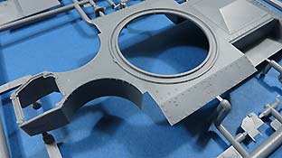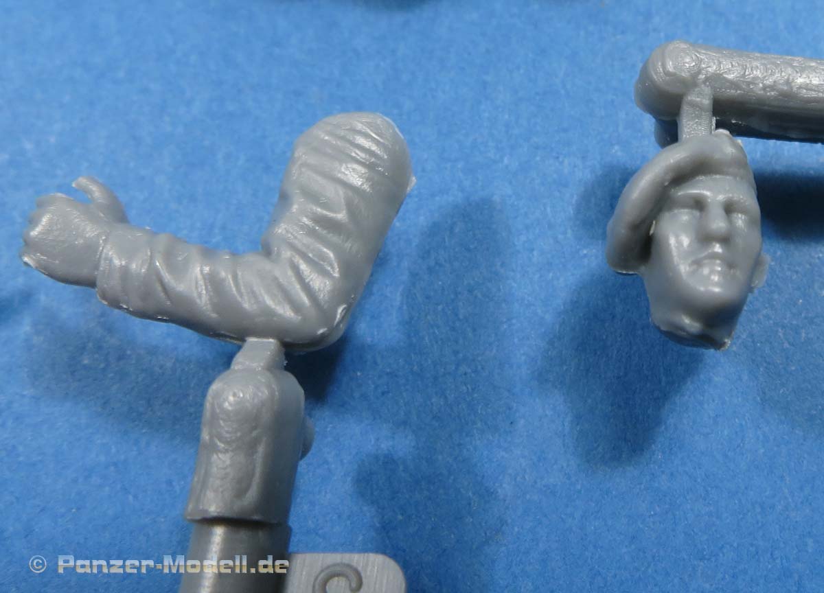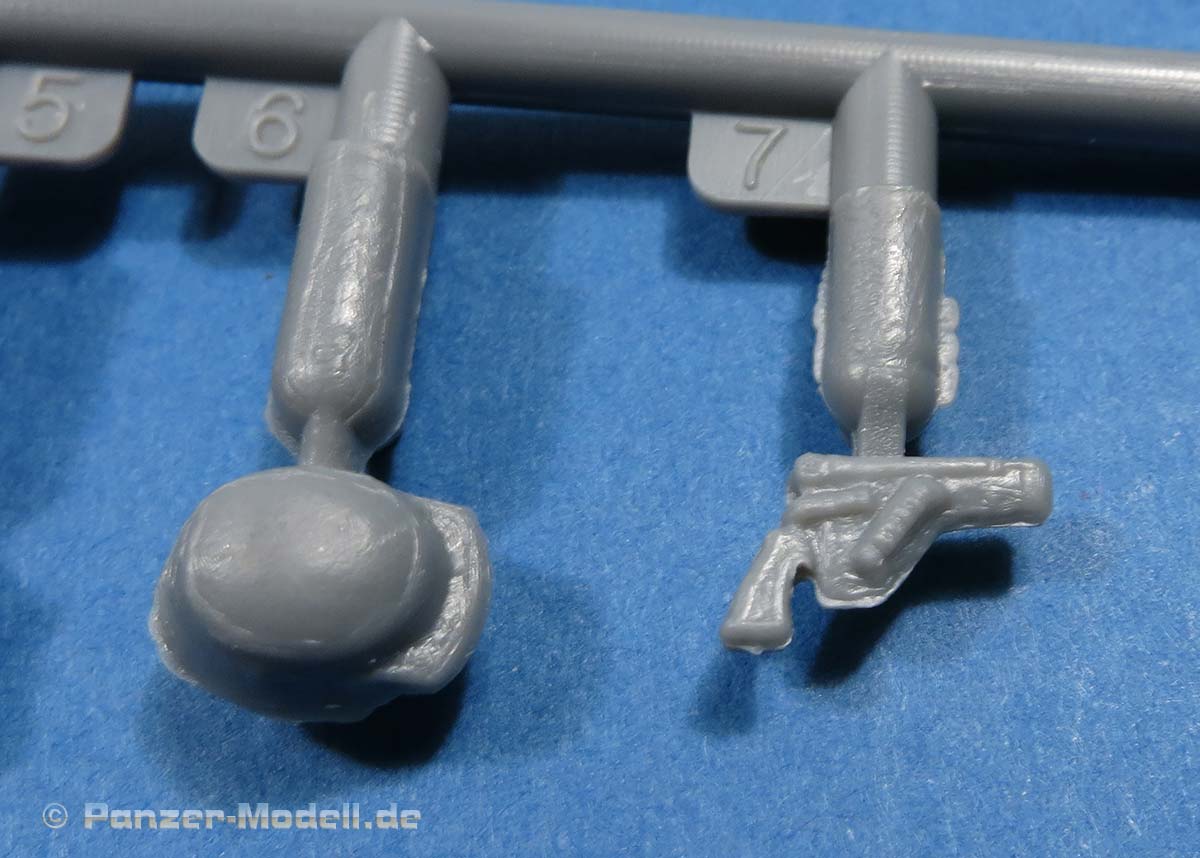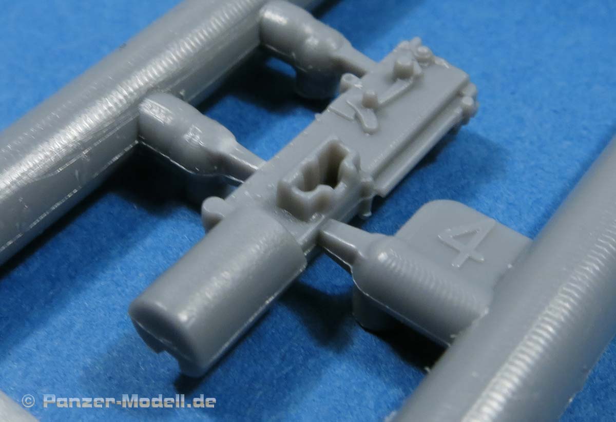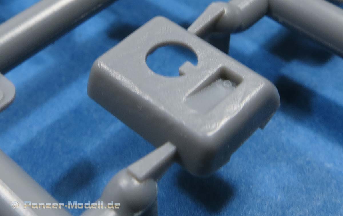 Die Gusssqualität ist ganz hervorragend. Details wie z.B. Schrauben, Nieten, Schweißnähte und Bedienhebel fallen positiv ins Auge mit scharfen, klaren Detailguss. Die Angüsse sind klein und gut zugänglich. Auswerferspuren sind, wo es geht auf den Gießästen zu finden, und sonst nur in geringer Anzahl auf den Teilen und an Stellen, die nach dem Zusammenbau nicht mehr ins Auge fallen. Zudem sind sie recht flach und gut zu entfernen, wenn man dies für nötig hält.