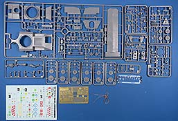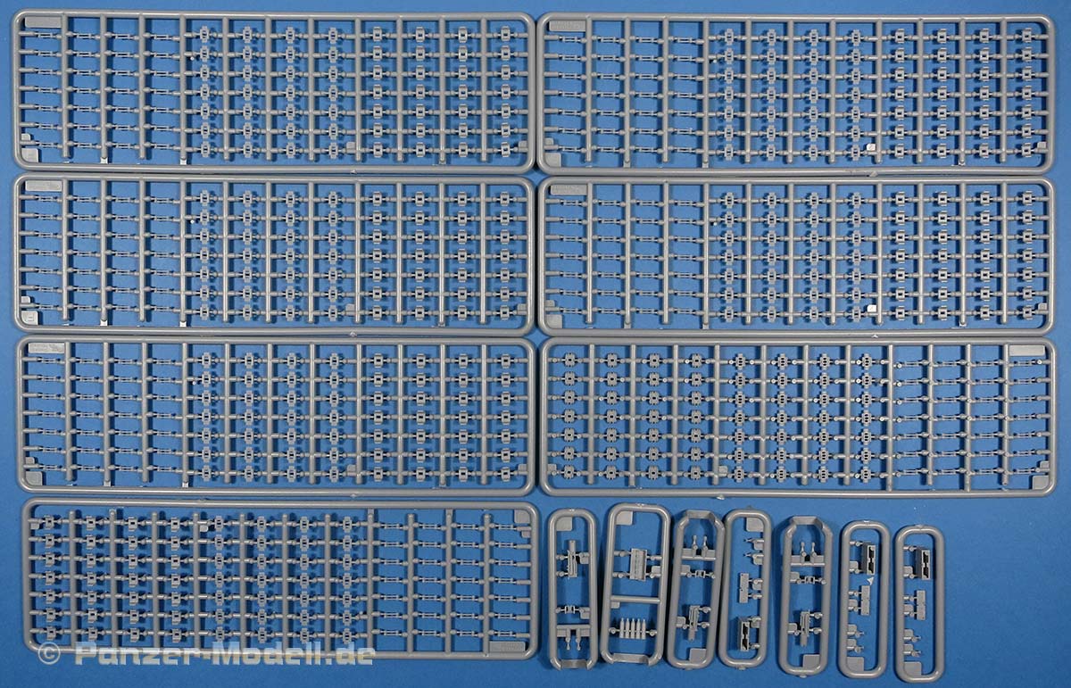 Das Fahrgestell entspricht dem des Valentine - je Seite 2 große Lagerböcke, die die Rollenwagen mit je einem großen und 2 kleinen Laufrollen und ein Stützrad aufnehmen. Mittig zwischen den Lagerböcken findet man das 3. Stützrad. Lauf- und Stützrollen sind sehr fein detailliert. Die Federbeine bestehen aus funktionsfähigen Plastikfedern - hier besteht das Hauptproblem darin diese sauber und bruchfrei von all den Angüssen zu befreien. Das gesamte Fahrwerk ist beweglich ausgelegt, so dass man es z.B. an Bodenunebenheiten in einem Diorama anpassen kann. Dies wird durch die vollbewegliche Kette unterstützt, die sich aus Obergliedern mit Führungszähnen, Untergliedern und Endverbindern mit Kettenbolzen zusammensetzt. Es gibt eine Montagehilfe für den Bau der Kette. Insgesamt ist der Bau von Fahrwerk und Kette schon recht teilelastig und dazu mit sehr vielen Kleinteilen. D.h. man hat zwar ein wunderschön detailliertes Laufwerk, es erfordert aber auch eine Menge Arbeitsaufwand und Muße