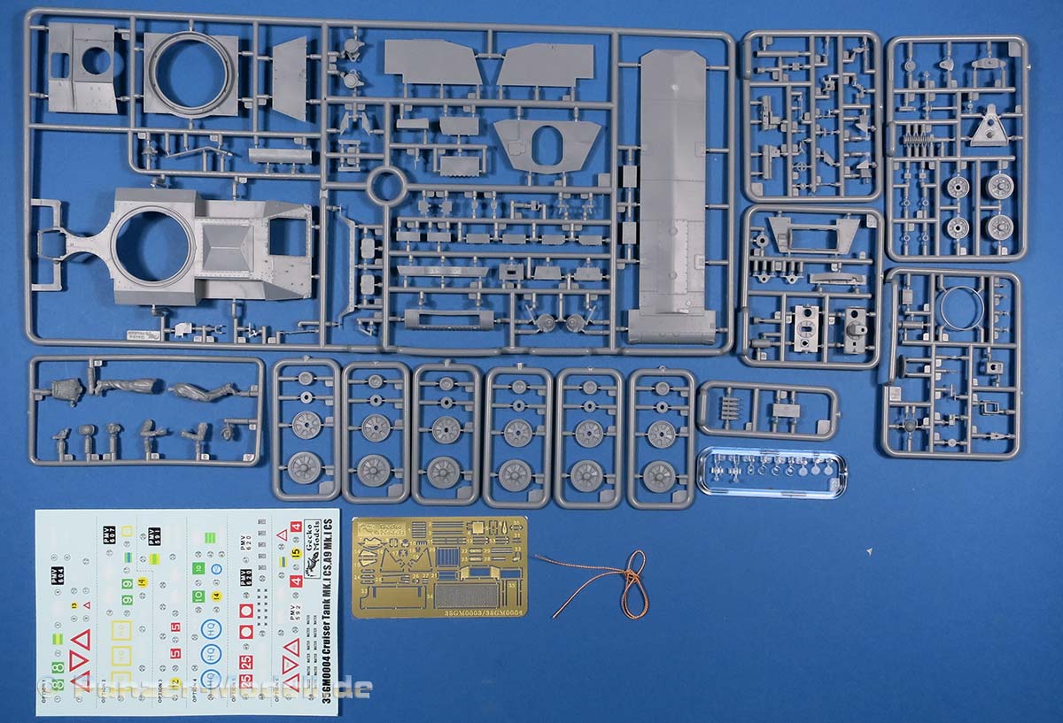 Im Karton finden wir einen Klarsicht- und 39 hellgraue Spritzlinge. Dazu kommen Schnur, eine Ätzteilplatine und ein Decalbogen.