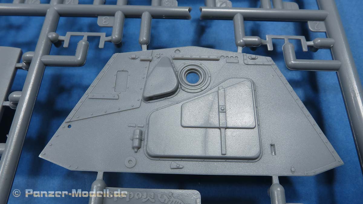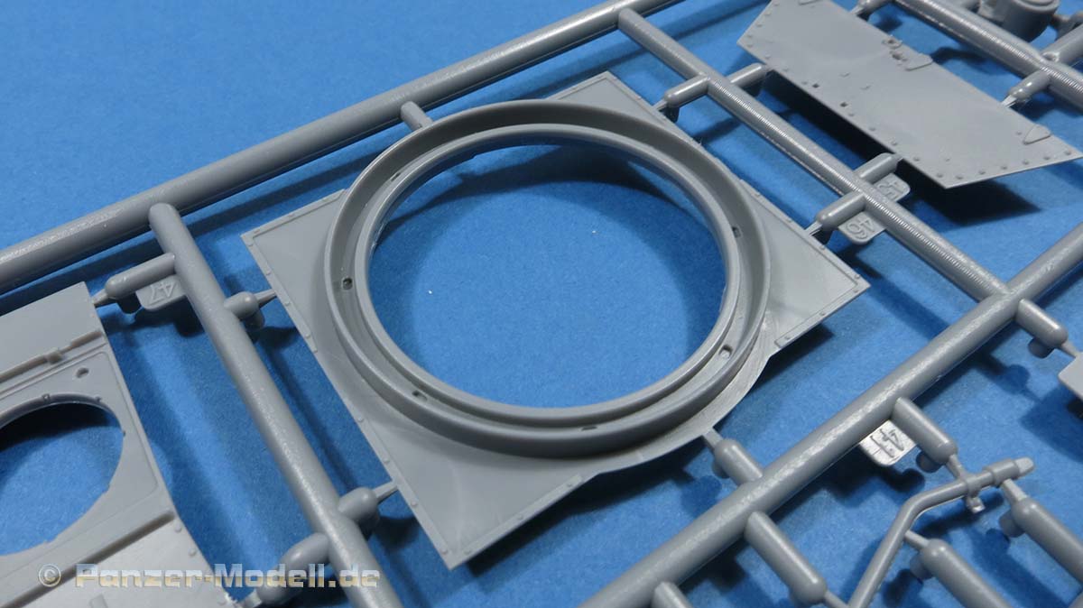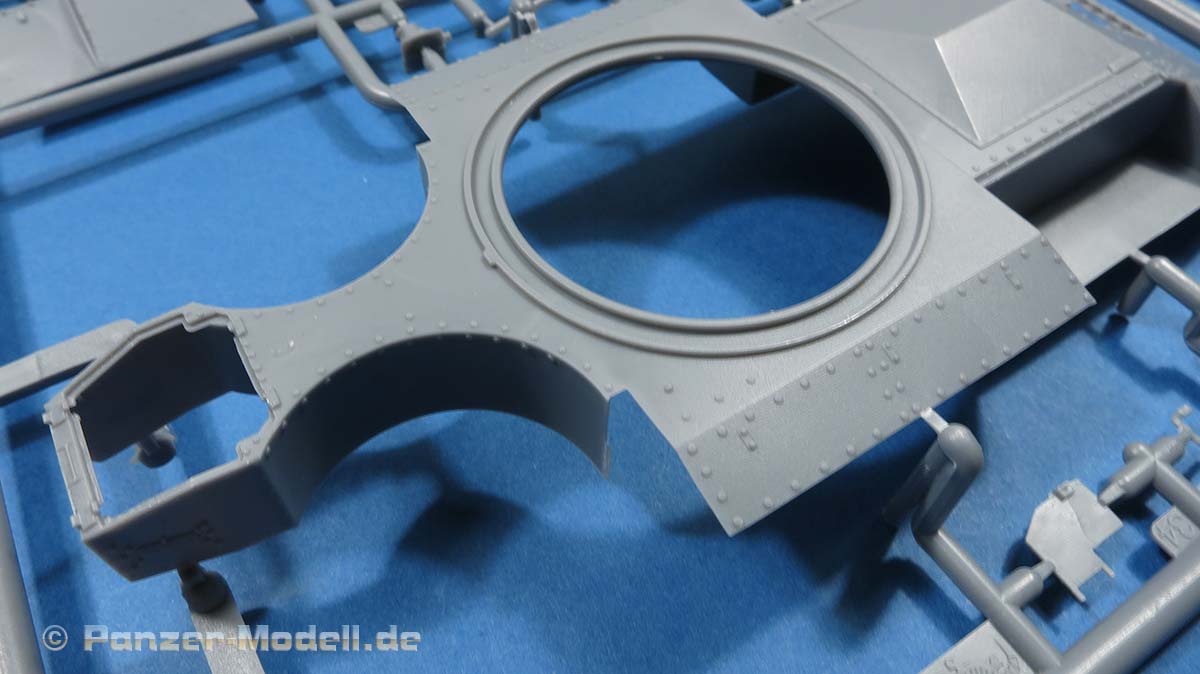 Die Oberwanne ist soweit einteilig und hervorragend mit den Massen an Luken fein detailliert. Die Luken können offen oder geschlossen gebaut werden. Die Turmdrehringpanzerung des Hauptturms besteht aus einem runden Teil mit vielen Nieten. Ein schönes Teil ist der Auspuff. Dieser wird mit dem großen PE Gitter ummantelt und mit Zulauf- und Endrohr versehen. Er ruht in Halterungerungen aus PE-Teilen.