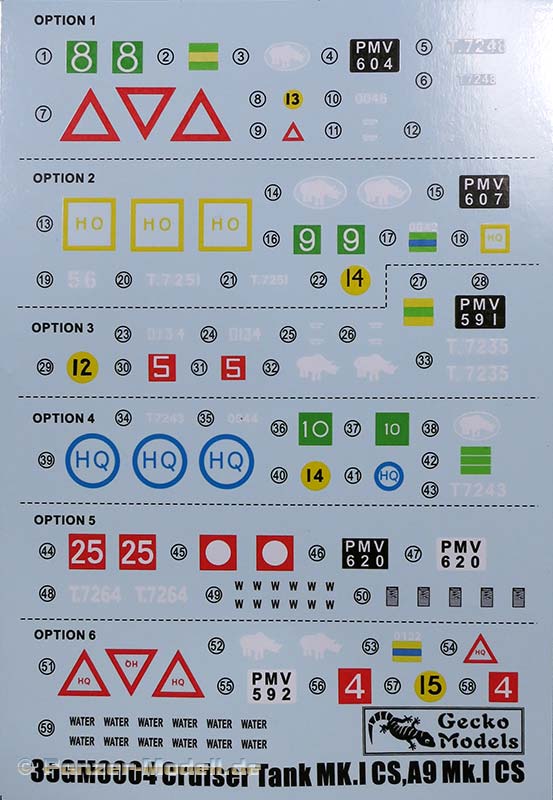 Es liegen sauber gedruckte Decals für 6 Panzer bei. Damit kann man folgende Fahrzeuge darstellen: