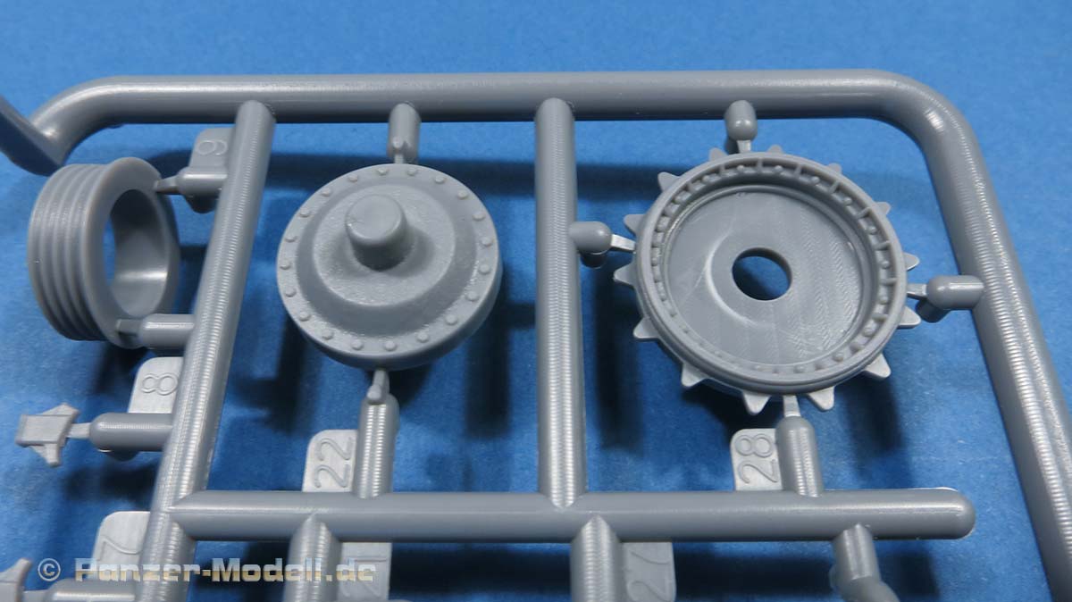 Der Getriebekasten am Heck hat eine separat anzubauende Wartungsklappe. Die Leitradlager mit der Kettenspannvorrichtung bestehen zwecks besserer Detaillierung aus mehreren Einzelteilen. Dies gilt auch für die Treibräder.