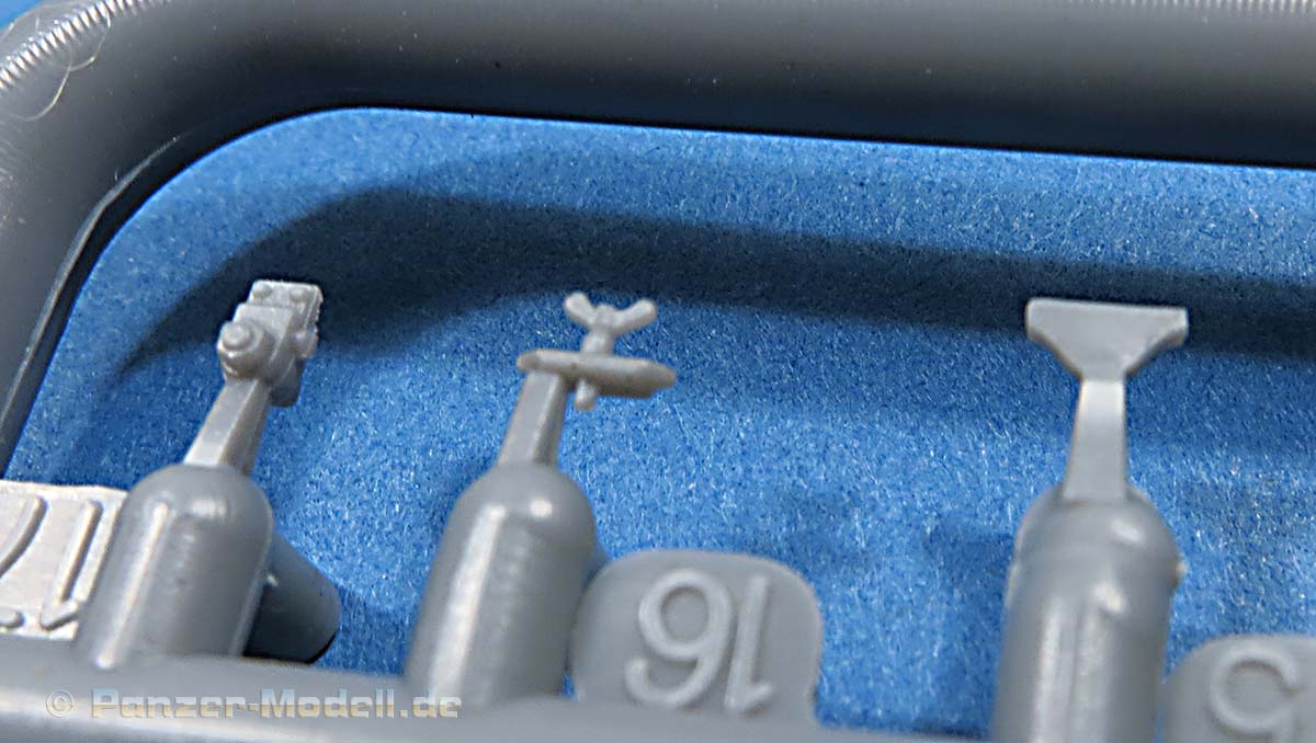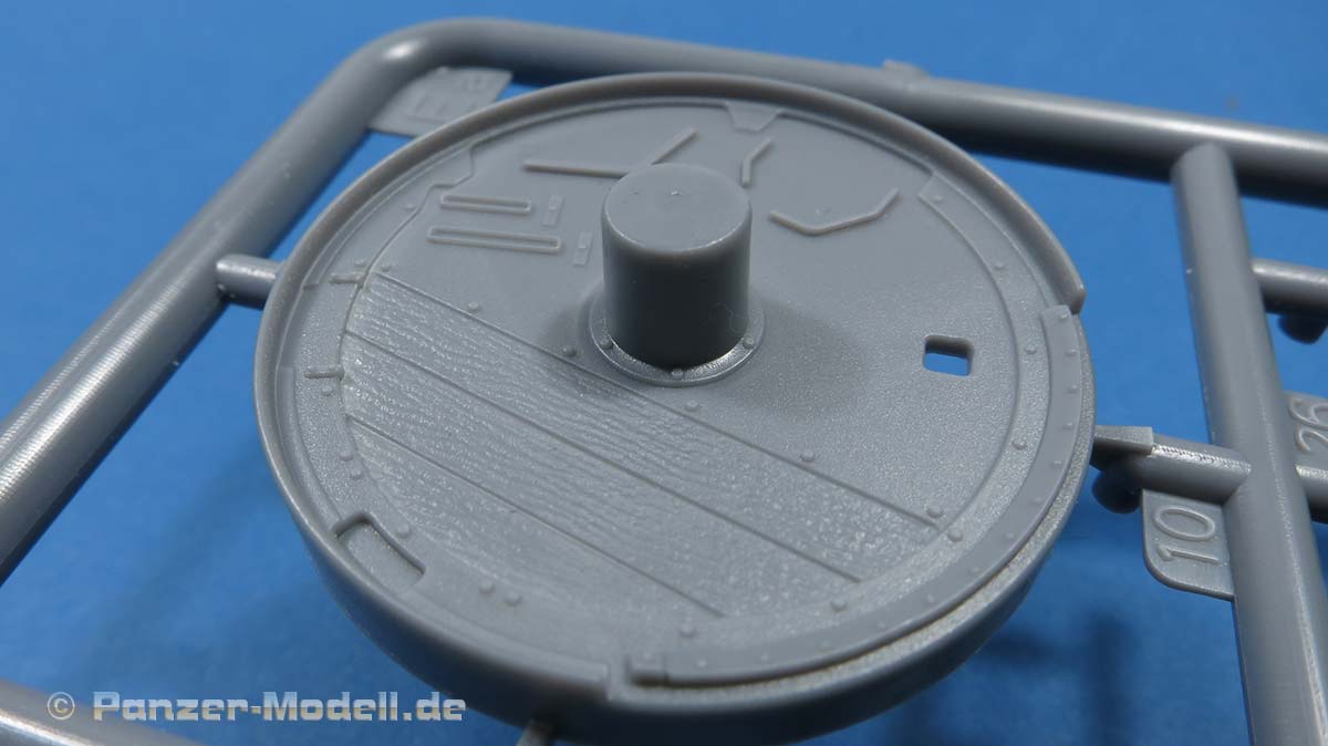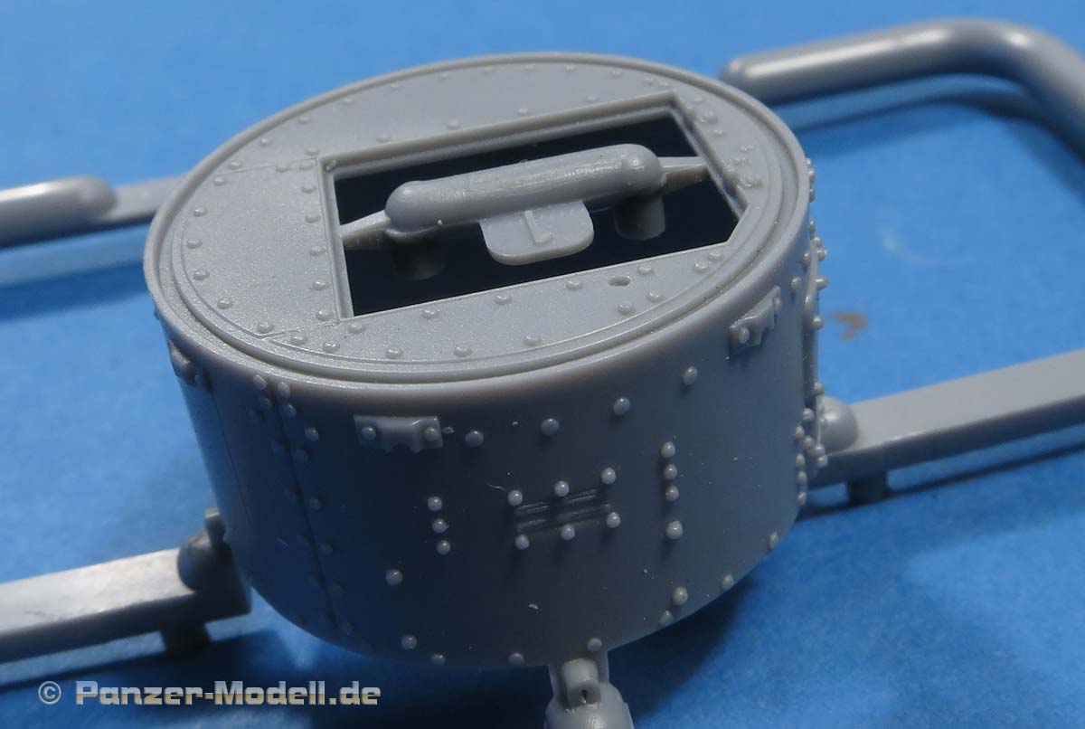 Die beiden vorderen MG Türme sind als Turmkörper einteilig gespritzt und werden durch den Drehrind unten und die Deckplatte oben abgeschlossen - dazu gibt es aber recht viele Kleinteile zum einbau des MGs in die bewegliche Blende und gerade das MG strotzt nur so vor einer Vielzahl an kleinen, feindetaillierten Teilen. Die Lukendeckel sind mehrteilig und lassen sich offen oder geschlossen bauen.