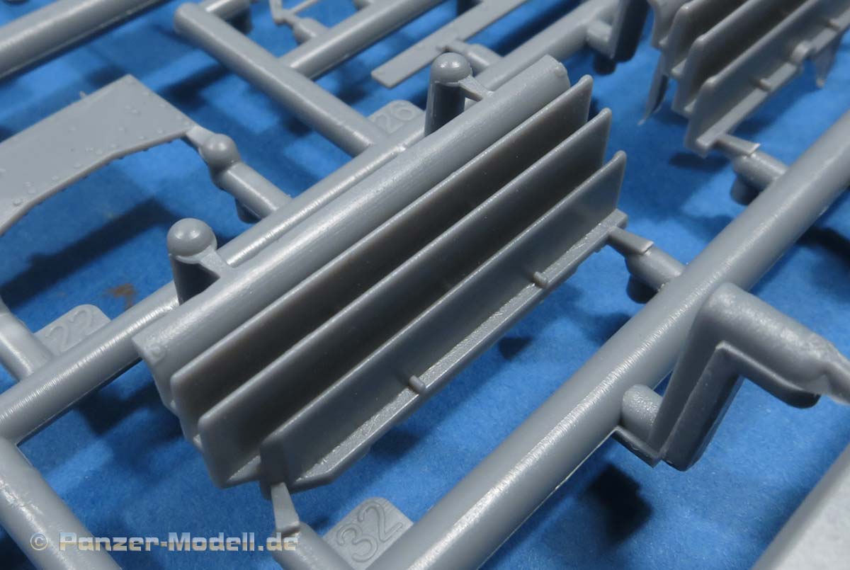 Die Kettenabdeckungen bestehen aus einem Guss, müssen aber mit reichlich Teilen und Details versehen werden. Es sind 4 Stück im Bausatz vorhanden, von denen man je zwei auswählen muss für entweder die Standardversion, oder die Wüstenversion.
