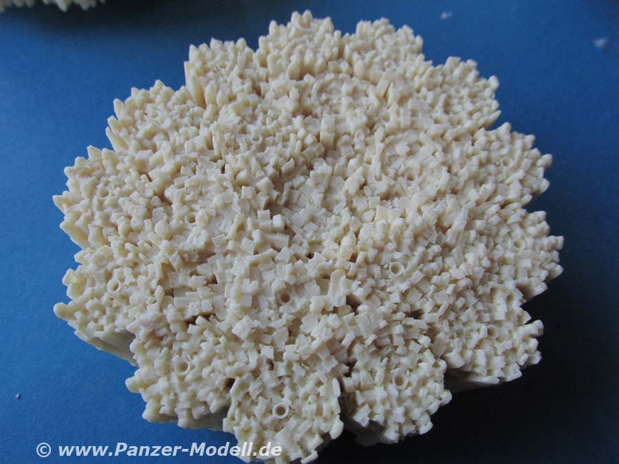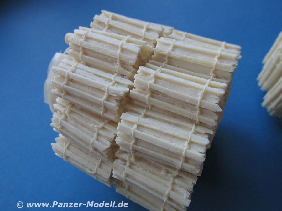 Im Karton finden sich 4 Resinbauteile zum Zusammensetzen des Bündels. Der Aussendurchmesser beträgt rund 7,5cm und die Breite zusammengesetzt rund 12cm. Die Teile sind mittig hohl gegossen um Gewicht und Material zu sparen.