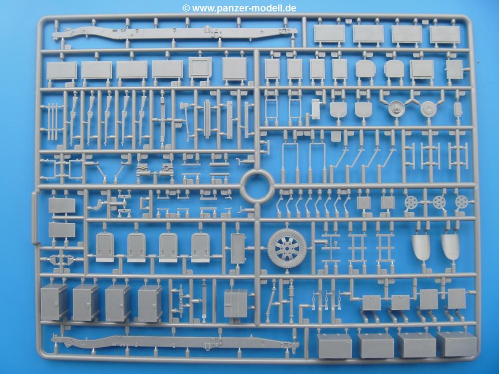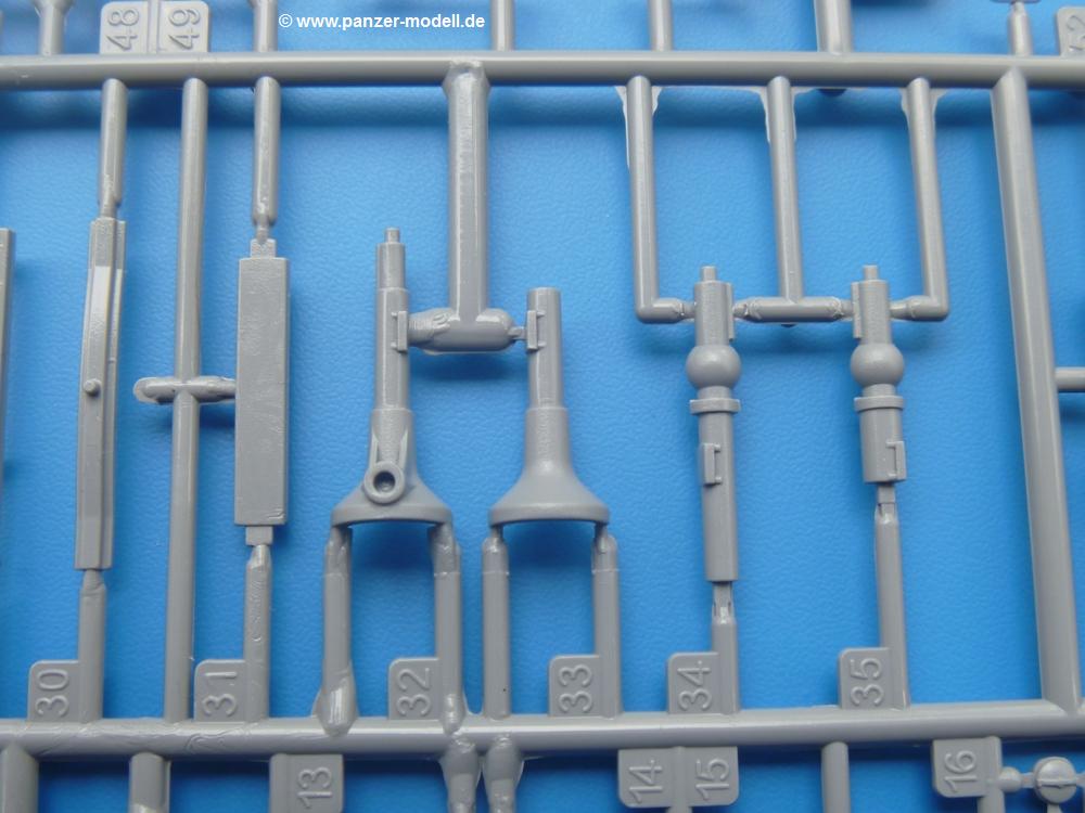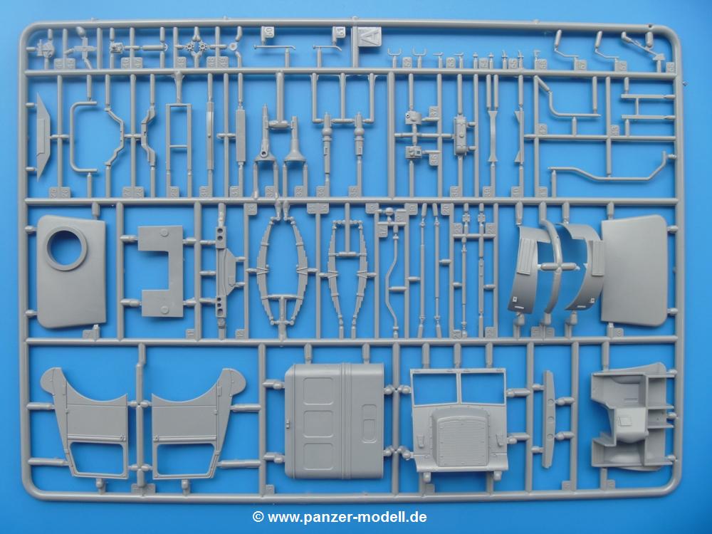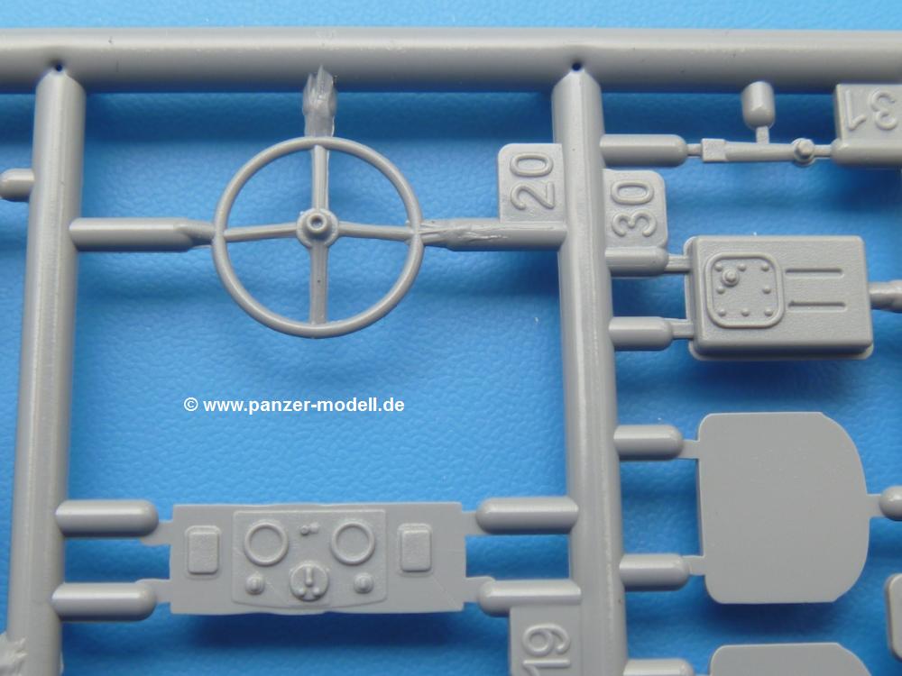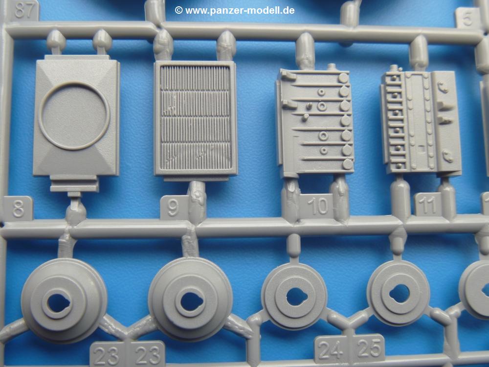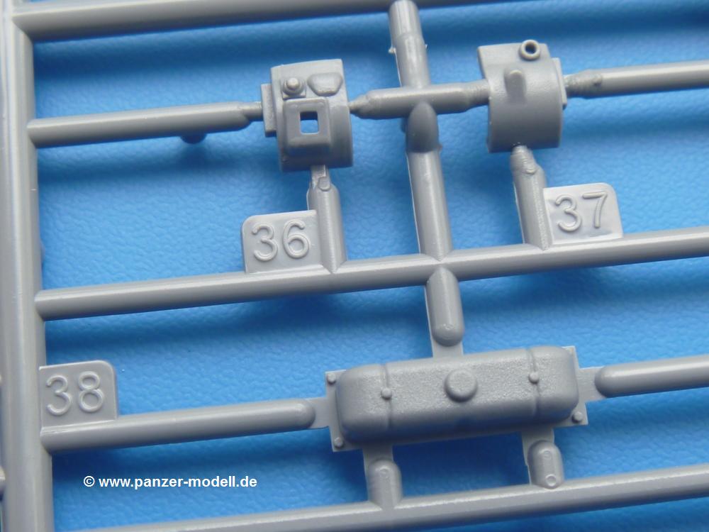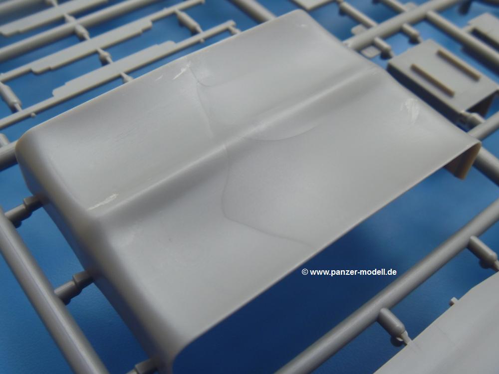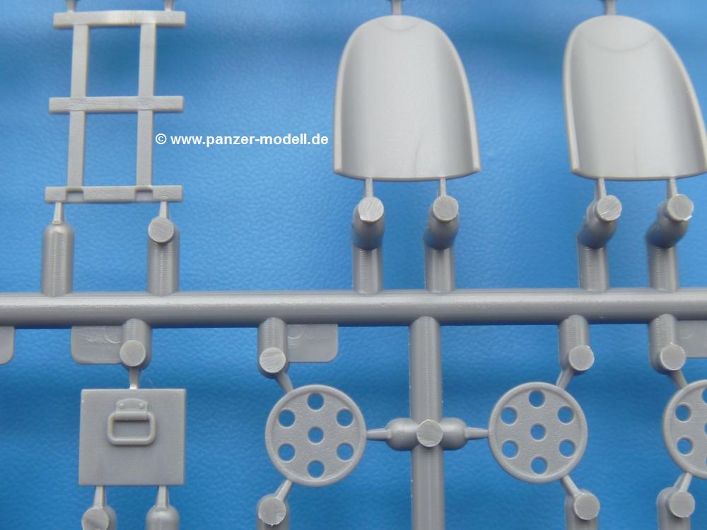 Die Teile aus mittelgrauem Plastik sind sauber ausgespritzt, ohne Grat und Versatz. Die Auswerfer sind meist auf den Spritzrahmen platziert. Einige wenige sind auf Teilen zu finden, aber so platziert, dass sie auch ohne Verspachteln nach dem Zusammenbau nicht mehr stören würden. An wenigen Teilen sind Sinkstellen zu sehen wie z.B. an den Tarnscheinwerfern B54.