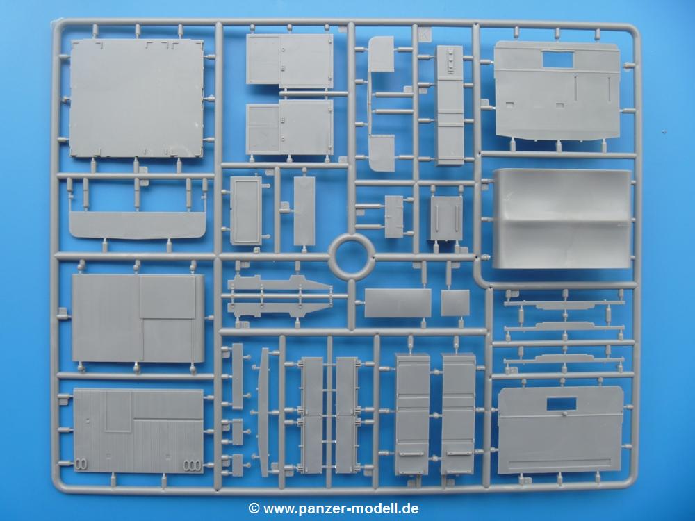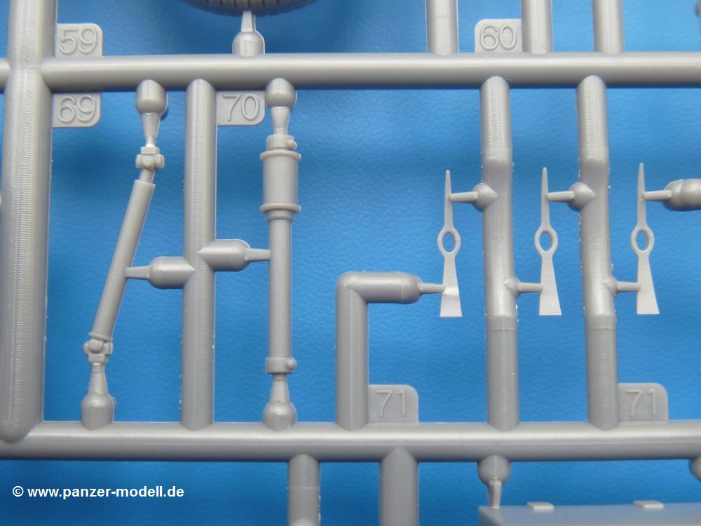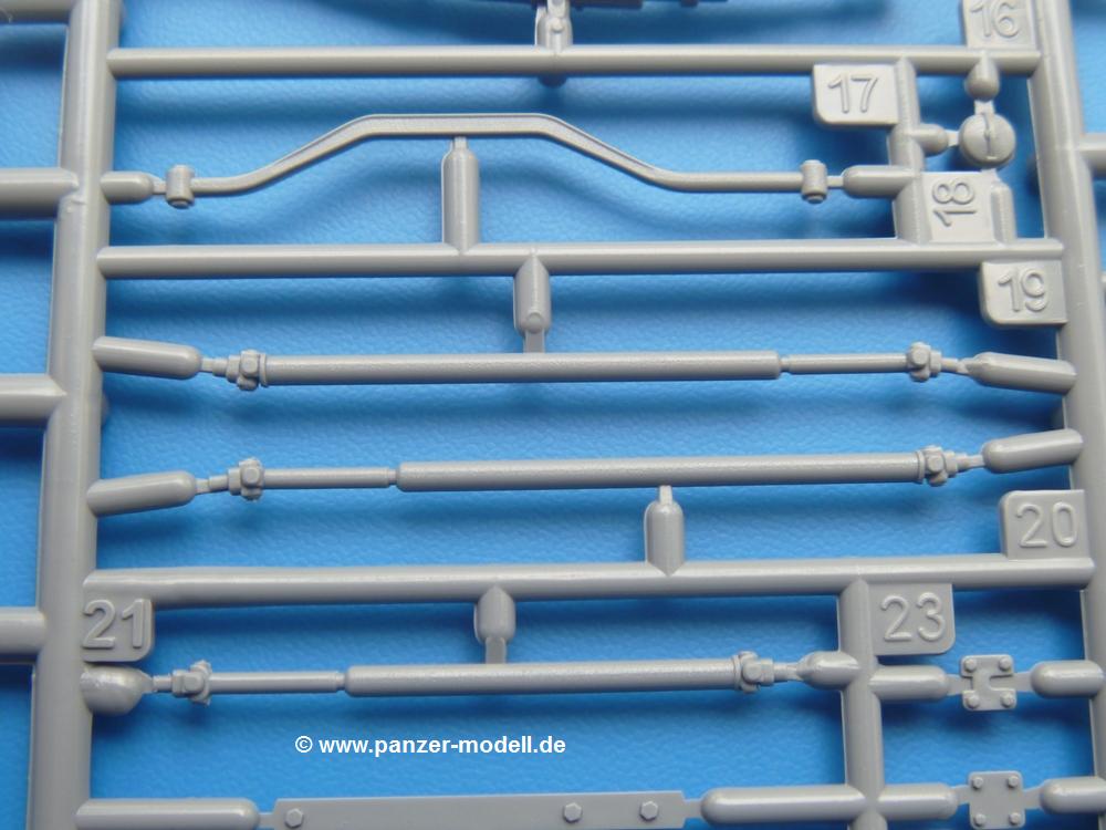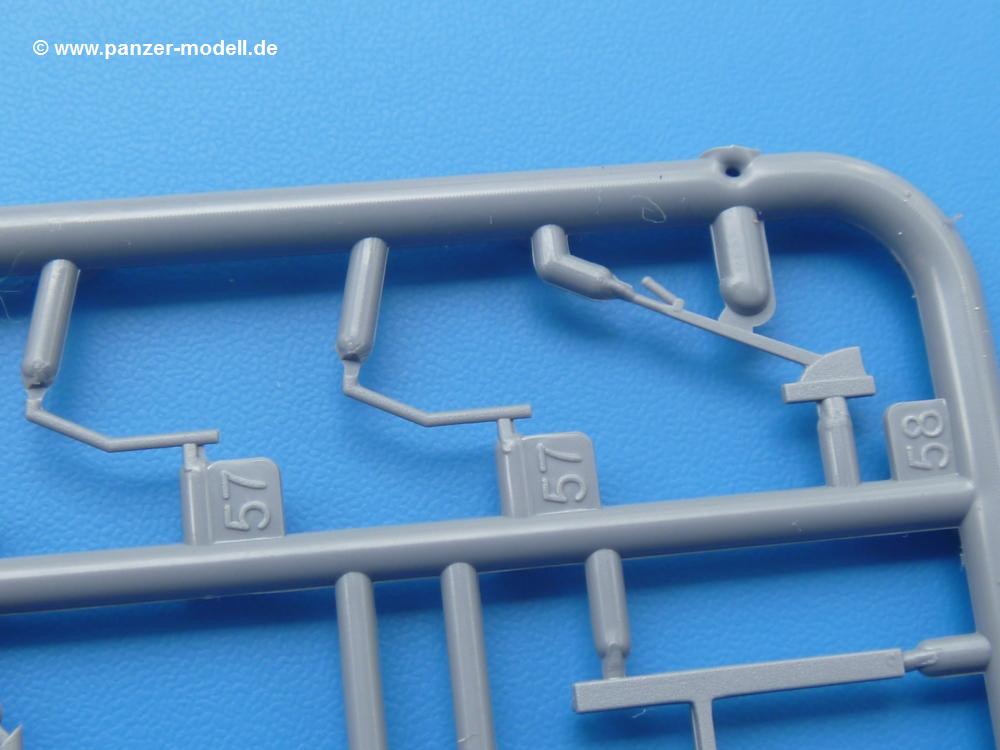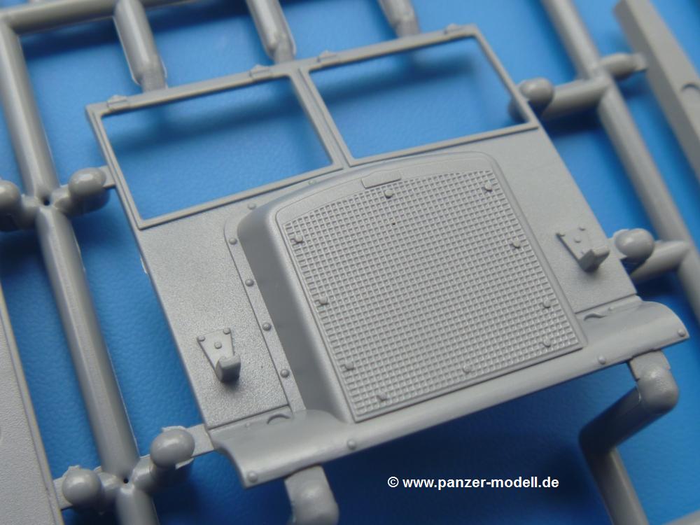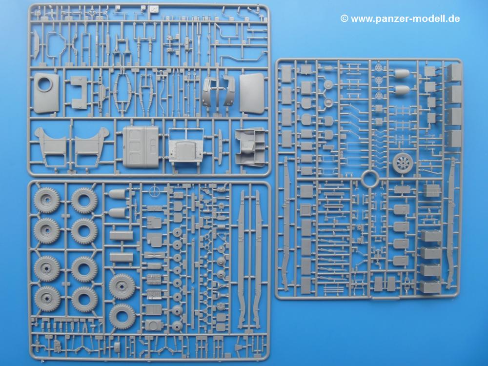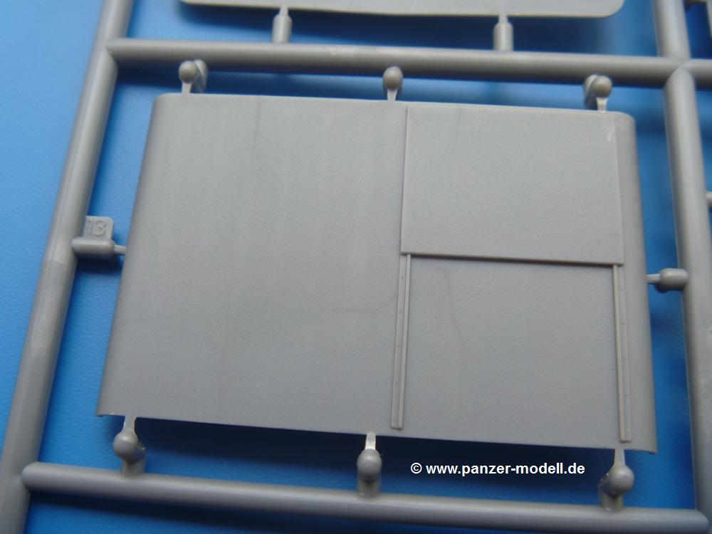Die Teile aus mittelgrauem Plastik sind sauber ausgespritzt, ohne Grat und Versatz. Die Auswerfer sind meist auf den Spritzrahmen platziert. Einige wenige sind auf Teilen zu finden, aber so platziert, dass sie auch ohne Verspachteln nach dem Zusammenbau nicht mehr stören würden. An wenigen Teilen sind Sinkstellen zu sehen wie z.B. an den Tarnscheinwerfern B54.