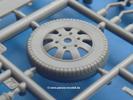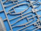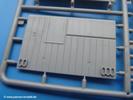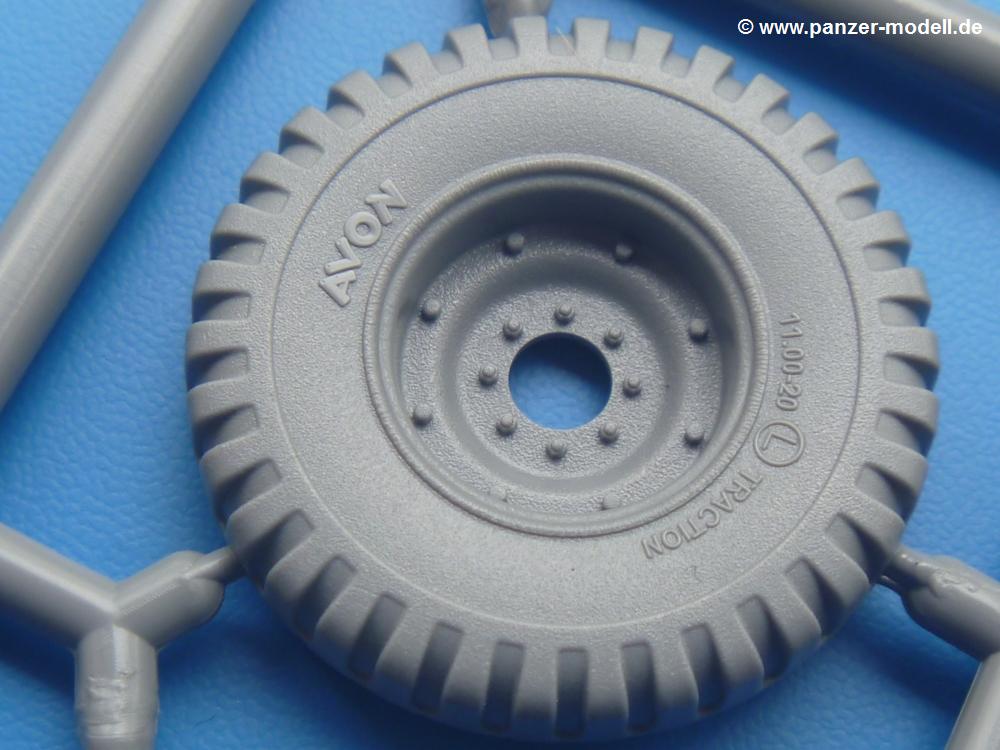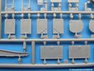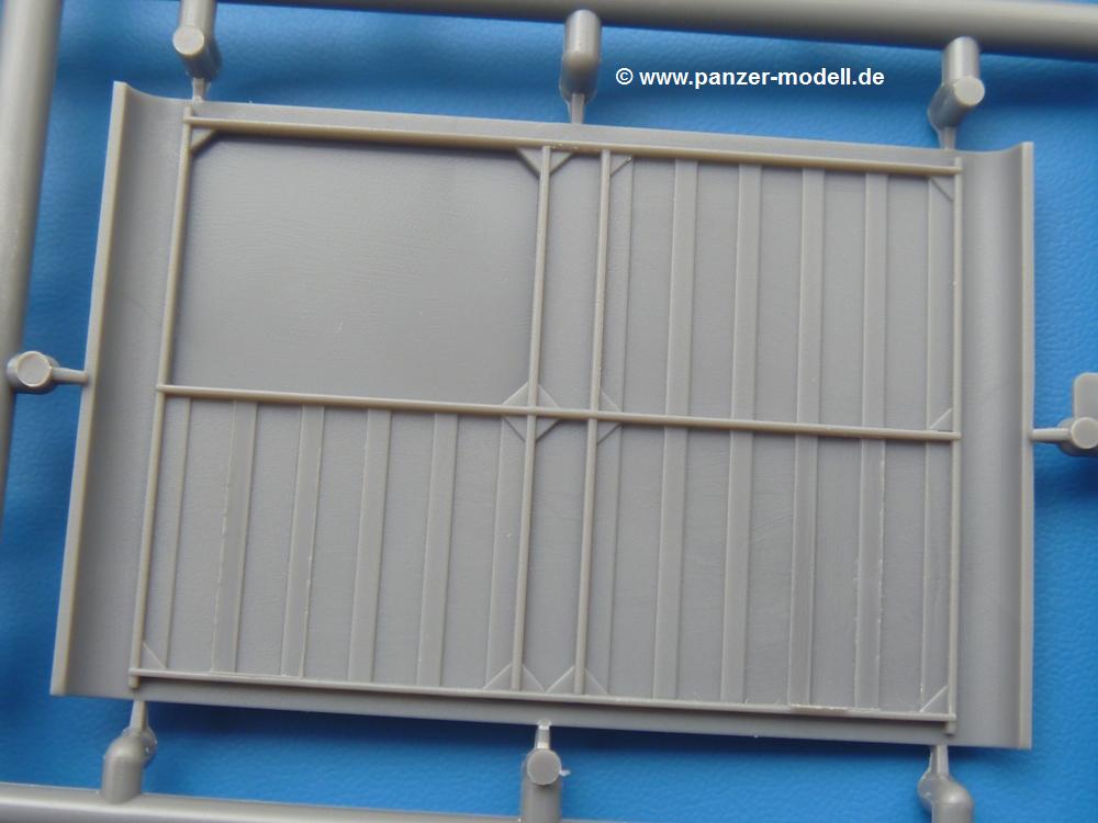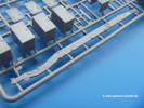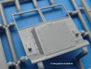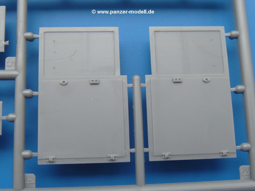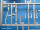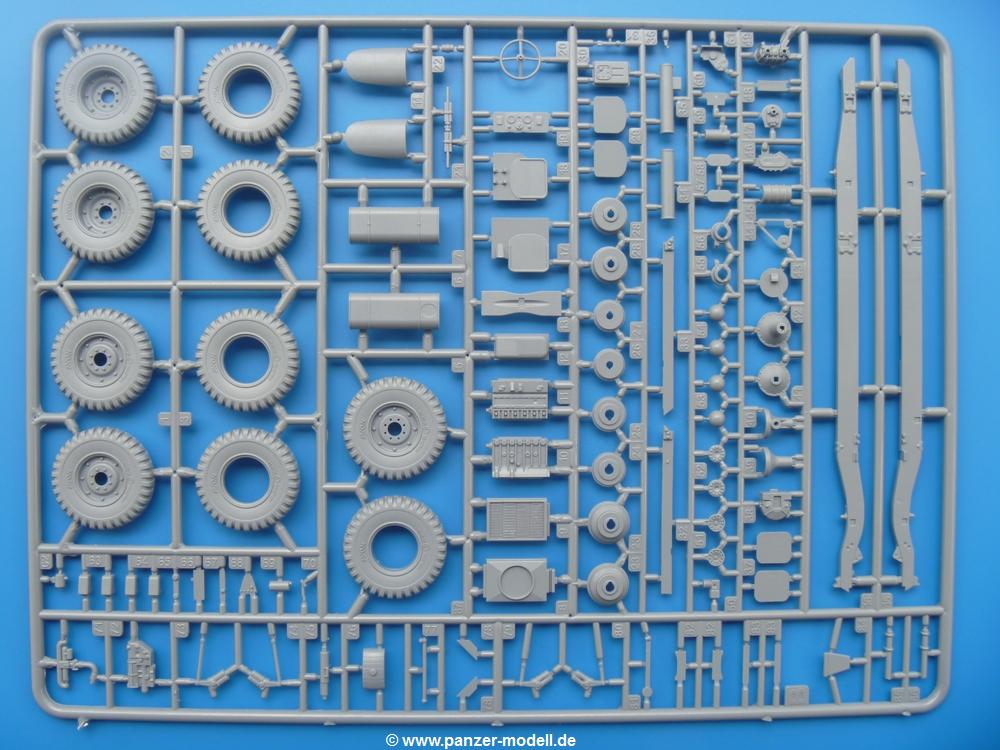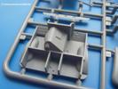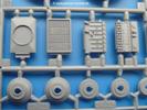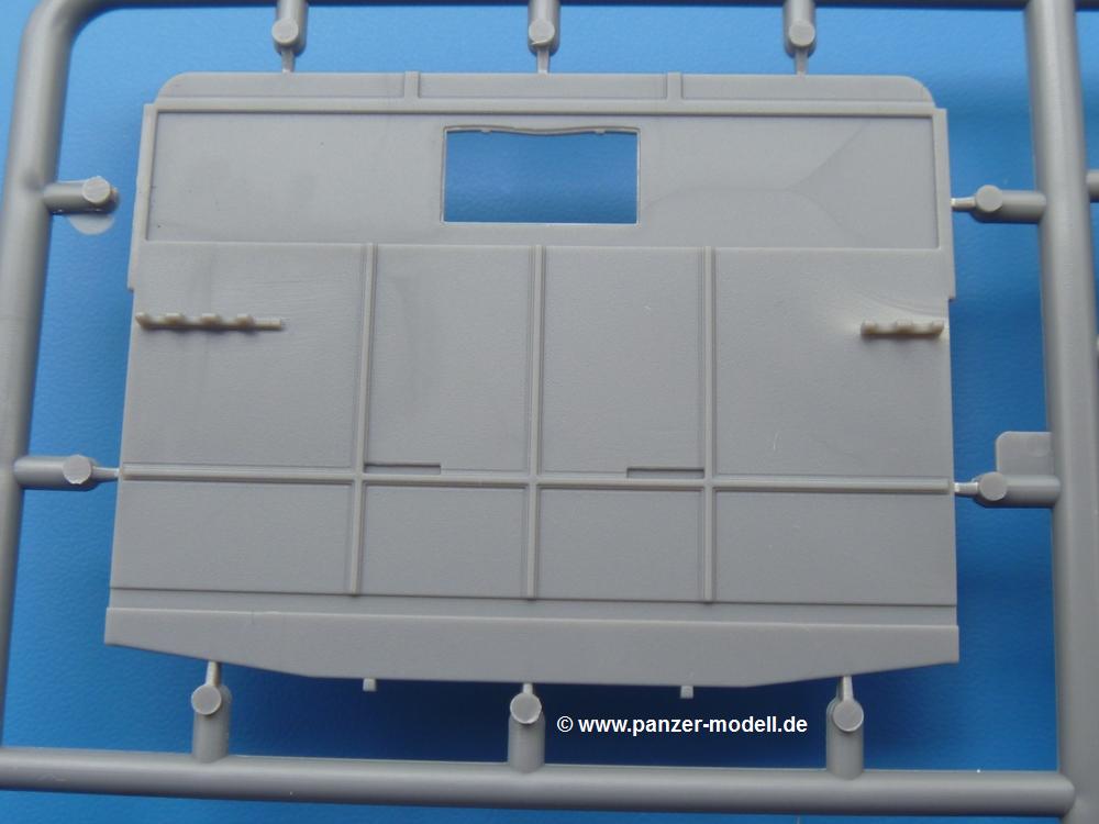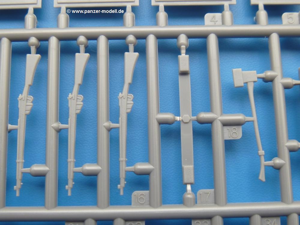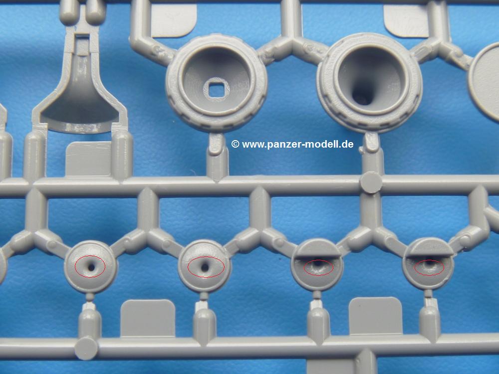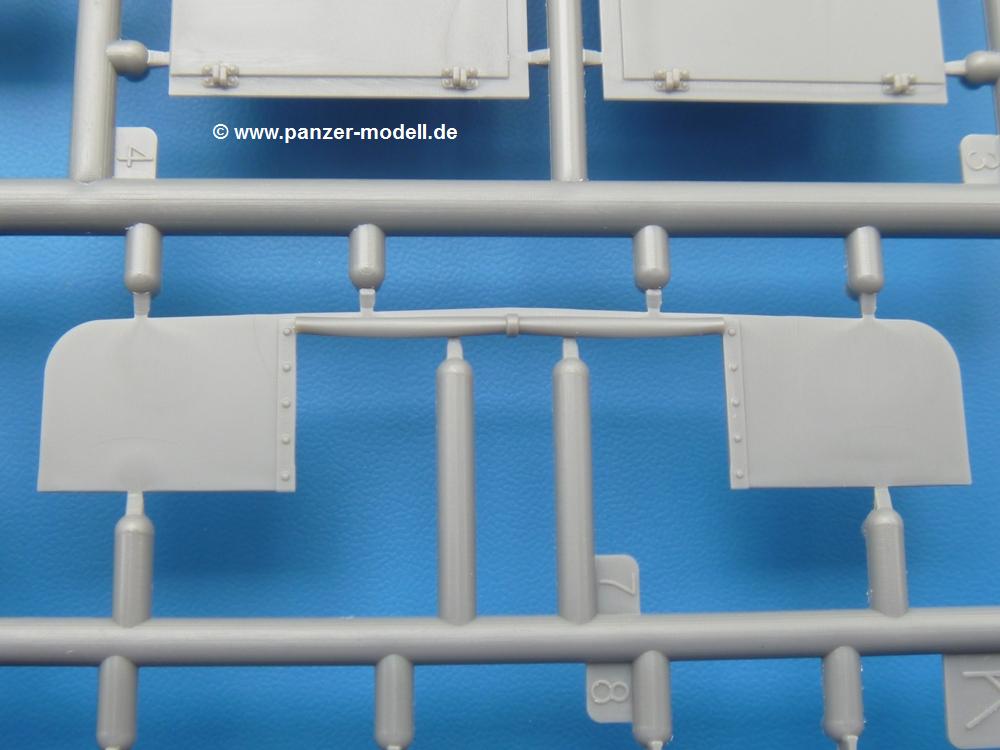 Die Teile aus mittelgrauem Plastik sind sauber ausgespritzt, ohne Grat und Versatz. Die Auswerfer sind meist auf den Spritzrahmen platziert. Einige wenige sind auf Teilen zu finden, aber so platziert, dass sie auch ohne Verspachteln nach dem Zusammenbau nicht mehr stören würden. An wenigen Teilen sind Sinkstellen zu sehen wie z.B. an den Tarnscheinwerfern B54.