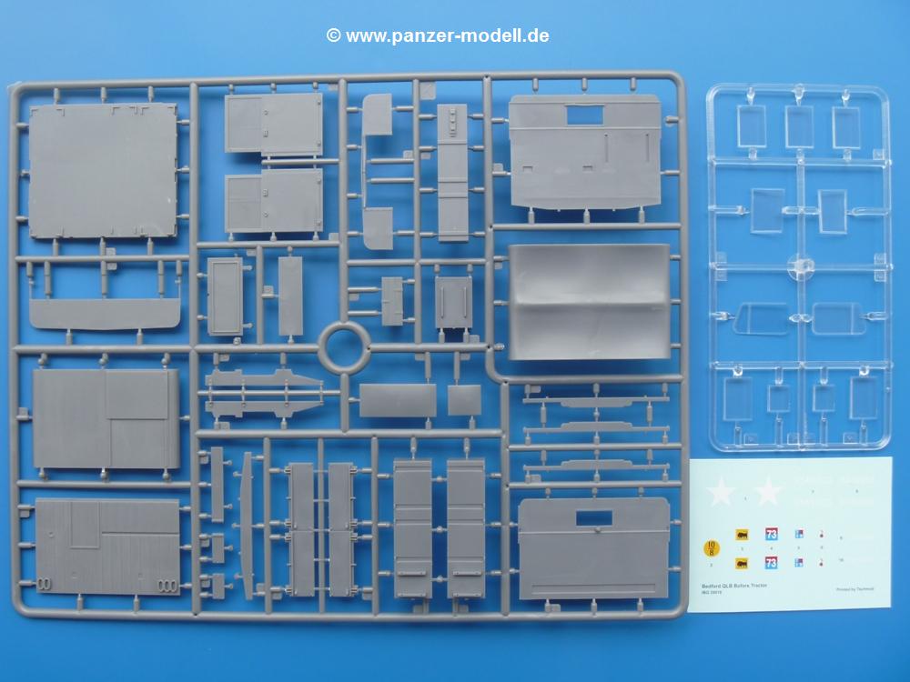 Den Klarsichtspritzling und A und B kennt man bereits aus dem QLD Bausatz, nur das einige Teile davon wie z.B. Rahmenlängsträger und das geschlossene Fahrerhausdach für den QLB nicht gebraucht werden. Da man nur die Front- und Seitenscheiben für das Fahrerhaus braucht, bleibt etwas "Glas" über.