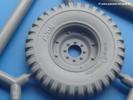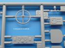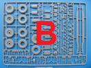 Die auffälligsten Teile am Spritzling B sind die Radhälften. Eine Hälfte jeweils mit, die andere Hälfte ohne die Felge. Besondere Hingucker sind die Aufdrucke wie z.B. Hersteller "AVON" und Größenangaben "11.00-20" etc. Die Schrauben sind sauber gestaltet. Beim Ersatzrad sind die Schraubenlöcher bereits aufgebohrt. Die beiden Rahmenlängsträger und der große Tank an diesem Spritzling werden nicht gebraucht. Die Federdämpfer der Vorderachse (B73, B74) bestehen aus 2 aneinanderhängenden Zylindern mit einem langen Hebelarm und sind sauber ausgearbeitet. Die Zwillingsbrüder (B79, B80) an der Hinterachse mit dem kürzeren Hebelarm weisen leider an der Nahtstelle zwischen den beiden Zylindern grad an der Außenseite leichte Sinkstellen auf. Die meisten Teile des Motors, der Kupplung, des Kühlers und Teile des Schaltgetriebes sind hier zu finden. Sauber und schön gestaltet ist es schade, das alles unter dem Fahrerhaus verschwinden zu lassen. Das Armaturenbrett enthält alles notwendige. Decals für die Instrumente wären schön gewesen, sind aber nicht enthalten.