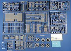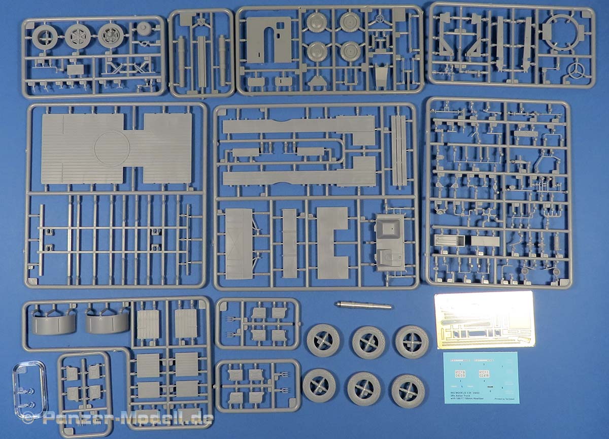 Wir finden Im Karton 16 graue, ein klaren Spritzling, 7 Plastikreifen, 1 PE-Platine, Decals und ein Metallrohr.