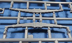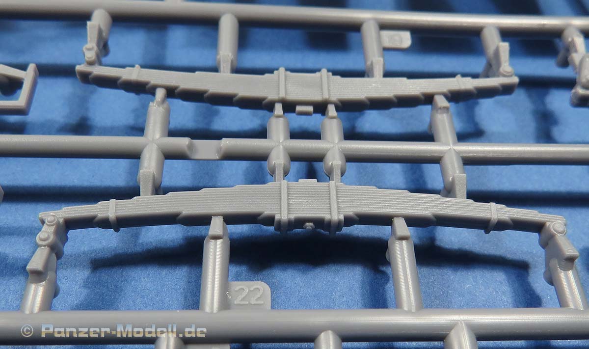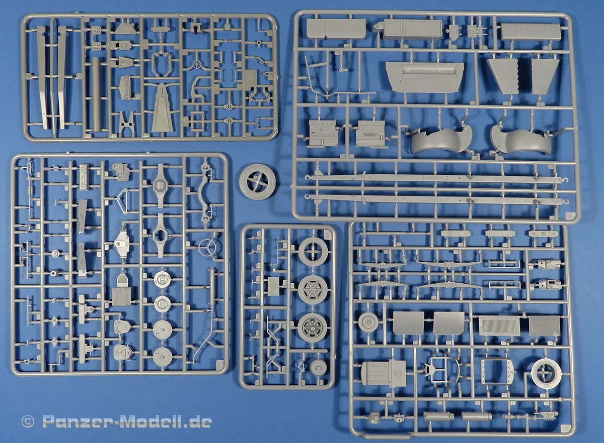 Es gibt sehr viele, teils aus PE bestehende, teils auch filigrane, Anbauteile, die alle ihren Platz finden wollen. Die Vorder und Hinterachse sind gut detailliert und mit recht wenigen Teilen baubar. Leider lässt sich bei der Vorderachse kein Lenkeinschlag bauen, zumindest nicht aus dem Kasten (der findige Modellbauer wird aber sicher eine Möglichkeit finden). Zusätzliche Blatt- und Spiralfedern sind an Vorder bzw. Hinterachse anzubringen, die einen guten Eindruck machen.