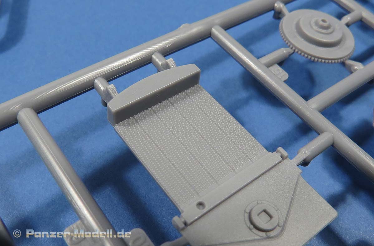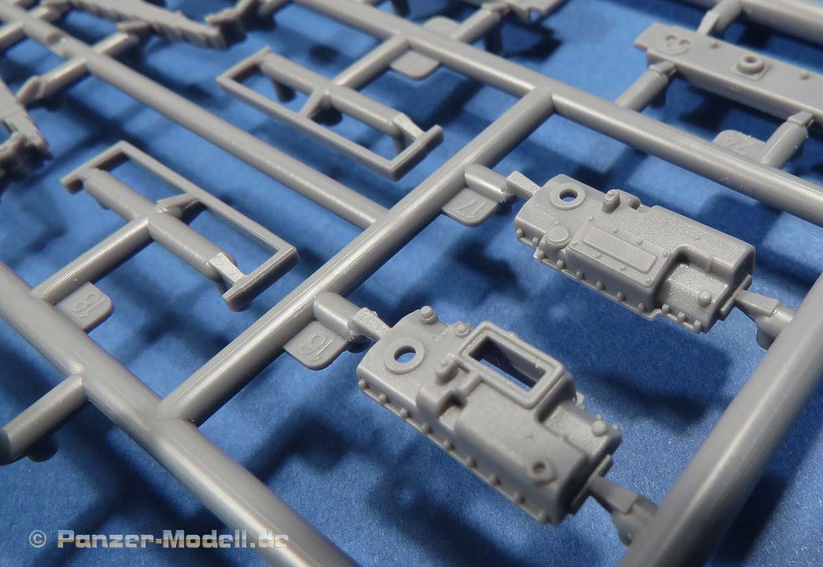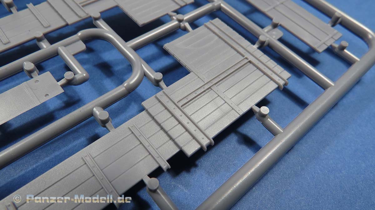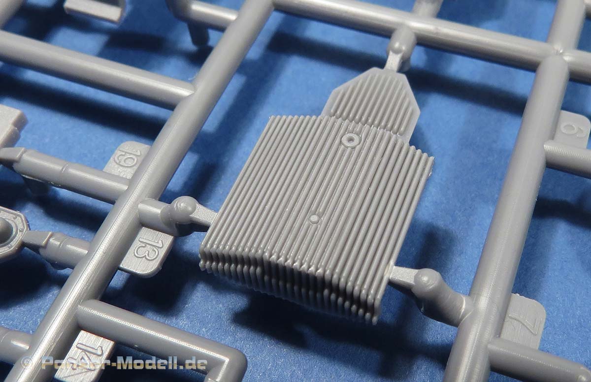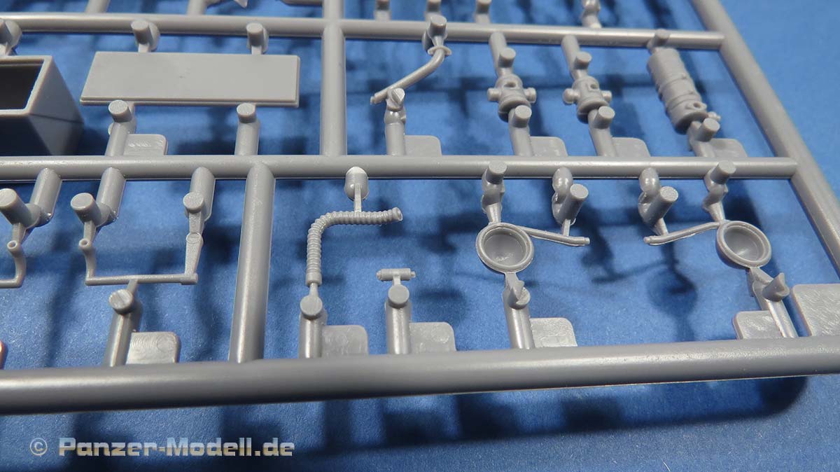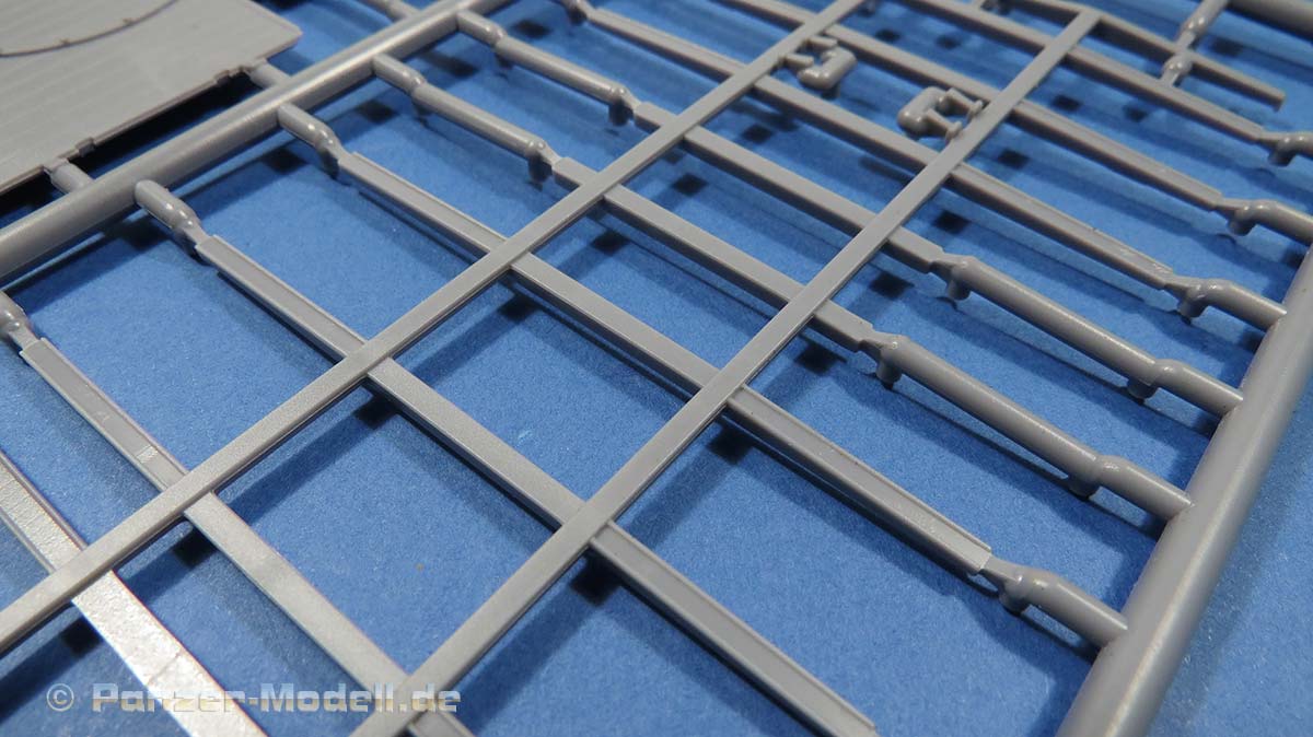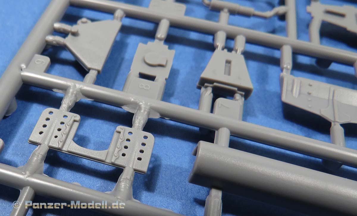 Die Teile aus grauem Plastik sind sauber ausgespritzt, ohne Grat und Versatz. Angüsse sind so gesetzt, dass Details in der Regel nicht beeinträchtigt werden. Unnötige oder störende Auswerferspuren sind mir nicht aufgefallen. Also, alles in allem sollte man die Teile vom Spritzling ohne viel Nacharbeit bekommen.