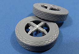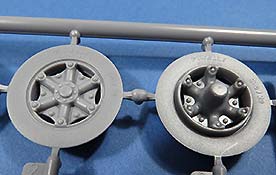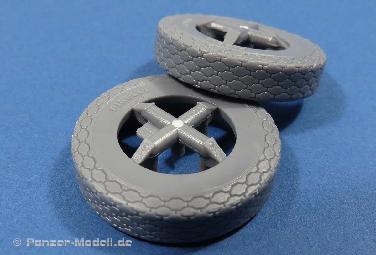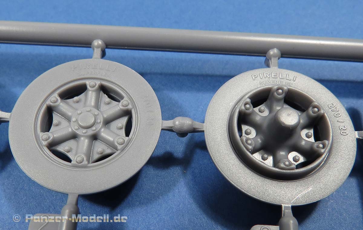 Die Räder setzen sich aus der Lauffläche mit dem Profil und einer Seitenwand zusammen, die mit erhabenem PIRELLI Herstelleraufdruck und Reifengröße schön detailliert sind. Das Ersatzrad besteht nur aus Felgentrommel und Lauffläche. Die Felgen sind mit entsprechenden Durchbrüchen versehen. Das Ersatzrad ruht in einem 3-teiligen Gestell am Heck des Rahmens. 2 PE Gurte sichern das Rad gegen Herausrutschen.