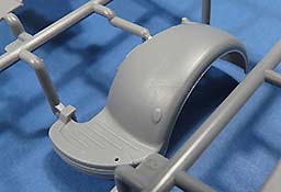 Die Motorhaube besteht aus den Seitenblechen mit Lüftungsrippen und den 2 Haubenteilen, die über ein schönes Scharnier verbunden werden. Die Aufteilung erlaubt eine geöffnete Darstellung der Motorhaube. Die Seitenteile erhalten je 3 Riegel aus PE-Teilen. Die Vorderräder werden von großen Kotflügeln mit nach vorn ausgestellten Trittflächen überdeckt. Auf den Trittflächen werden feine Begrenzungsstangen befestigt. Die ausgehöhlten Fahrscheinwerfer mit Klarsichtlinsen finden seitlich am Kühlerrahmen ihren Platz.
