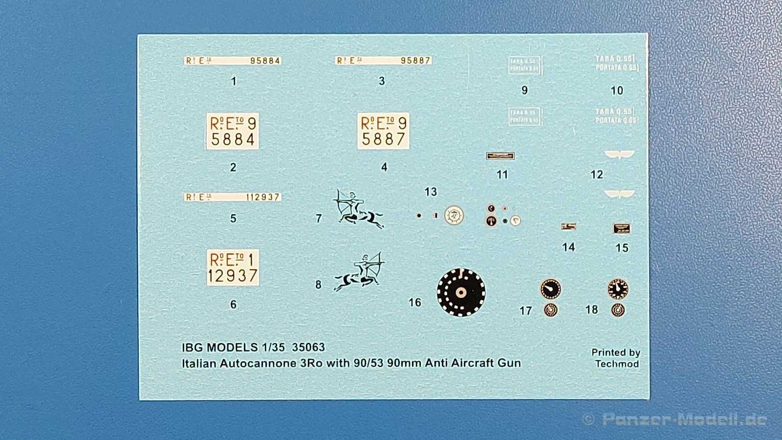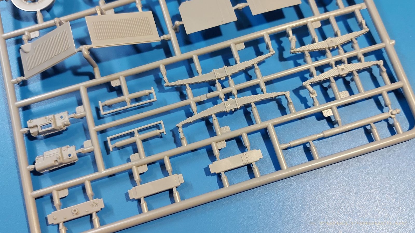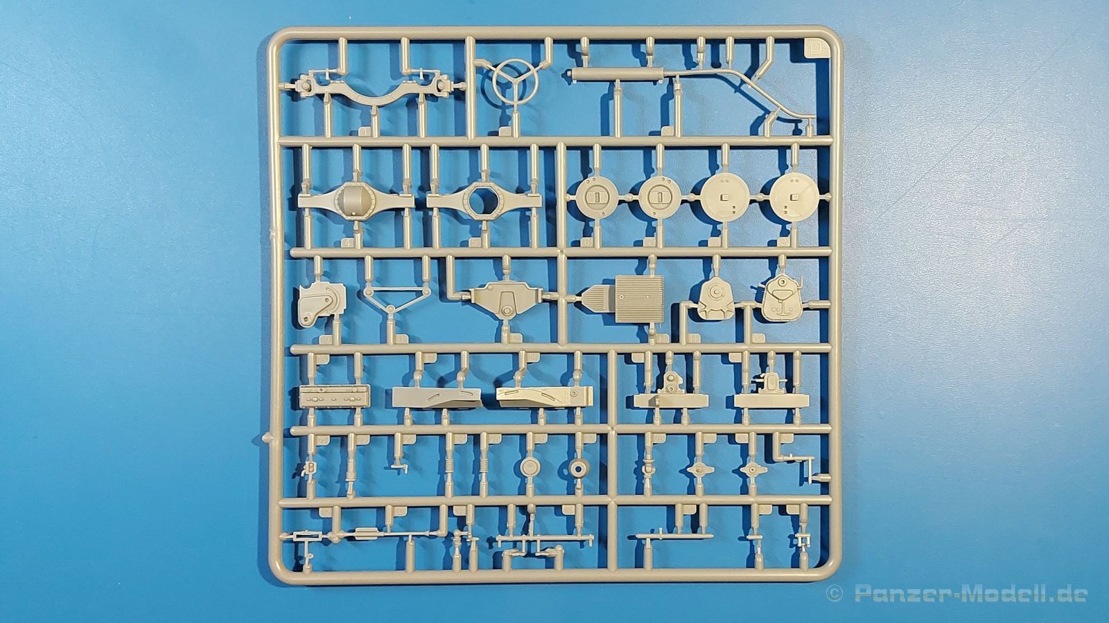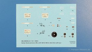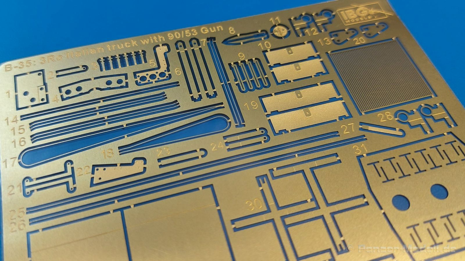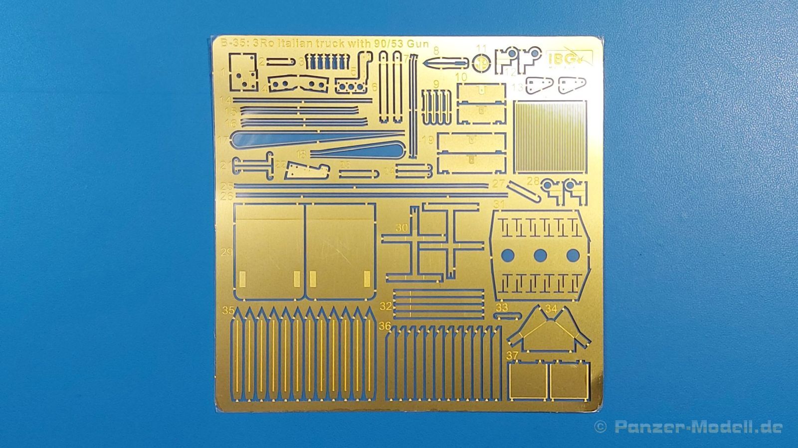 Das Original Der Lancia 3RO war ein schwerer, italienischer Lkw, basierend auf dem Lancia RO. Er wurde ab 1939 bis 1950 produziert und war bis in die 1960-er Jahre im Einsatz. Mit seinem 93 PS Motor konnte er bis zu 45 km/h erreichen. Der Lancia fand sowohl zivile als auch militärische Abnehmer. Als Truppentransporter konnte er bis zu 32 Soldaten transportieren. Es wurden aber auch Panzer und Pferde befördert. Umgebaute Fahrzeuge waren z.B. mit einer 100mm Haubitze oder einer 90mm Flugabwehrkanone ausgerüstet. Neben der italienischen Armee nutzte ihn auch die deutsche Wehrmacht. Für die Flugabwehrkanone Ansaldo 90/53 wurden die Leistungsmerkmale der deutschen 8,8 cm Flak und der amerikanischen M1 90mm Flak als Maßstab herangezogen. Sie wurde hauptsächlich als gezogenes Geschütz mit einer Kreuzlafette gebaut, aber einige Exemplare wurden auch Panzer- und Lkw-Fahrgestelle gesetzt. Der Bausatz: Basierend auf seinen hervorragenden 3Ro Bausätzen liefert uns IBG nun den umgebauten Lkw mit der 90mm Flak. Ganz offensichtlich der erste und einzige Bausatz dieses Fahrzeuges in Spritzguss. Der Stülpkarton ist 400 x 260 x 110 mm groß und enthält 16 graue, zwei klare Spritzlinge, 7 Plastikreifen, 1 PE-Platine, Decals und die Bauanleitung. Die Teile aus grauem Plastik machen einen guten Eindruck, sind sauber ausgespritzt, ohne Sinkstellen oder Versatz. Angüsse sind so gesetzt, dass Details nicht beeinträchtigt werden. Störende Auswerferspuren konnte ich jetzt nicht entdecken. Die Klarsichtteile für Scheiben und Scheinwerfer sind kristallklar, ohne Kratzer oder Schlieren. Auch bei diesem Lancia besteht der Rahmen aus separaten Längs- und Querträgern. Selbst ein weniger erfahrener Modellbauer sollte einen verwindungsfreien Rahmen hinbekommen, denn die Träger sind so geformt, dass sie nach dem Zusammenbau die entsprechende Stabilität gewährleisten. Es gibt sehr viele, teils aus PE bestehende, teils auch filigrane, Anbauteile, die alle ihren Platz finden wollen. Man sollte die Bauanleitung schon sehr ausgiebig studieren. In der Vorderachse sind bereits viele Details integriert, so dass nur noch ein paar Hebel und Gestänge angebaut werden müssen. Leider kann man die Räder nur in Geradeausstellung montieren, es sei denn, man entschließt sich zu „einschneidenden“ Änderungen an Radlager und Gestängen. Auch die Hinterachse ist gut detailliert. Zusätzliche Spiralfedern, Hebel und das schöne Kardangelenk sind hierbei anzusprechen, wenn auch letzteres bei der Montage der Kardanwelle fast vollständig unter einer Schutzkappe verschwindet. Wie auch bei den Vorgängermodellen sind die Bremsseile und Leitungen aus PE. Diese Extra-Details sind herausfordernd, aber auch lohnenswert! Die großen Blattfedern vorn wie hinten sind schön strukturiert. Auch wenn man auf den ersten Blick in den Karton der Meinung sein kann, dass man 7 gleiche Räder bekommt, so unterscheiden die sich durch ihr „Innenleben“. Die Lauffläche mit dem Profil und einer Seitenwand mit erhabenem PIRELLI Herstelleraufdruck und Reifengröße sind für alle gleich. Für die Vorderräder setzt man nur Felge mit Seitenwand und Lauffläche zusammen. Bei den Zwillingsreifen hinten besteht das innere Rad aus Felge und Lauffläche, das äußere aus Felgentrommel und Lauffläche. Das Ersatzrad besteht nur aus Felgentrommel und Lauffläche. Die Felgen sind mit entsprechenden Durchbrüchen versehen. Das Ersatzrad ruht in einem 3-teiligen Gestell am Heck des Rahmens. 2 PE Gurte sichern das Rad gegen Herausrutschen. Im vorderen Drittel des Rahmens sitzt das Getriebe, ausgestattet mit Kardanwelle, Öleinfüllstutzen und, über Umlenkrollen gelegte, PE-Drähte. Genoppte Trittbleche für das Fahrerhaus werden auch am Rahmen befestigt. Im hinteren Querträger sitzt die Anhängekupplung mit separatem Kupplungsbolzen, so dass man einen Anhänger ohne Schnitztechnik anhängen könnte, aber diese Version des 3Ro war wohl meist ohne unterwegs. Der mehrteilige Auspuff wird im Rahmen verlegt und mit einigen PE-Teilen gesichert. Der Dieselmotor ist ein kleines Modell für sich. Der hohe Motorblock des 5-Zylinder Diesel mit seinen Einspritzdüsen im Zylinderkopf fällt ebenso ins Auge wie die als Ölkühler ausgelegte und somit mit vielen Kühlrippen versehene Ölwanne. Lichtmaschine, Einspritzpumpe, Keilriemen, Lüfterrad, Zuluft- und Kühlleitungen, Abgaskrümmer und Öleinfüllstutzen sind weitere Details. Nach dem Einbau in den Rahmen wird der Motor mit dem dünnen, aber dennoch beidseitig detaillierten Kühler versehen. Das Fahrerhaus ist ein viele Einzelteile aufgebrochen. Die Rückwand hat außen etliche Versteifungsrippen und ist zur Geschützplattform hin offen ohne Scheiben. Innen wird die durchgehende Rückenlehne angebracht. Die schmalen Seitenwände haben um unteren Ende Stangen zur Aufhängung der Trittbleche. Hier sollte man beim Hantieren aufpassen, um die Stangen nicht bereits vor der Montage des Fahrerhauses auf dem Rahmen abzubrechen. Der Boden nimmt die einteilige Sitzbank auf, deren Darstellung aber eine Trennung zwischen Fahrer- und Beifahrersitz aufweist. Es macht den Eindruck, dass der Fahrer auf dem Tank sitzt, den rechts von seinem Sitz schaut ein Einfüllstutzen heraus. Schalt- und Handbremshebel werden ebenfalls auf den Boden geklebt. Die Fahrerhausfront ist auch beidseitig detailliert. Bereits angegossen sind die Halterungen mit den Winkern. Außen wird der Luftfilter mittels PE-Halterung montiert und über die Zuluftleitung mit dem Motor verbunden. Innen finden sich Kupplungs-, Brems- und Gaspedal, Lenkstange und -rad, Armaturentafel, kleine Bedienhebel und Haltebügel für den/die Beifahrer. Beidseitig detaillierte Türen können geöffnet oder geschlossen angebaut werden. Die äußeren Türgriffe werden separat angebracht. Beidseitig werden Außenspiegel (man achte auf die Details siehe Foto) und Suchscheinwerfer(?) angebracht. Das Dach, auch innen mit Struktur, schließt das Fahrerhaus nach oben hin ab. And