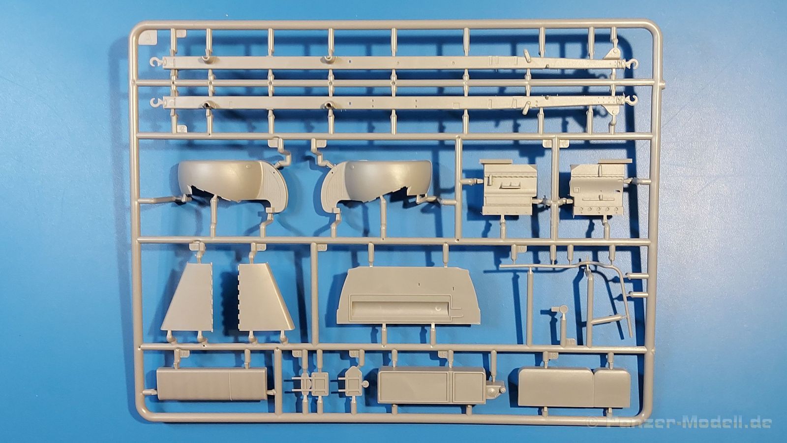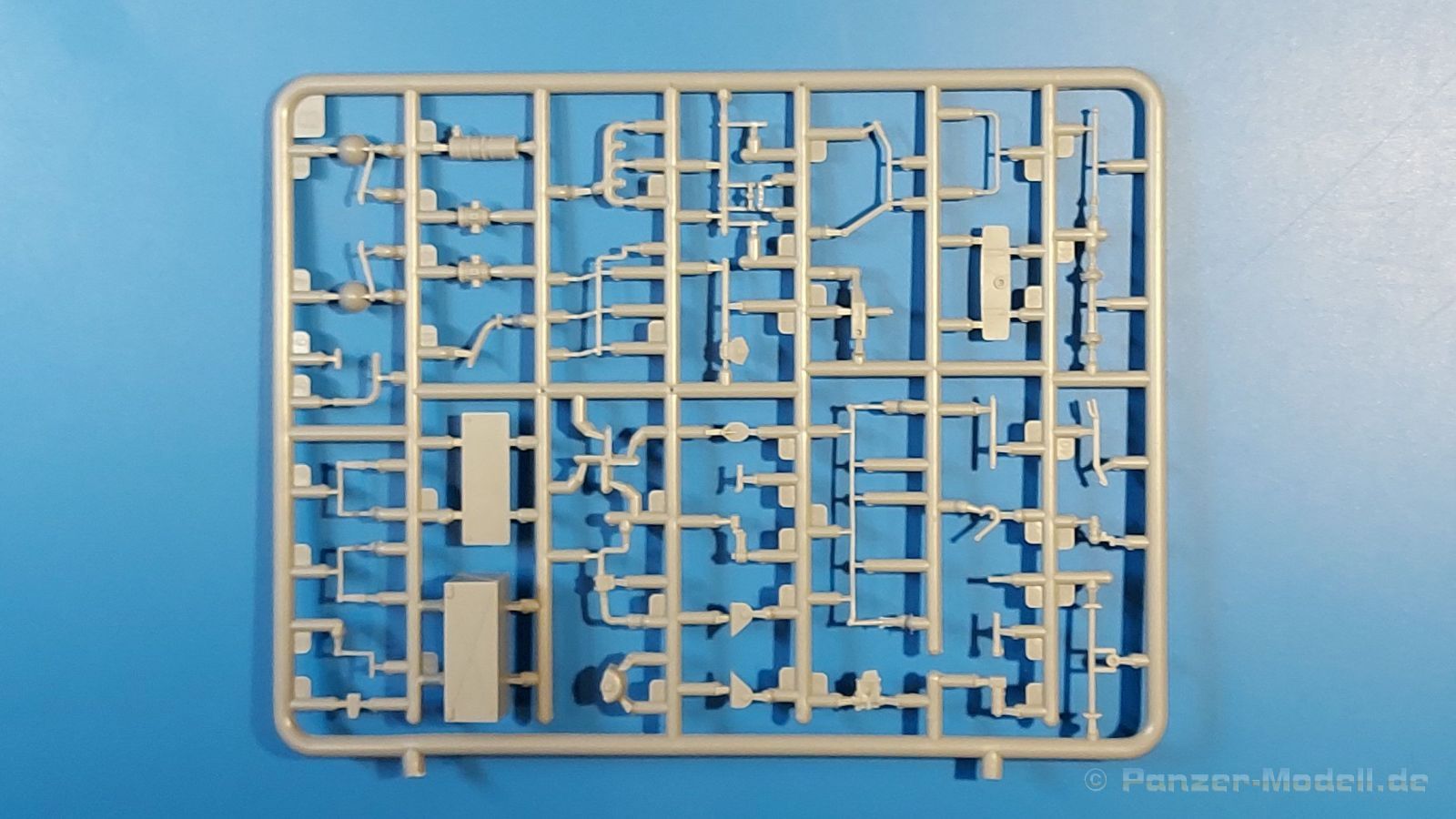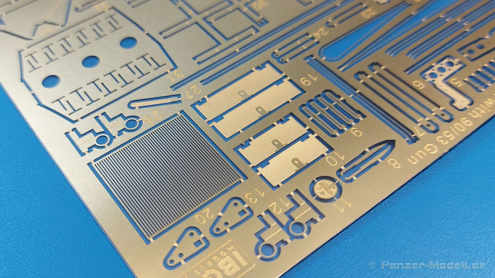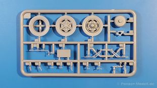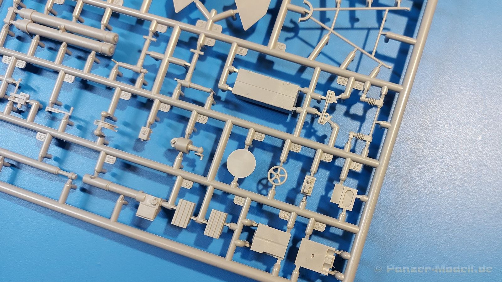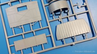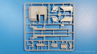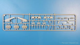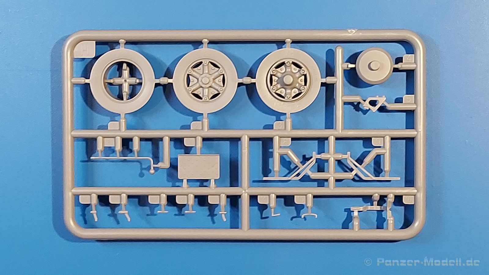 Das Original Der Lancia 3RO war ein schwerer, italienischer Lkw, basierend auf dem Lancia RO. Er wurde ab 1939 bis 1950 produziert und war bis in die 1960-er Jahre im Einsatz. Mit seinem 93 PS Motor konnte er bis zu 45 km/h erreichen. Der Lancia fand sowohl zivile als auch militärische Abnehmer. Als Truppentransporter konnte er bis zu 32 Soldaten transportieren. Es wurden aber auch Panzer und Pferde befördert. Umgebaute Fahrzeuge waren z.B. mit einer 100mm Haubitze oder einer 90mm Flugabwehrkanone ausgerüstet. Neben der italienischen Armee nutzte ihn auch die deutsche Wehrmacht. Für die Flugabwehrkanone Ansaldo 90/53 wurden die Leistungsmerkmale der deutschen 8,8 cm Flak und der amerikanischen M1 90mm Flak als Maßstab herangezogen. Sie wurde hauptsächlich als gezogenes Geschütz mit einer Kreuzlafette gebaut, aber einige Exemplare wurden auch Panzer- und Lkw-Fahrgestelle gesetzt. Der Bausatz: Basierend auf seinen hervorragenden 3Ro Bausätzen liefert uns IBG nun den umgebauten Lkw mit der 90mm Flak. Ganz offensichtlich der erste und einzige Bausatz dieses Fahrzeuges in Spritzguss. Der Stülpkarton ist 400 x 260 x 110 mm groß und enthält 16 graue, zwei klare Spritzlinge, 7 Plastikreifen, 1 PE-Platine, Decals und die Bauanleitung. Die Teile aus grauem Plastik machen einen guten Eindruck, sind sauber ausgespritzt, ohne Sinkstellen oder Versatz. Angüsse sind so gesetzt, dass Details nicht beeinträchtigt werden. Störende Auswerferspuren konnte ich jetzt nicht entdecken. Die Klarsichtteile für Scheiben und Scheinwerfer sind kristallklar, ohne Kratzer oder Schlieren. Auch bei diesem Lancia besteht der Rahmen aus separaten Längs- und Querträgern. Selbst ein weniger erfahrener Modellbauer sollte einen verwindungsfreien Rahmen hinbekommen, denn die Träger sind so geformt, dass sie nach dem Zusammenbau die entsprechende Stabilität gewährleisten. Es gibt sehr viele, teils aus PE bestehende, teils auch filigrane, Anbauteile, die alle ihren Platz finden wollen. Man sollte die Bauanleitung schon sehr ausgiebig studieren. In der Vorderachse sind bereits viele Details integriert, so dass nur noch ein paar Hebel und Gestänge angebaut werden müssen. Leider kann man die Räder nur in Geradeausstellung montieren, es sei denn, man entschließt sich zu „einschneidenden“ Änderungen an Radlager und Gestängen. Auch die Hinterachse ist gut detailliert. Zusätzliche Spiralfedern, Hebel und das schöne Kardangelenk sind hierbei anzusprechen, wenn auch letzteres bei der Montage der Kardanwelle fast vollständig unter einer Schutzkappe verschwindet. Wie auch bei den Vorgängermodellen sind die Bremsseile und Leitungen aus PE. Diese Extra-Details sind herausfordernd, aber auch lohnenswert! Die großen Blattfedern vorn wie hinten sind schön strukturiert. Auch wenn man auf den ersten Blick in den Karton der Meinung sein kann, dass man 7 gleiche Räder bekommt, so unterscheiden die sich durch ihr „Innenleben“. Die Lauffläche mit dem Profil und einer Seitenwand mit erhabenem PIRELLI Herstelleraufdruck und Reifengröße sind für alle gleich. Für die Vorderräder setzt man nur Felge mit Seitenwand und Lauffläche zusammen. Bei den Zwillingsreifen hinten besteht das innere Rad aus Felge und Lauffläche, das äußere aus Felgentrommel und Lauffläche. Das Ersatzrad besteht nur aus Felgentrommel und Lauffläche. Die Felgen sind mit entsprechenden Durchbrüchen versehen. Das Ersatzrad ruht in einem 3-teiligen Gestell am Heck des Rahmens. 2 PE Gurte sichern das Rad gegen Herausrutschen. Im vorderen Drittel des Rahmens sitzt das Getriebe, ausgestattet mit Kardanwelle, Öleinfüllstutzen und, über Umlenkrollen gelegte, PE-Drähte. Genoppte Trittbleche für das Fahrerhaus werden auch am Rahmen befestigt. Im hinteren Querträger sitzt die Anhängekupplung mit separatem Kupplungsbolzen, so dass man einen Anhänger ohne Schnitztechnik anhängen könnte, aber diese Version des 3Ro war wohl meist ohne unterwegs. Der mehrteilige Auspuff wird im Rahmen verlegt und mit einigen PE-Teilen gesichert. Der Dieselmotor ist ein kleines Modell für sich. Der hohe Motorblock des 5-Zylinder Diesel mit seinen Einspritzdüsen im Zylinderkopf fällt ebenso ins Auge wie die als Ölkühler ausgelegte und somit mit vielen Kühlrippen versehene Ölwanne. Lichtmaschine, Einspritzpumpe, Keilriemen, Lüfterrad, Zuluft- und Kühlleitungen, Abgaskrümmer und Öleinfüllstutzen sind weitere Details. Nach dem Einbau in den Rahmen wird der Motor mit dem dünnen, aber dennoch beidseitig detaillierten Kühler versehen. Das Fahrerhaus ist ein viele Einzelteile aufgebrochen. Die Rückwand hat außen etliche Versteifungsrippen und ist zur Geschützplattform hin offen ohne Scheiben. Innen wird die durchgehende Rückenlehne angebracht. Die schmalen Seitenwände haben um unteren Ende Stangen zur Aufhängung der Trittbleche. Hier sollte man beim Hantieren aufpassen, um die Stangen nicht bereits vor der Montage des Fahrerhauses auf dem Rahmen abzubrechen. Der Boden nimmt die einteilige Sitzbank auf, deren Darstellung aber eine Trennung zwischen Fahrer- und Beifahrersitz aufweist. Es macht den Eindruck, dass der Fahrer auf dem Tank sitzt, den rechts von seinem Sitz schaut ein Einfüllstutzen heraus. Schalt- und Handbremshebel werden ebenfalls auf den Boden geklebt. Die Fahrerhausfront ist auch beidseitig detailliert. Bereits angegossen sind die Halterungen mit den Winkern. Außen wird der Luftfilter mittels PE-Halterung montiert und über die Zuluftleitung mit dem Motor verbunden. Innen finden sich Kupplungs-, Brems- und Gaspedal, Lenkstange und -rad, Armaturentafel, kleine Bedienhebel und Haltebügel für den/die Beifahrer. Beidseitig detaillierte Türen können geöffnet oder geschlossen angebaut werden. Die äußeren Türgriffe werden separat angebracht. Beidseitig werden Außenspiegel (man achte auf die Details siehe Foto) und Suchscheinwerfer(?) angebracht. Das Dach, auch innen mit Struktur, schließt das Fahrerhaus nach oben hin ab. And