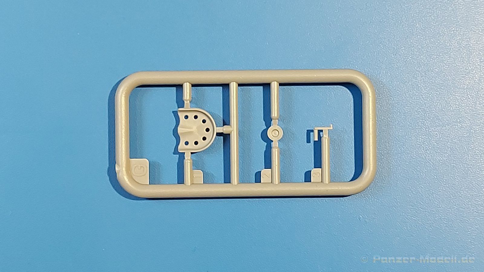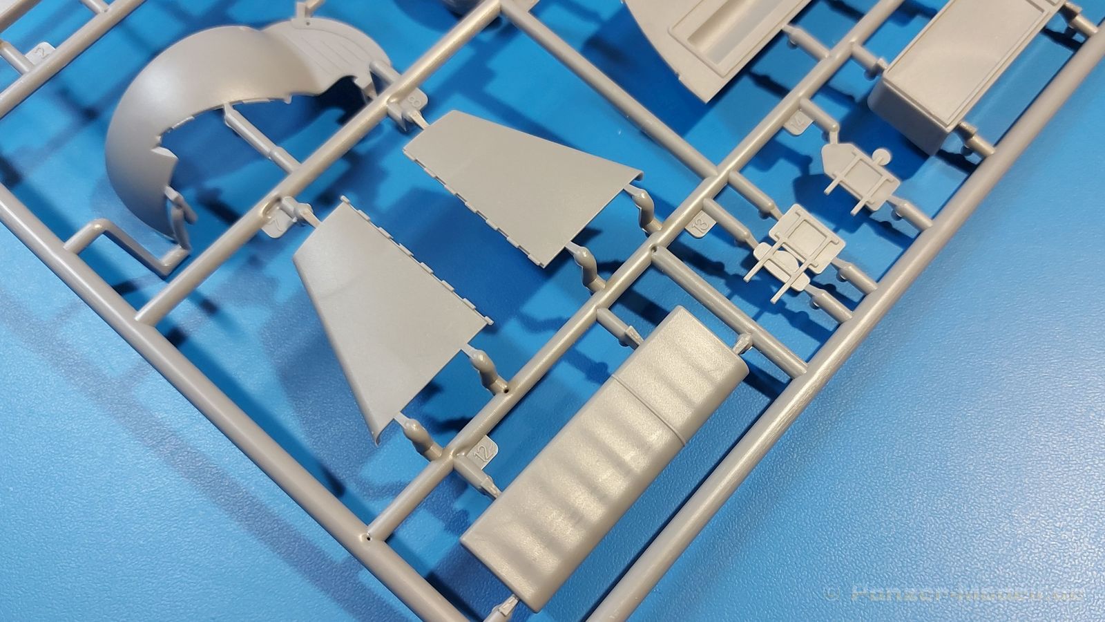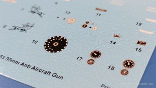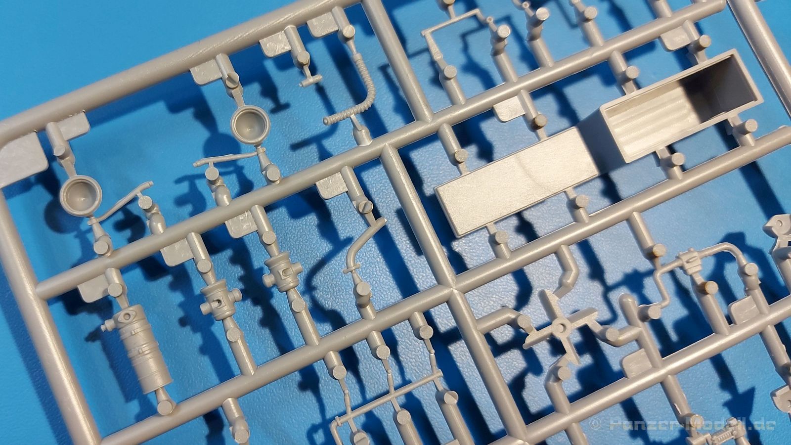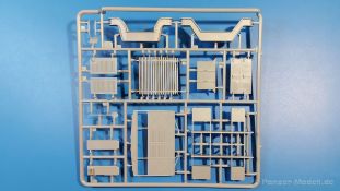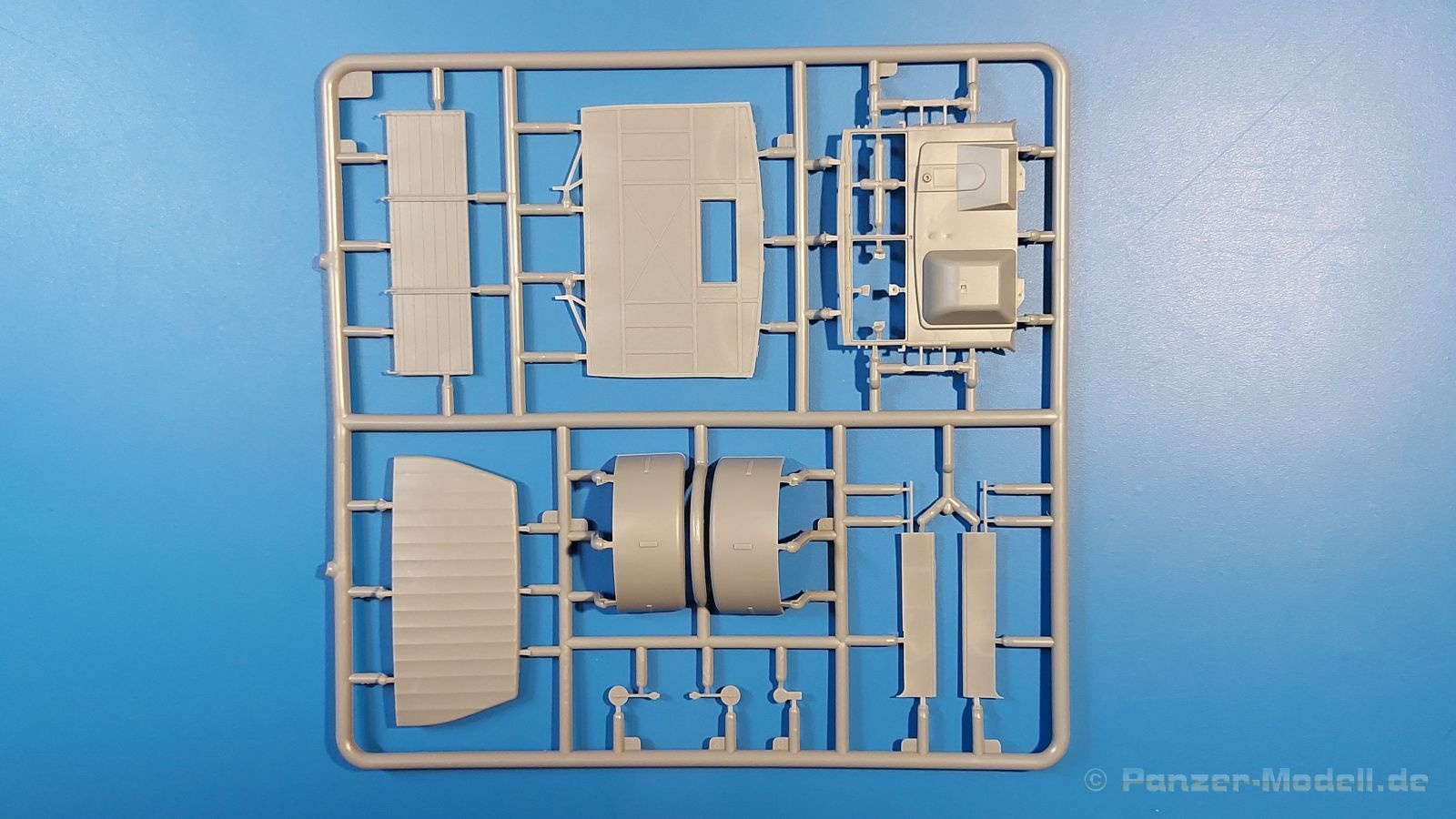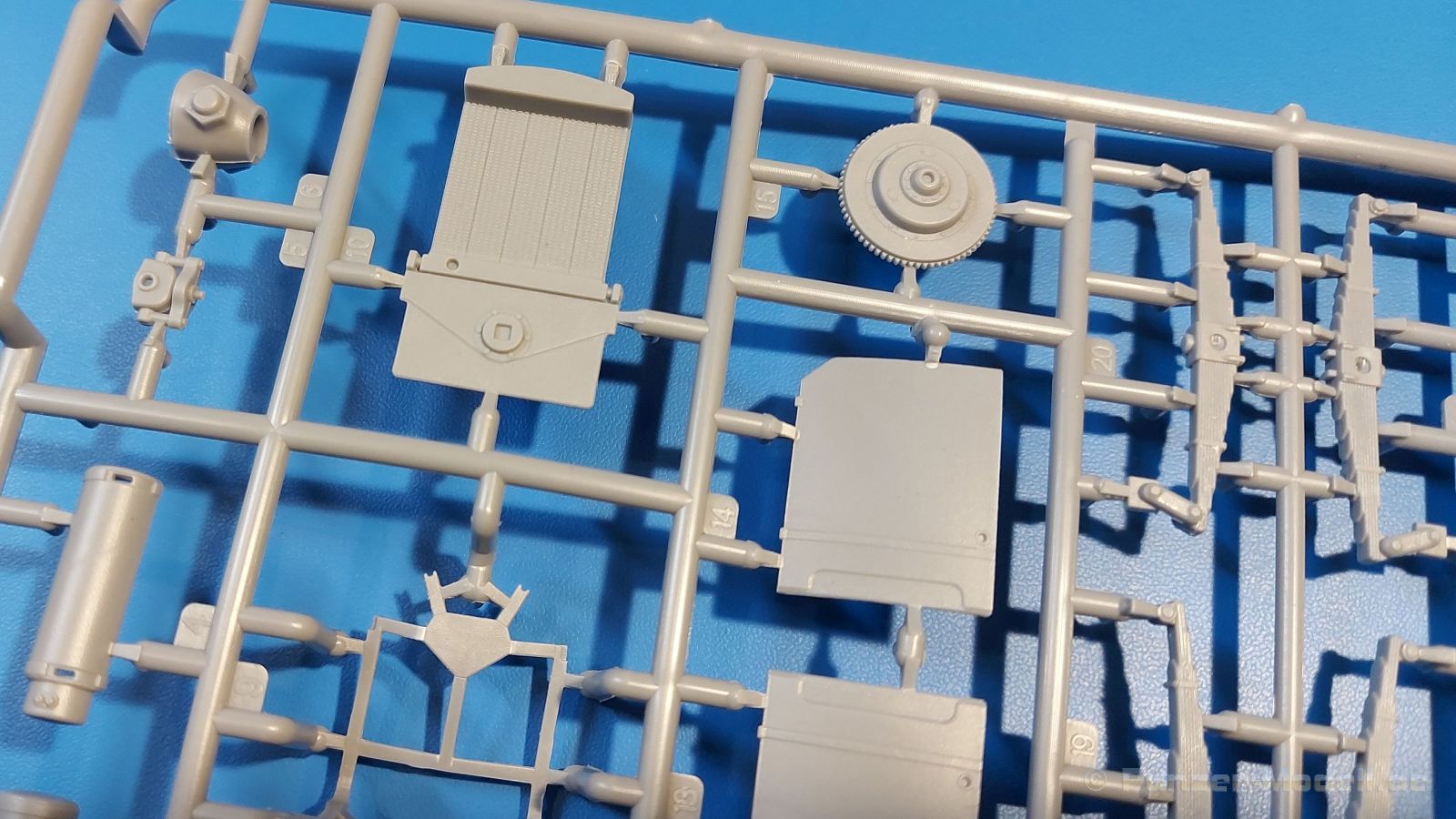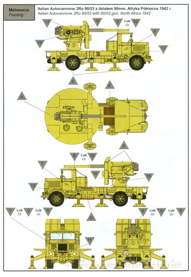 Das Original Der Lancia 3RO war ein schwerer, italienischer Lkw, basierend auf dem Lancia RO. Er wurde ab 1939 bis 1950 produziert und war bis in die 1960-er Jahre im Einsatz. Mit seinem 93 PS Motor konnte er bis zu 45 km/h erreichen. Der Lancia fand sowohl zivile als auch militärische Abnehmer. Als Truppentransporter konnte er bis zu 32 Soldaten transportieren. Es wurden aber auch Panzer und Pferde befördert. Umgebaute Fahrzeuge waren z.B. mit einer 100mm Haubitze oder einer 90mm Flugabwehrkanone ausgerüstet. Neben der italienischen Armee nutzte ihn auch die deutsche Wehrmacht. Für die Flugabwehrkanone Ansaldo 90/53 wurden die Leistungsmerkmale der deutschen 8,8 cm Flak und der amerikanischen M1 90mm Flak als Maßstab herangezogen. Sie wurde hauptsächlich als gezogenes Geschütz mit einer Kreuzlafette gebaut, aber einige Exemplare wurden auch Panzer- und Lkw-Fahrgestelle gesetzt. Der Bausatz: Basierend auf seinen hervorragenden 3Ro Bausätzen liefert uns IBG nun den umgebauten Lkw mit der 90mm Flak. Ganz offensichtlich der erste und einzige Bausatz dieses Fahrzeuges in Spritzguss. Der Stülpkarton ist 400 x 260 x 110 mm groß und enthält 16 graue, zwei klare Spritzlinge, 7 Plastikreifen, 1 PE-Platine, Decals und die Bauanleitung. Die Teile aus grauem Plastik machen einen guten Eindruck, sind sauber ausgespritzt, ohne Sinkstellen oder Versatz. Angüsse sind so gesetzt, dass Details nicht beeinträchtigt werden. Störende Auswerferspuren konnte ich jetzt nicht entdecken. Die Klarsichtteile für Scheiben und Scheinwerfer sind kristallklar, ohne Kratzer oder Schlieren. Auch bei diesem Lancia besteht der Rahmen aus separaten Längs- und Querträgern. Selbst ein weniger erfahrener Modellbauer sollte einen verwindungsfreien Rahmen hinbekommen, denn die Träger sind so geformt, dass sie nach dem Zusammenbau die entsprechende Stabilität gewährleisten. Es gibt sehr viele, teils aus PE bestehende, teils auch filigrane, Anbauteile, die alle ihren Platz finden wollen. Man sollte die Bauanleitung schon sehr ausgiebig studieren. In der Vorderachse sind bereits viele Details integriert, so dass nur noch ein paar Hebel und Gestänge angebaut werden müssen. Leider kann man die Räder nur in Geradeausstellung montieren, es sei denn, man entschließt sich zu „einschneidenden“ Änderungen an Radlager und Gestängen. Auch die Hinterachse ist gut detailliert. Zusätzliche Spiralfedern, Hebel und das schöne Kardangelenk sind hierbei anzusprechen, wenn auch letzteres bei der Montage der Kardanwelle fast vollständig unter einer Schutzkappe verschwindet. Wie auch bei den Vorgängermodellen sind die Bremsseile und Leitungen aus PE. Diese Extra-Details sind herausfordernd, aber auch lohnenswert! Die großen Blattfedern vorn wie hinten sind schön strukturiert. Auch wenn man auf den ersten Blick in den Karton der Meinung sein kann, dass man 7 gleiche Räder bekommt, so unterscheiden die sich durch ihr „Innenleben“. Die Lauffläche mit dem Profil und einer Seitenwand mit erhabenem PIRELLI Herstelleraufdruck und Reifengröße sind für alle gleich. Für die Vorderräder setzt man nur Felge mit Seitenwand und Lauffläche zusammen. Bei den Zwillingsreifen hinten besteht das innere Rad aus Felge und Lauffläche, das äußere aus Felgentrommel und Lauffläche. Das Ersatzrad besteht nur aus Felgentrommel und Lauffläche. Die Felgen sind mit entsprechenden Durchbrüchen versehen. Das Ersatzrad ruht in einem 3-teiligen Gestell am Heck des Rahmens. 2 PE Gurte sichern das Rad gegen Herausrutschen. Im vorderen Drittel des Rahmens sitzt das Getriebe, ausgestattet mit Kardanwelle, Öleinfüllstutzen und, über Umlenkrollen gelegte, PE-Drähte. Genoppte Trittbleche für das Fahrerhaus werden auch am Rahmen befestigt. Im hinteren Querträger sitzt die Anhängekupplung mit separatem Kupplungsbolzen, so dass man einen Anhänger ohne Schnitztechnik anhängen könnte, aber diese Version des 3Ro war wohl meist ohne unterwegs. Der mehrteilige Auspuff wird im Rahmen verlegt und mit einigen PE-Teilen gesichert. Der Dieselmotor ist ein kleines Modell für sich. Der hohe Motorblock des 5-Zylinder Diesel mit seinen Einspritzdüsen im Zylinderkopf fällt ebenso ins Auge wie die als Ölkühler ausgelegte und somit mit vielen Kühlrippen versehene Ölwanne. Lichtmaschine, Einspritzpumpe, Keilriemen, Lüfterrad, Zuluft- und Kühlleitungen, Abgaskrümmer und Öleinfüllstutzen sind weitere Details. Nach dem Einbau in den Rahmen wird der Motor mit dem dünnen, aber dennoch beidseitig detaillierten Kühler versehen. Das Fahrerhaus ist ein viele Einzelteile aufgebrochen. Die Rückwand hat außen etliche Versteifungsrippen und ist zur Geschützplattform hin offen ohne Scheiben. Innen wird die durchgehende Rückenlehne angebracht. Die schmalen Seitenwände haben um unteren Ende Stangen zur Aufhängung der Trittbleche. Hier sollte man beim Hantieren aufpassen, um die Stangen nicht bereits vor der Montage des Fahrerhauses auf dem Rahmen abzubrechen. Der Boden nimmt die einteilige Sitzbank auf, deren Darstellung aber eine Trennung zwischen Fahrer- und Beifahrersitz aufweist. Es macht den Eindruck, dass der Fahrer auf dem Tank sitzt, den rechts von seinem Sitz schaut ein Einfüllstutzen heraus. Schalt- und Handbremshebel werden ebenfalls auf den Boden geklebt. Die Fahrerhausfront ist auch beidseitig detailliert. Bereits angegossen sind die Halterungen mit den Winkern. Außen wird der Luftfilter mittels PE-Halterung montiert und über die Zuluftleitung mit dem Motor verbunden. Innen finden sich Kupplungs-, Brems- und Gaspedal, Lenkstange und -rad, Armaturentafel, kleine Bedienhebel und Haltebügel für den/die Beifahrer. Beidseitig detaillierte Türen können geöffnet oder geschlossen angebaut werden. Die äußeren Türgriffe werden separat angebracht. Beidseitig werden Außenspiegel (man achte auf die Details siehe Foto) und Suchscheinwerfer(?) angebracht. Das Dach, auch innen mit Struktur, schließt das Fahrerhaus nach oben hin ab. And