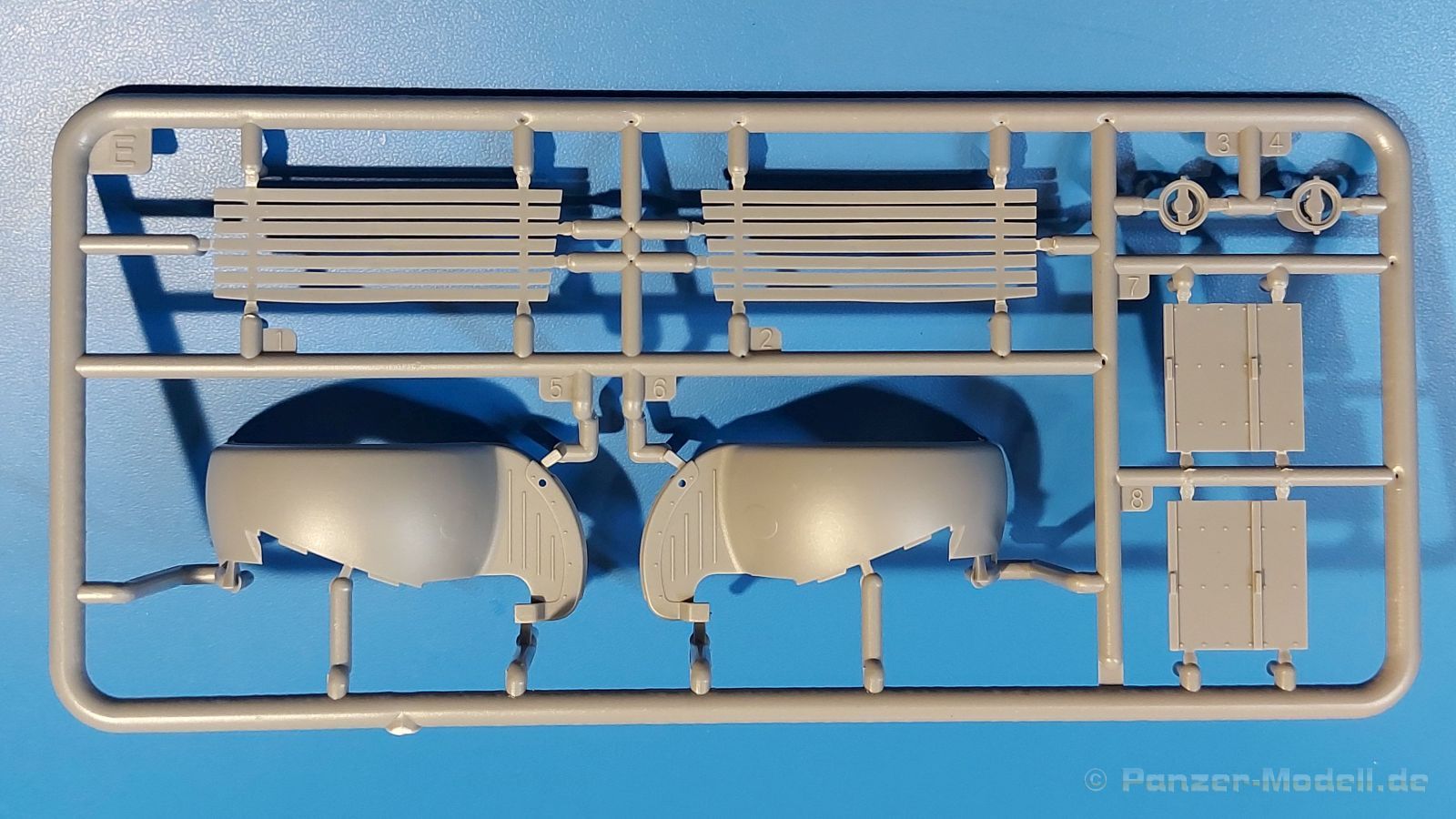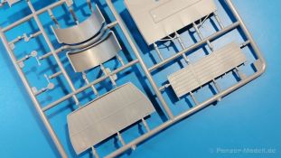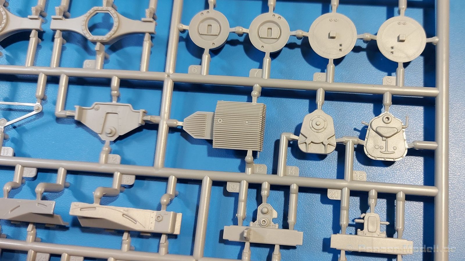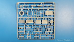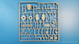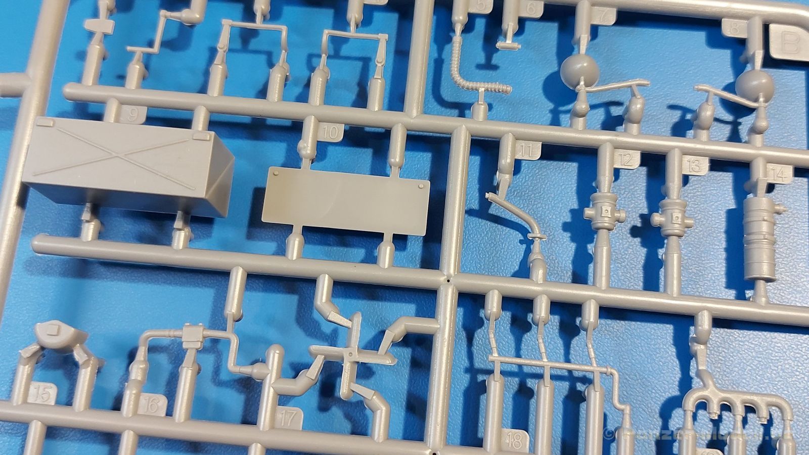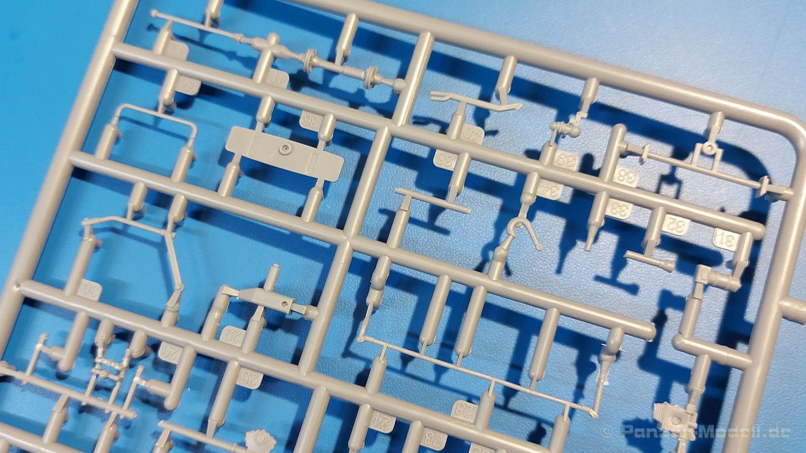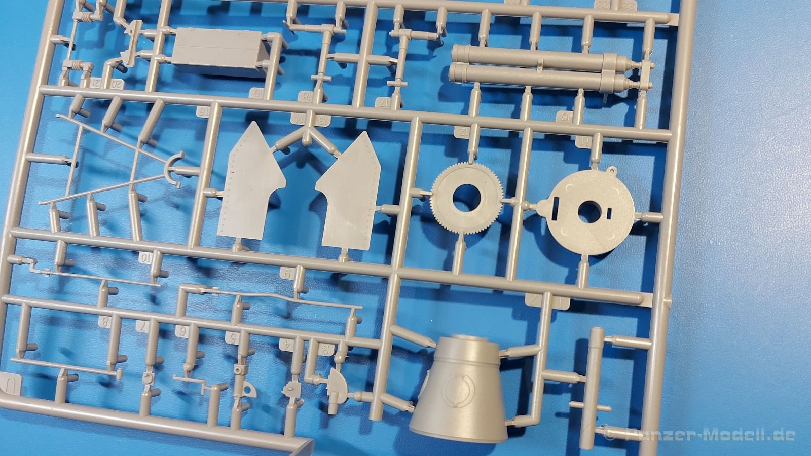 Das Original Der Lancia 3RO war ein schwerer, italienischer Lkw, basierend auf dem Lancia RO. Er wurde ab 1939 bis 1950 produziert und war bis in die 1960-er Jahre im Einsatz. Mit seinem 93 PS Motor konnte er bis zu 45 km/h erreichen. Der Lancia fand sowohl zivile als auch militärische Abnehmer. Als Truppentransporter konnte er bis zu 32 Soldaten transportieren. Es wurden aber auch Panzer und Pferde befördert. Umgebaute Fahrzeuge waren z.B. mit einer 100mm Haubitze oder einer 90mm Flugabwehrkanone ausgerüstet. Neben der italienischen Armee nutzte ihn auch die deutsche Wehrmacht. Für die Flugabwehrkanone Ansaldo 90/53 wurden die Leistungsmerkmale der deutschen 8,8 cm Flak und der amerikanischen M1 90mm Flak als Maßstab herangezogen. Sie wurde hauptsächlich als gezogenes Geschütz mit einer Kreuzlafette gebaut, aber einige Exemplare wurden auch Panzer- und Lkw-Fahrgestelle gesetzt. Der Bausatz: Basierend auf seinen hervorragenden 3Ro Bausätzen liefert uns IBG nun den umgebauten Lkw mit der 90mm Flak. Ganz offensichtlich der erste und einzige Bausatz dieses Fahrzeuges in Spritzguss. Der Stülpkarton ist 400 x 260 x 110 mm groß und enthält 16 graue, zwei klare Spritzlinge, 7 Plastikreifen, 1 PE-Platine, Decals und die Bauanleitung. Die Teile aus grauem Plastik machen einen guten Eindruck, sind sauber ausgespritzt, ohne Sinkstellen oder Versatz. Angüsse sind so gesetzt, dass Details nicht beeinträchtigt werden. Störende Auswerferspuren konnte ich jetzt nicht entdecken. Die Klarsichtteile für Scheiben und Scheinwerfer sind kristallklar, ohne Kratzer oder Schlieren. Auch bei diesem Lancia besteht der Rahmen aus separaten Längs- und Querträgern. Selbst ein weniger erfahrener Modellbauer sollte einen verwindungsfreien Rahmen hinbekommen, denn die Träger sind so geformt, dass sie nach dem Zusammenbau die entsprechende Stabilität gewährleisten. Es gibt sehr viele, teils aus PE bestehende, teils auch filigrane, Anbauteile, die alle ihren Platz finden wollen. Man sollte die Bauanleitung schon sehr ausgiebig studieren. In der Vorderachse sind bereits viele Details integriert, so dass nur noch ein paar Hebel und Gestänge angebaut werden müssen. Leider kann man die Räder nur in Geradeausstellung montieren, es sei denn, man entschließt sich zu „einschneidenden“ Änderungen an Radlager und Gestängen. Auch die Hinterachse ist gut detailliert. Zusätzliche Spiralfedern, Hebel und das schöne Kardangelenk sind hierbei anzusprechen, wenn auch letzteres bei der Montage der Kardanwelle fast vollständig unter einer Schutzkappe verschwindet. Wie auch bei den Vorgängermodellen sind die Bremsseile und Leitungen aus PE. Diese Extra-Details sind herausfordernd, aber auch lohnenswert! Die großen Blattfedern vorn wie hinten sind schön strukturiert. Auch wenn man auf den ersten Blick in den Karton der Meinung sein kann, dass man 7 gleiche Räder bekommt, so unterscheiden die sich durch ihr „Innenleben“. Die Lauffläche mit dem Profil und einer Seitenwand mit erhabenem PIRELLI Herstelleraufdruck und Reifengröße sind für alle gleich. Für die Vorderräder setzt man nur Felge mit Seitenwand und Lauffläche zusammen. Bei den Zwillingsreifen hinten besteht das innere Rad aus Felge und Lauffläche, das äußere aus Felgentrommel und Lauffläche. Das Ersatzrad besteht nur aus Felgentrommel und Lauffläche. Die Felgen sind mit entsprechenden Durchbrüchen versehen. Das Ersatzrad ruht in einem 3-teiligen Gestell am Heck des Rahmens. 2 PE Gurte sichern das Rad gegen Herausrutschen. Im vorderen Drittel des Rahmens sitzt das Getriebe, ausgestattet mit Kardanwelle, Öleinfüllstutzen und, über Umlenkrollen gelegte, PE-Drähte. Genoppte Trittbleche für das Fahrerhaus werden auch am Rahmen befestigt. Im hinteren Querträger sitzt die Anhängekupplung mit separatem Kupplungsbolzen, so dass man einen Anhänger ohne Schnitztechnik anhängen könnte, aber diese Version des 3Ro war wohl meist ohne unterwegs. Der mehrteilige Auspuff wird im Rahmen verlegt und mit einigen PE-Teilen gesichert. Der Dieselmotor ist ein kleines Modell für sich. Der hohe Motorblock des 5-Zylinder Diesel mit seinen Einspritzdüsen im Zylinderkopf fällt ebenso ins Auge wie die als Ölkühler ausgelegte und somit mit vielen Kühlrippen versehene Ölwanne. Lichtmaschine, Einspritzpumpe, Keilriemen, Lüfterrad, Zuluft- und Kühlleitungen, Abgaskrümmer und Öleinfüllstutzen sind weitere Details. Nach dem Einbau in den Rahmen wird der Motor mit dem dünnen, aber dennoch beidseitig detaillierten Kühler versehen. Das Fahrerhaus ist ein viele Einzelteile aufgebrochen. Die Rückwand hat außen etliche Versteifungsrippen und ist zur Geschützplattform hin offen ohne Scheiben. Innen wird die durchgehende Rückenlehne angebracht. Die schmalen Seitenwände haben um unteren Ende Stangen zur Aufhängung der Trittbleche. Hier sollte man beim Hantieren aufpassen, um die Stangen nicht bereits vor der Montage des Fahrerhauses auf dem Rahmen abzubrechen. Der Boden nimmt die einteilige Sitzbank auf, deren Darstellung aber eine Trennung zwischen Fahrer- und Beifahrersitz aufweist. Es macht den Eindruck, dass der Fahrer auf dem Tank sitzt, den rechts von seinem Sitz schaut ein Einfüllstutzen heraus. Schalt- und Handbremshebel werden ebenfalls auf den Boden geklebt. Die Fahrerhausfront ist auch beidseitig detailliert. Bereits angegossen sind die Halterungen mit den Winkern. Außen wird der Luftfilter mittels PE-Halterung montiert und über die Zuluftleitung mit dem Motor verbunden. Innen finden sich Kupplungs-, Brems- und Gaspedal, Lenkstange und -rad, Armaturentafel, kleine Bedienhebel und Haltebügel für den/die Beifahrer. Beidseitig detaillierte Türen können geöffnet oder geschlossen angebaut werden. Die äußeren Türgriffe werden separat angebracht. Beidseitig werden Außenspiegel (man achte auf die Details siehe Foto) und Suchscheinwerfer(?) angebracht. Das Dach, auch innen mit Struktur, schließt das Fahrerhaus nach oben hin ab. And
