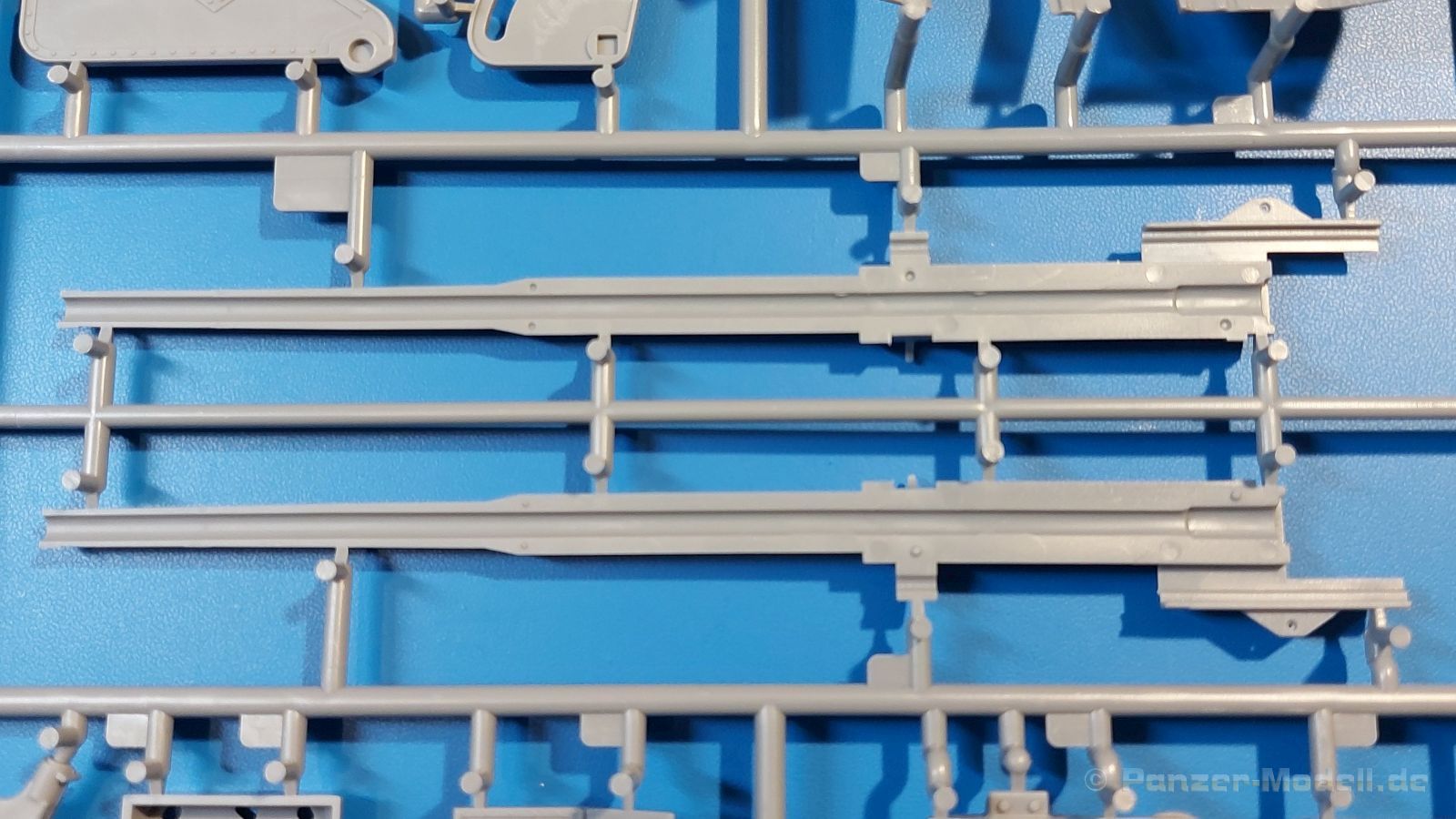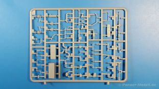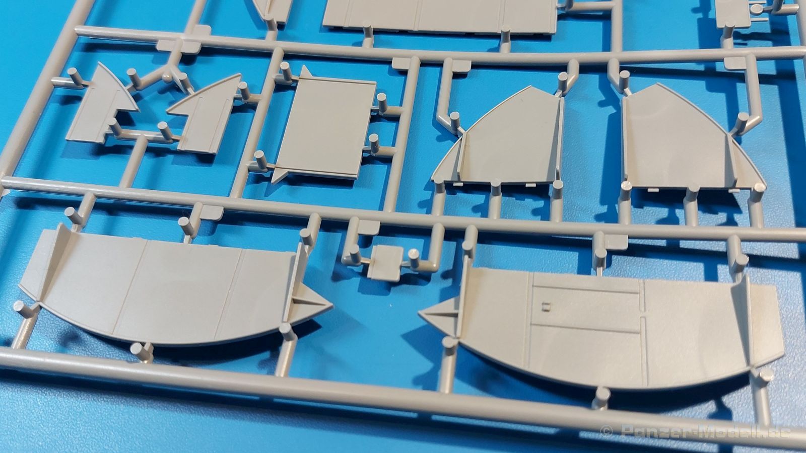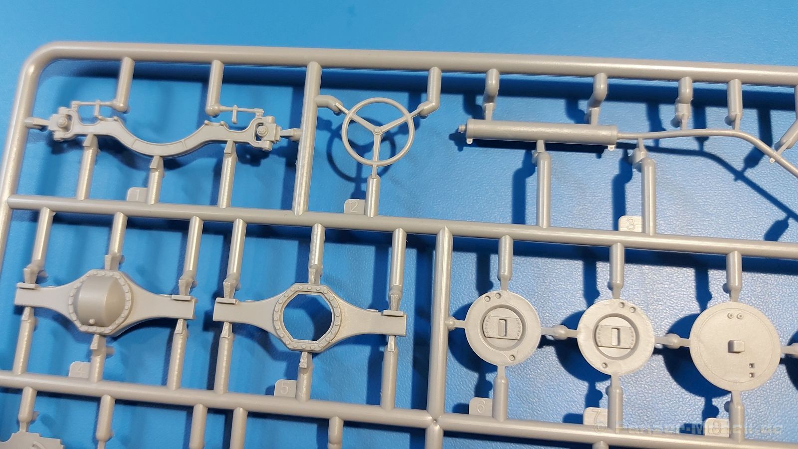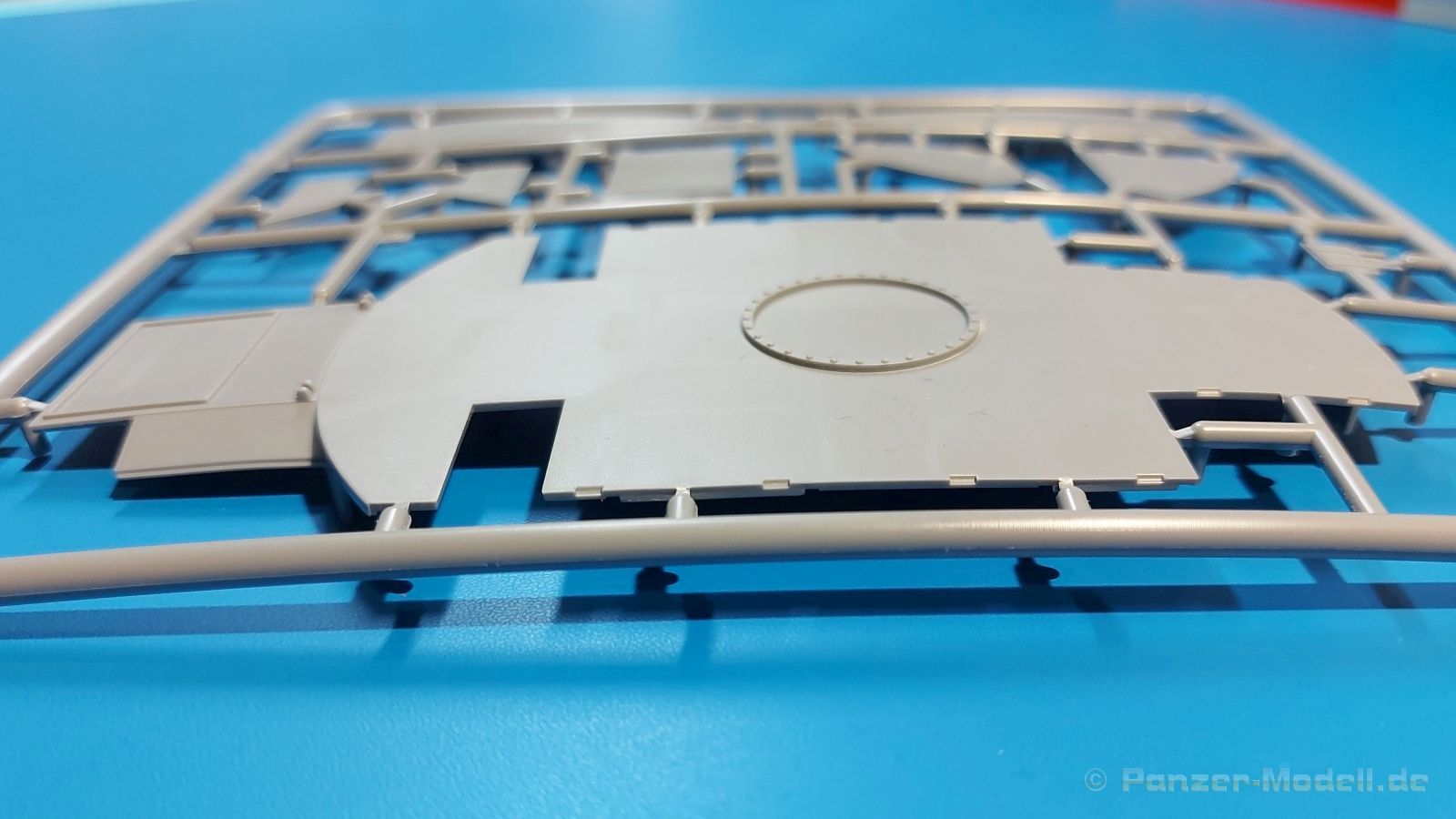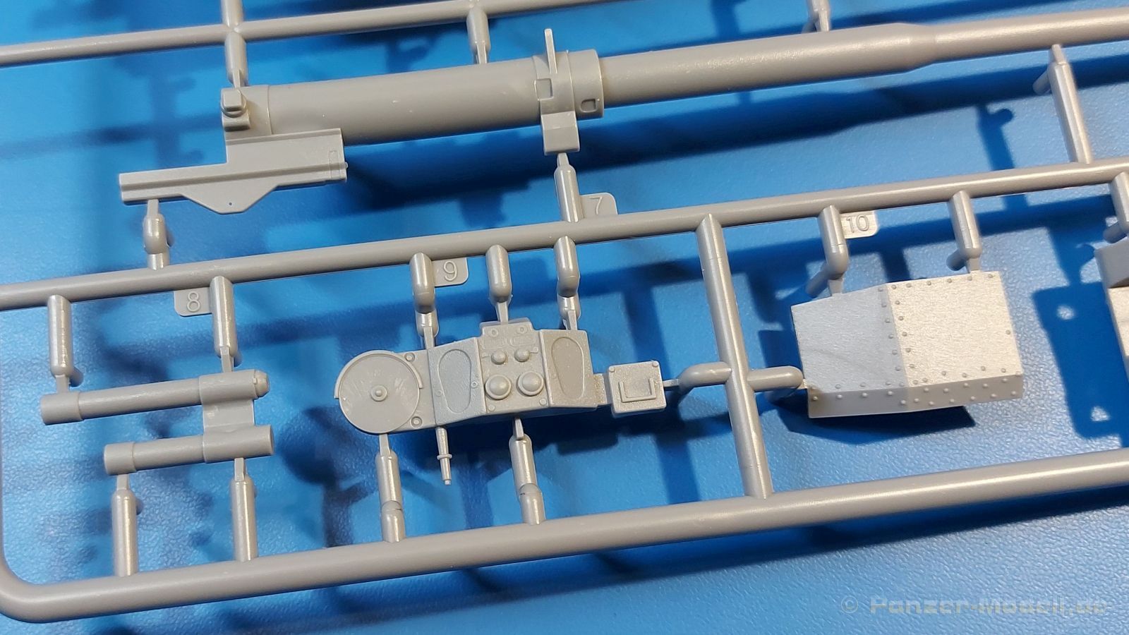 Das Original Der Lancia 3RO war ein schwerer, italienischer Lkw, basierend auf dem Lancia RO. Er wurde ab 1939 bis 1950 produziert und war bis in die 1960-er Jahre im Einsatz. Mit seinem 93 PS Motor konnte er bis zu 45 km/h erreichen. Der Lancia fand sowohl zivile als auch militärische Abnehmer. Als Truppentransporter konnte er bis zu 32 Soldaten transportieren. Es wurden aber auch Panzer und Pferde befördert. Umgebaute Fahrzeuge waren z.B. mit einer 100mm Haubitze oder einer 90mm Flugabwehrkanone ausgerüstet. Neben der italienischen Armee nutzte ihn auch die deutsche Wehrmacht. Für die Flugabwehrkanone Ansaldo 90/53 wurden die Leistungsmerkmale der deutschen 8,8 cm Flak und der amerikanischen M1 90mm Flak als Maßstab herangezogen. Sie wurde hauptsächlich als gezogenes Geschütz mit einer Kreuzlafette gebaut, aber einige Exemplare wurden auch Panzer- und Lkw-Fahrgestelle gesetzt. Der Bausatz: Basierend auf seinen hervorragenden 3Ro Bausätzen liefert uns IBG nun den umgebauten Lkw mit der 90mm Flak. Ganz offensichtlich der erste und einzige Bausatz dieses Fahrzeuges in Spritzguss. Der Stülpkarton ist 400 x 260 x 110 mm groß und enthält 16 graue, zwei klare Spritzlinge, 7 Plastikreifen, 1 PE-Platine, Decals und die Bauanleitung. Die Teile aus grauem Plastik machen einen guten Eindruck, sind sauber ausgespritzt, ohne Sinkstellen oder Versatz. Angüsse sind so gesetzt, dass Details nicht beeinträchtigt werden. Störende Auswerferspuren konnte ich jetzt nicht entdecken. Die Klarsichtteile für Scheiben und Scheinwerfer sind kristallklar, ohne Kratzer oder Schlieren. Auch bei diesem Lancia besteht der Rahmen aus separaten Längs- und Querträgern. Selbst ein weniger erfahrener Modellbauer sollte einen verwindungsfreien Rahmen hinbekommen, denn die Träger sind so geformt, dass sie nach dem Zusammenbau die entsprechende Stabilität gewährleisten. Es gibt sehr viele, teils aus PE bestehende, teils auch filigrane, Anbauteile, die alle ihren Platz finden wollen. Man sollte die Bauanleitung schon sehr ausgiebig studieren. In der Vorderachse sind bereits viele Details integriert, so dass nur noch ein paar Hebel und Gestänge angebaut werden müssen. Leider kann man die Räder nur in Geradeausstellung montieren, es sei denn, man entschließt sich zu „einschneidenden“ Änderungen an Radlager und Gestängen. Auch die Hinterachse ist gut detailliert. Zusätzliche Spiralfedern, Hebel und das schöne Kardangelenk sind hierbei anzusprechen, wenn auch letzteres bei der Montage der Kardanwelle fast vollständig unter einer Schutzkappe verschwindet. Wie auch bei den Vorgängermodellen sind die Bremsseile und Leitungen aus PE. Diese Extra-Details sind herausfordernd, aber auch lohnenswert! Die großen Blattfedern vorn wie hinten sind schön strukturiert. Auch wenn man auf den ersten Blick in den Karton der Meinung sein kann, dass man 7 gleiche Räder bekommt, so unterscheiden die sich durch ihr „Innenleben“. Die Lauffläche mit dem Profil und einer Seitenwand mit erhabenem PIRELLI Herstelleraufdruck und Reifengröße sind für alle gleich. Für die Vorderräder setzt man nur Felge mit Seitenwand und Lauffläche zusammen. Bei den Zwillingsreifen hinten besteht das innere Rad aus Felge und Lauffläche, das äußere aus Felgentrommel und Lauffläche. Das Ersatzrad besteht nur aus Felgentrommel und Lauffläche. Die Felgen sind mit entsprechenden Durchbrüchen versehen. Das Ersatzrad ruht in einem 3-teiligen Gestell am Heck des Rahmens. 2 PE Gurte sichern das Rad gegen Herausrutschen. Im vorderen Drittel des Rahmens sitzt das Getriebe, ausgestattet mit Kardanwelle, Öleinfüllstutzen und, über Umlenkrollen gelegte, PE-Drähte. Genoppte Trittbleche für das Fahrerhaus werden auch am Rahmen befestigt. Im hinteren Querträger sitzt die Anhängekupplung mit separatem Kupplungsbolzen, so dass man einen Anhänger ohne Schnitztechnik anhängen könnte, aber diese Version des 3Ro war wohl meist ohne unterwegs. Der mehrteilige Auspuff wird im Rahmen verlegt und mit einigen PE-Teilen gesichert. Der Dieselmotor ist ein kleines Modell für sich. Der hohe Motorblock des 5-Zylinder Diesel mit seinen Einspritzdüsen im Zylinderkopf fällt ebenso ins Auge wie die als Ölkühler ausgelegte und somit mit vielen Kühlrippen versehene Ölwanne. Lichtmaschine, Einspritzpumpe, Keilriemen, Lüfterrad, Zuluft- und Kühlleitungen, Abgaskrümmer und Öleinfüllstutzen sind weitere Details. Nach dem Einbau in den Rahmen wird der Motor mit dem dünnen, aber dennoch beidseitig detaillierten Kühler versehen. Das Fahrerhaus ist ein viele Einzelteile aufgebrochen. Die Rückwand hat außen etliche Versteifungsrippen und ist zur Geschützplattform hin offen ohne Scheiben. Innen wird die durchgehende Rückenlehne angebracht. Die schmalen Seitenwände haben um unteren Ende Stangen zur Aufhängung der Trittbleche. Hier sollte man beim Hantieren aufpassen, um die Stangen nicht bereits vor der Montage des Fahrerhauses auf dem Rahmen abzubrechen. Der Boden nimmt die einteilige Sitzbank auf, deren Darstellung aber eine Trennung zwischen Fahrer- und Beifahrersitz aufweist. Es macht den Eindruck, dass der Fahrer auf dem Tank sitzt, den rechts von seinem Sitz schaut ein Einfüllstutzen heraus. Schalt- und Handbremshebel werden ebenfalls auf den Boden geklebt. Die Fahrerhausfront ist auch beidseitig detailliert. Bereits angegossen sind die Halterungen mit den Winkern. Außen wird der Luftfilter mittels PE-Halterung montiert und über die Zuluftleitung mit dem Motor verbunden. Innen finden sich Kupplungs-, Brems- und Gaspedal, Lenkstange und -rad, Armaturentafel, kleine Bedienhebel und Haltebügel für den/die Beifahrer. Beidseitig detaillierte Türen können geöffnet oder geschlossen angebaut werden. Die äußeren Türgriffe werden separat angebracht. Beidseitig werden Außenspiegel (man achte auf die Details siehe Foto) und Suchscheinwerfer(?) angebracht. Das Dach, auch innen mit Struktur, schließt das Fahrerhaus nach oben hin ab. And