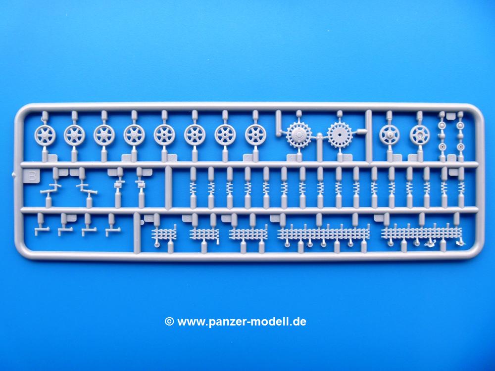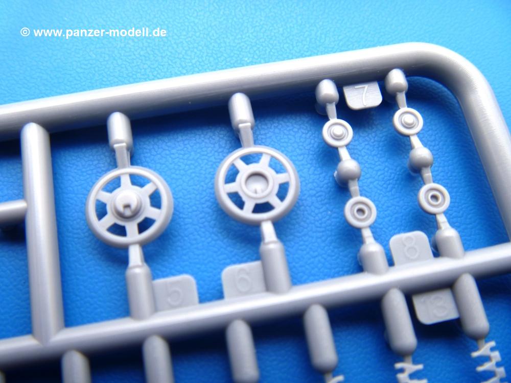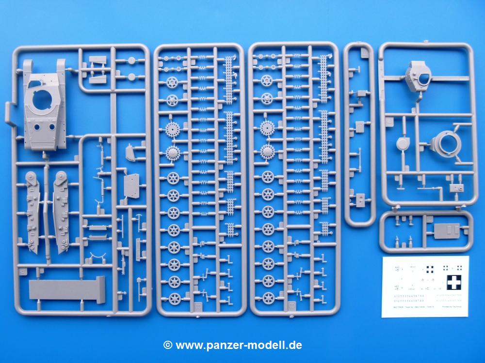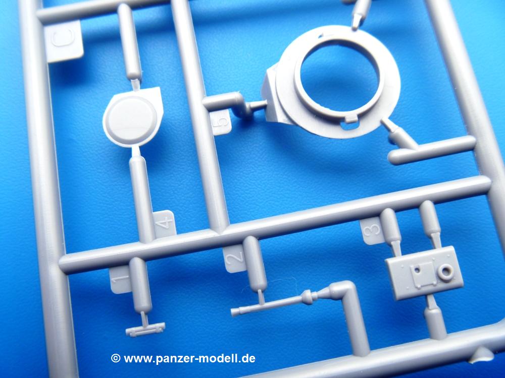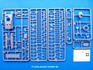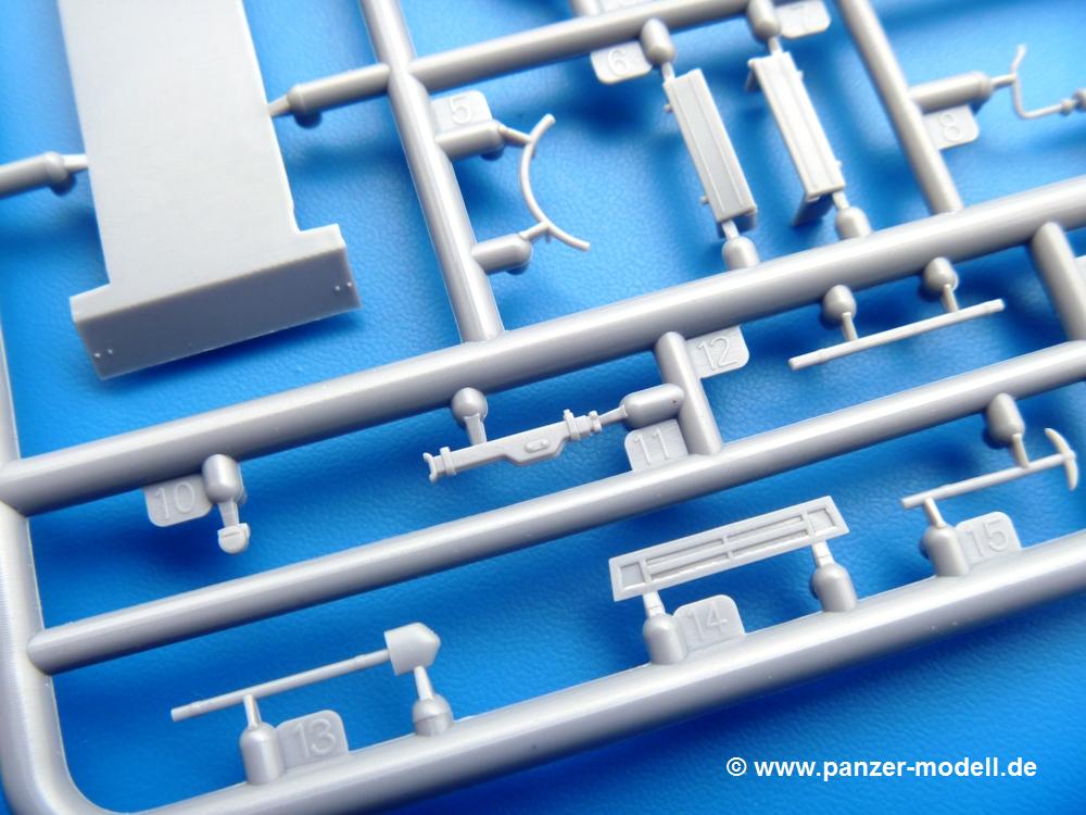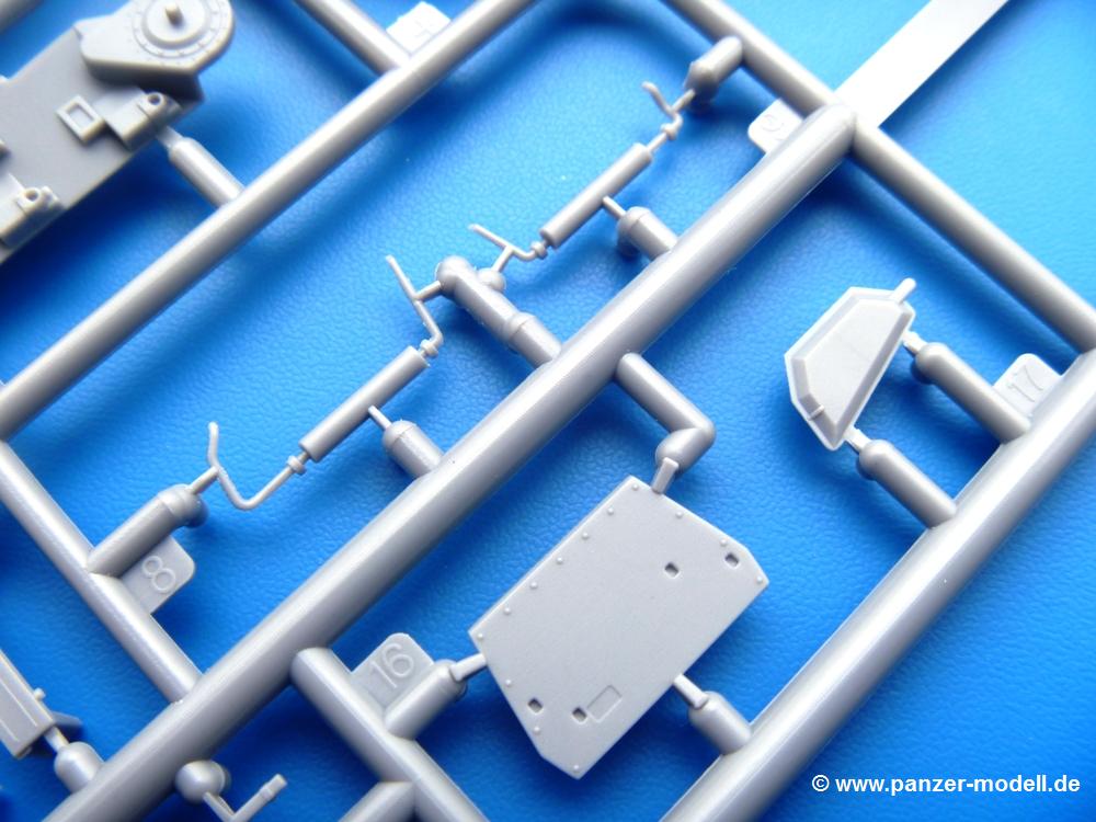 Die Teile aus mittelgrauem Plastik sind sauber ausgespritzt, ohne Grat und Versatz. Die Auswerfer sind meist auf den Spritzrahmen platziert. Feine Details treten scharf hervor.Die Wanne ist mehrteilig in Boden-, Heck-, Bugplatte und Seitenwänden ausgeführt. Ebenso sind Schwingarme, Stoßdämpfer und Kettenspannvorrichtung als separate Teile zu montieren. Die Befestigungsstifte der Schwingarme erscheinen mir ein wenig kurz. Sicheres Verkleben erspart späteren Frust. Alle Räder werden Paaren zusammengeklebt. Nieten und Verschraubungen sind jede Menge vorhanden, die Details treten scharf hervor. Die Ketten bestehen aus verschieden großen Segmenten und Einzelgliedern für die Rundungen der Antriebs- und Leiträder. Die Kettenführungszähne sind auch sehr schön gestaltet. Das Heraustrennen der Einzelglieder wird jede Menge Vorsicht erfordern, da die Glieder extrem fein und zerbrechlich erscheinen.Die Oberwanne besteht aus einem großen Teil mit angegossenen Kettenabdeckungen. Auch hier fallen feine Details wie Nietenreihen, Wartungsklappen, Luftein- und Auslassgrätings auf. An den Staukästen finden wir feine Klavierscharniere. Werkzeuge wie Schaufel, Spitzhacke, Brechstange und Wagenheber beleben das Fahrzeug. Die Fahrerluke kann geöffnet oder geschlossen angebracht werden. Die Scheinwerfer sind mit ihren Schutzbügeln zusammengegossen und wirken ein klein wenig "klotzig", sind aber in dem Maßstab in Spritzguß kaum besser zu gestalten.Der Turm besteht Unter-, Oberteil und Luke. Seitenluken und Sichtklappen sind angegossen, trotzdem aber sehr schön detailliert. Zwar sind auch die 20mm Kanone und die passende Blende im Bausatz vorhanden, aber für den Toldi IIa kommt die 40mm Kanone mit ihrer Blende zum Einsatz. Das Turmheck bekommt noch einen zweiteiligen Staukasten.Dem Bausatz liegen Decals für 2 Fahrzeuge bei. In der Anleitung ist aber nur 1 Version in Wintertarnung über olivgrüner Grundfarbe erwähnt: