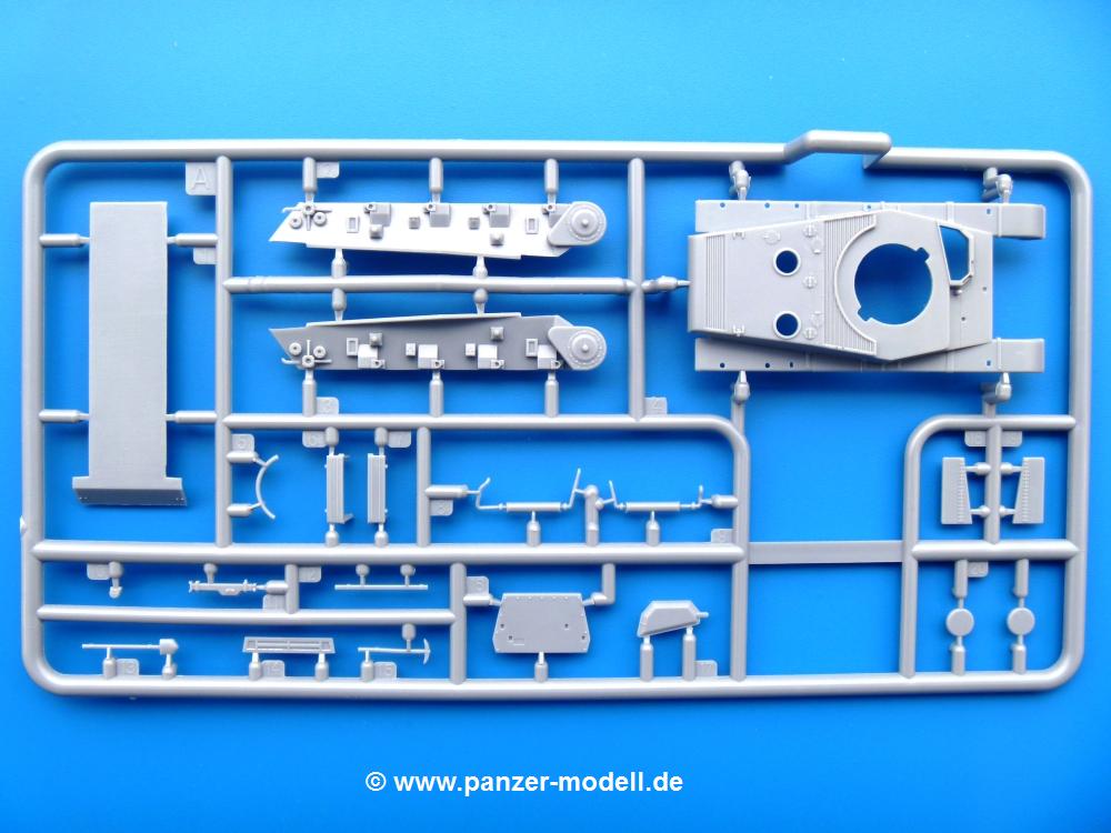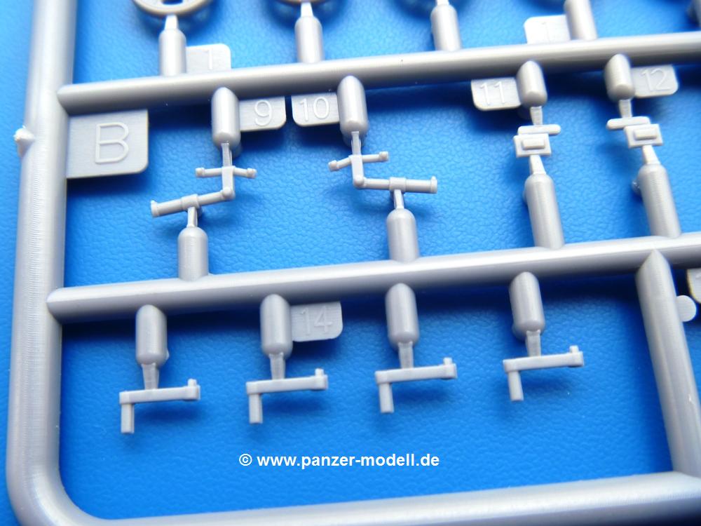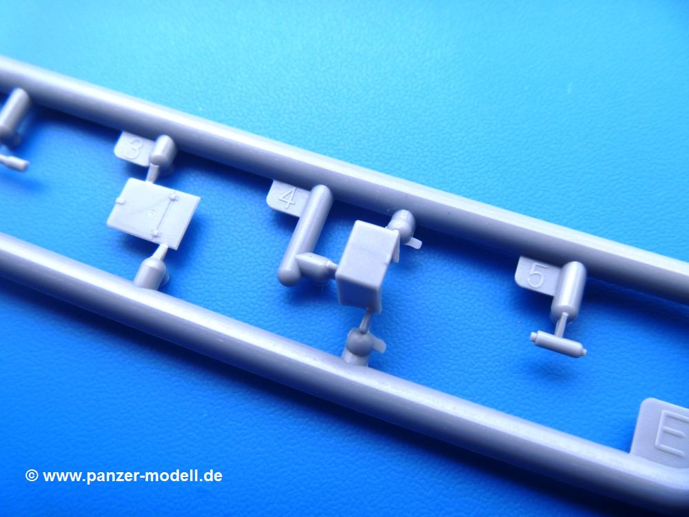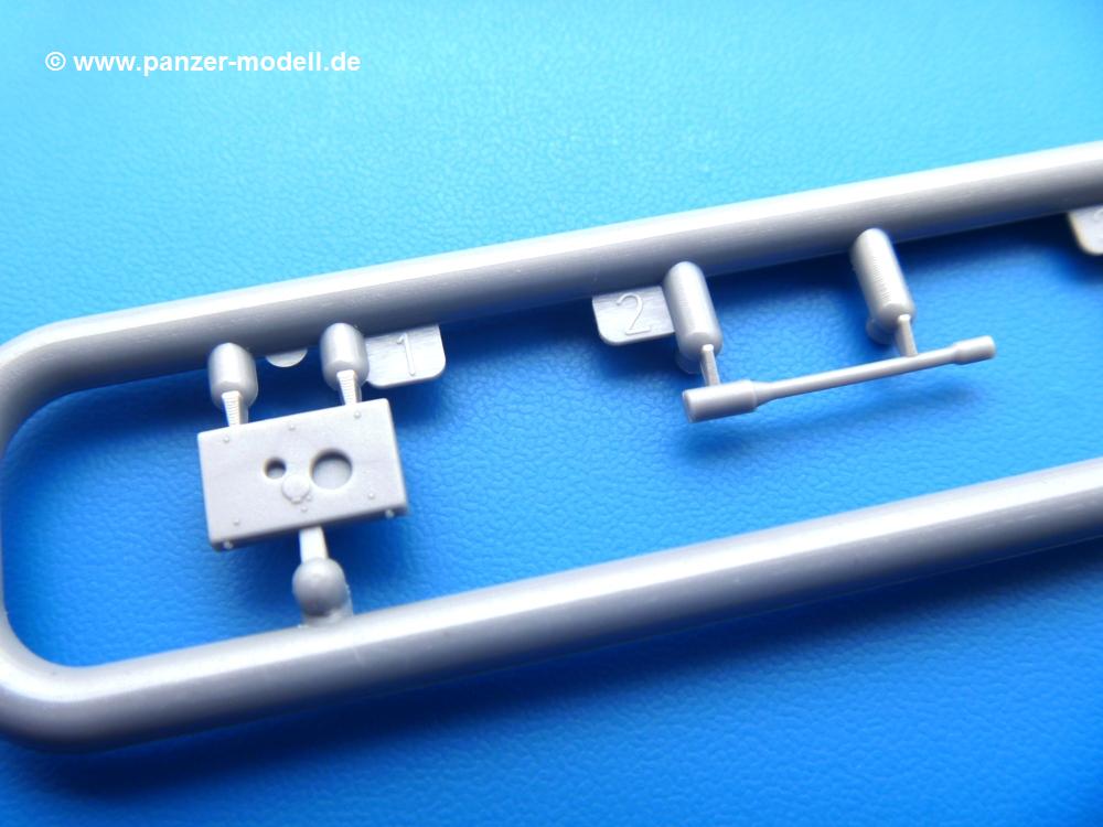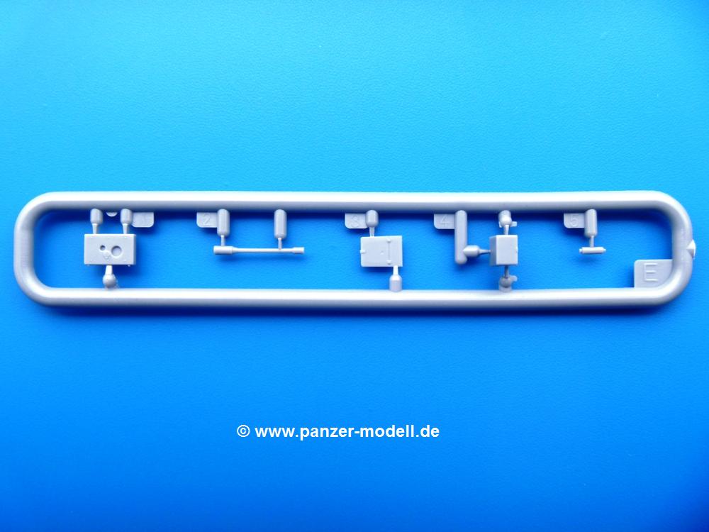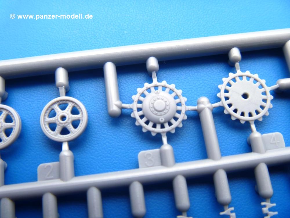Die Teile aus mittelgrauem Plastik sind sauber ausgespritzt, ohne Grat und Versatz. Die Auswerfer sind meist auf den Spritzrahmen platziert. Feine Details treten scharf hervor.Die Wanne ist mehrteilig in Boden-, Heck-, Bugplatte und Seitenwänden ausgeführt. Ebenso sind Schwingarme, Stoßdämpfer und Kettenspannvorrichtung als separate Teile zu montieren. Die Befestigungsstifte der Schwingarme erscheinen mir ein wenig kurz. Sicheres Verkleben erspart späteren Frust. Alle Räder werden Paaren zusammengeklebt. Nieten und Verschraubungen sind jede Menge vorhanden, die Details treten scharf hervor. Die Ketten bestehen aus verschieden großen Segmenten und Einzelgliedern für die Rundungen der Antriebs- und Leiträder. Die Kettenführungszähne sind auch sehr schön gestaltet. Das Heraustrennen der Einzelglieder wird jede Menge Vorsicht erfordern, da die Glieder extrem fein und zerbrechlich erscheinen.Die Oberwanne besteht aus einem großen Teil mit angegossenen Kettenabdeckungen. Auch hier fallen feine Details wie Nietenreihen, Wartungsklappen, Luftein- und Auslassgrätings auf. An den Staukästen finden wir feine Klavierscharniere. Werkzeuge wie Schaufel, Spitzhacke, Brechstange und Wagenheber beleben das Fahrzeug. Die Fahrerluke kann geöffnet oder geschlossen angebracht werden. Die Scheinwerfer sind mit ihren Schutzbügeln zusammengegossen und wirken ein klein wenig "klotzig", sind aber in dem Maßstab in Spritzguß kaum besser zu gestalten.Der Turm besteht Unter-, Oberteil und Luke. Seitenluken und Sichtklappen sind angegossen, trotzdem aber sehr schön detailliert. Zwar sind auch die 20mm Kanone und die passende Blende im Bausatz vorhanden, aber für den Toldi IIa kommt die 40mm Kanone mit ihrer Blende zum Einsatz. Das Turmheck bekommt noch einen zweiteiligen Staukasten.Dem Bausatz liegen Decals für 2 Fahrzeuge bei. In der Anleitung ist aber nur 1 Version in Wintertarnung über olivgrüner Grundfarbe erwähnt:
