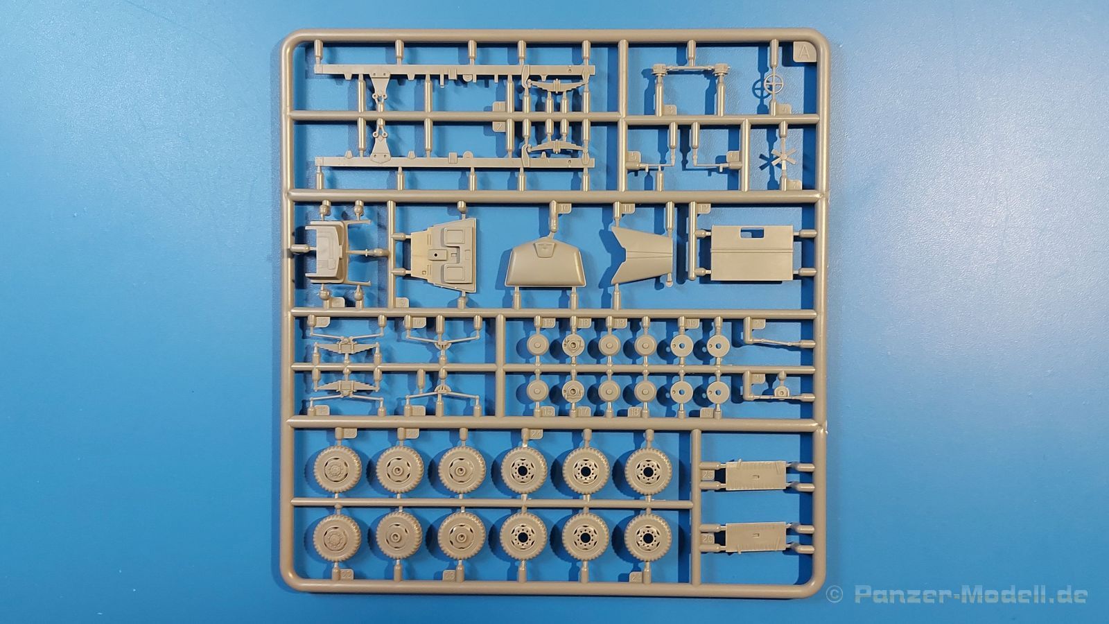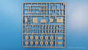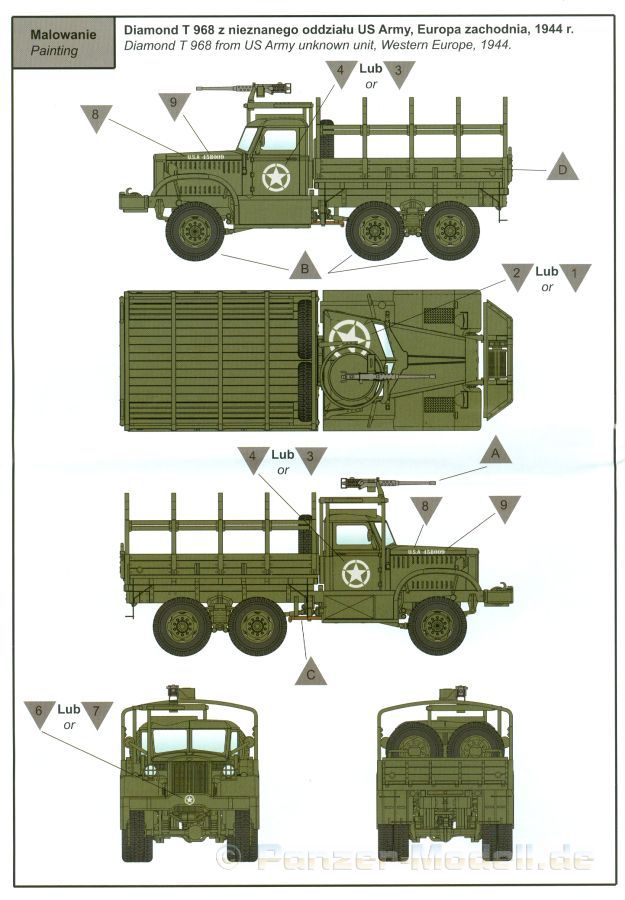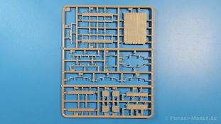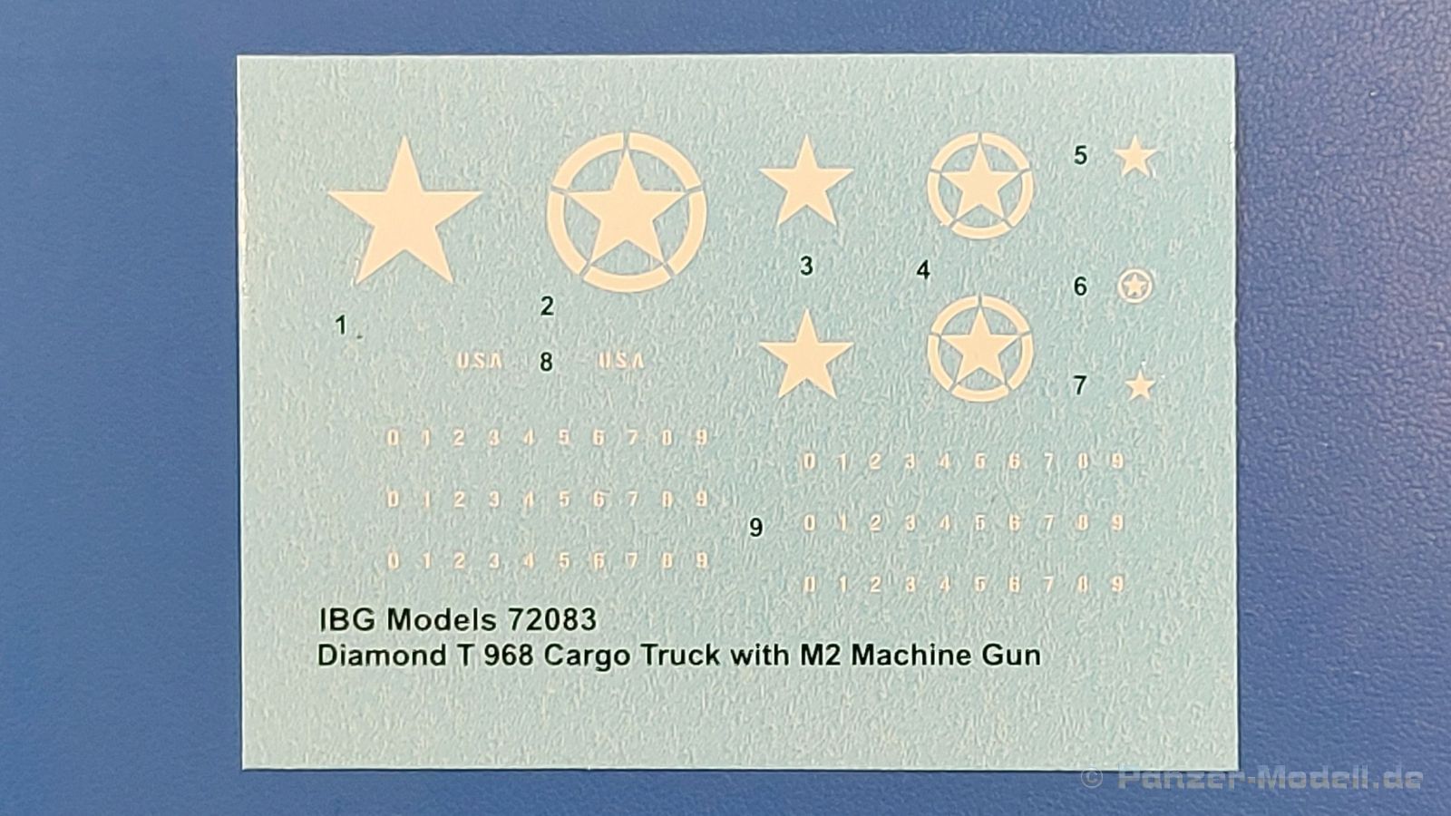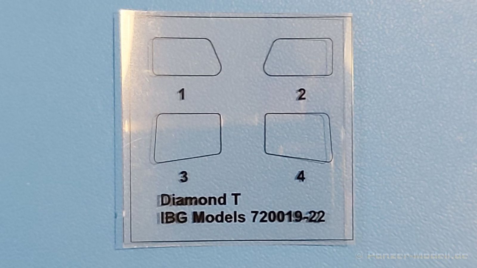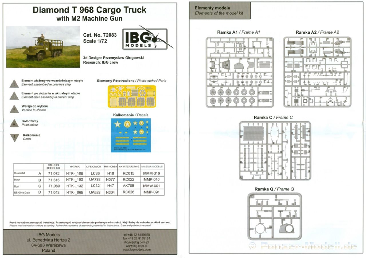 Das Original: Die Diamond T 96-er Reihe wurde im Auftrag der US-Armee zwischen 1939 und 1941 entwickelt. Eigentlich als Artilleriezugmaschine gedacht, gab es aber auch andere Versionen wie Transport-, Abschlepp- und Kipper-Lkw. Der T 968 war ein 3,6 to. Allrad-Transport-Lkw mit 8,3 to. Leergewicht und einer Zuladung bis 3,6 to. Mit dem 131 PS (98 kW) Motor konnte bis 60 km/h beschleunigen und kam mit einer Tankfüllung von 230 Litern bis zu 282 Kilometer weit. Zwischen 1940 und 1945 wurden von den zahlreichen Versionen über 30.000 Lkw produziert. (Informationsquelle: Wikipedia) Der Bausatz: IBG hat uns schon eine Reihe Diamonds beschert. Nun kommt aufbauend auf den Bausatz 72019 die Cargo Version mit dem M2 MG. Wir finden Im Karton 4 graue, 1 PE-Platine, Klarsichtfolie, Decals und die Bauanleitung. Die Spritzlinge A1, A2 und C kennt man bereits aus dem Bausatz 72019, während Q die Teile für das Führerhausdach und den MG Stand enthält. Die Spritzrahmen sind relativ dick im Vergleich zu den teils filigranen und gut detaillierten Teilen. Diese sind sauber ausgespritzt, ohne Grat und Versatz. Angüsse sind so gesetzt, dass Details nicht beeinträchtigt werden, aber bei sehr feinen Teilen wie z.B. dem MG oder den Stützen für den MG-Ring sollte man beim Abtrennen Vorsicht walten lassen. Störende Auswerferspuren sind mir nicht aufgefallen. Das Fahrgestell besteht aus einzelnen Längs- und Querträgern, so dass auch hier gut detailliert ist. An den Längsträgern sind die vorderen Blattfederpaket bereits angegossen, die hinteren gibt es als separate Teile. Die Räder machen einen sehr guten Eindruck das typische Profil ist vorhanden, die Felgen mit Durchbrüchen und Verschraubungen dargestellt. An den Achsen findet man sogar die tellerförmigen Bremszylinder. Kardanwellen, -getriebe und etliches Gestänge gibt es als separate Teile für besseren Detailgrad. IBG spendiert dem Diamond einen kompletten Motor, bei dem die wichtigsten Teile deutlich heraustreten. Das zwar in Plastik bereits vorhandene Kühlerlüfterrad wird durch ein feines PE-Teil ersetzt. Am Kühler sind die Rippen gut herausgearbeitet. Eigentlich schade, dass man ohne Eigeninitiative den Motorraum nicht offen darstellen kann. Das Fahrerhaus bekommt alle wichtigen Elemente wie Lenkstange, -rad, Schalthebel, Sitze. Bei der Instrumententafel kann zwischen der Version für den 968 und den 968A wählen. Die Türen gibt es separat, können also auch offen angebaut werden. Die Fenster des Fahrerhauses bestehen aus dünner Klarsichtfolie, was sie maßstäblich der Wahrheit näherbringt, den Einbau aber auch etwas tricky macht. Außenspiegel und Winkerhebel gibt es auch. Das geschlossene Dach ist im Bausatz enthalten, aber für diesen Diamond liegt das Dach mit dem MG-Stand bei. Dazu kommen die Haltestangen für den Drehring, der Drehring selbst, Gurtkasten und das M2-MG, das mit PE Teilen wie Lagerung und Handgriffen aufgewertet wird. Die Motorhaube besteht aus Ober- und Seitenteilen. Letztere mit angedeuteten Lüfterrippen. Der Kühlergrill besteht aus Plastik, aber IBG hat auch ein PE-Teil dafür. Man entfernt also die Plastikrippen und setzt stattdessen das PE Teil ein, was dem Aussehen der Front sicherlich zu Gute kommen wird. Die großen, markanten Kotflügel bekommen Tanks und Fahrscheinwerfer aus Plastik. Die Plastikschutzgitter der Lampen werden durch PE Teile ersetzt. Auch die Trittflächen auf den Kotflügeln sind aus PE, ebenso die Schlepphaken auf der Stoßstange. In die Stoßstange wird die feine Kabeltrommel der Seilwinde eingebaut. Die Pritsche besteht am Original aus verschraubten Brettern, was IBG auch sehr schön darstellt. Am Pritschenboden ist der Hilfsrahmen gleich angegossen. An der Frontwand befinden sich die Aufnahmen für die zwei Ersatzräder, wie gesagt, die Räder machen was her. Für die Seitenwände gibt es Sitzbänke. Laut Bauanleitung werden die heruntergeklappt angebaut, so dass Soldaten dort Platz nehmen können, aber die Teile lassen auch ein Hochklappen zu, wenn z.B. nur Fracht befördert wird. Auch die Heckklappe kann sowohl geschlossen als auch heruntergeklappt gebaut werden. 5 Spriegel schließen sozusagen die Pritsche nach oben ab. Es gibt keine Plane. Die müsste man ggfs. selbst herstellen. Die Schmutzfänger aus Plastik sind im Bausatz enthalten, aber kein Vergleich zu den ebenfalls beiliegenden Teilen aus PE, die maßstäblich natürlich besser sind. Gemäß Anleitung kann man mit den Decals 1 Fahrzeug einer unbekannten Einheit der US-Armee in West-Europa 1944 darstellen. Die Decals sind seidenmatt glänzend. Die 12-seitige Bauanleitung im A4 Format ist in schwarz-weiß mit farbigen Akzenten gehalten. Kurze Beschreibungen oder Anleitungen sind in Polnisch und in Englisch gehalten. Die erste Seite startet mit Zeichenerklärungen, PE- und Decalübersicht, sowie den benötigten Farben und gibt Farbnummern für Valejo Model Air, Hataka, Life Color, Mr. Hobby, AK Interactive und Mission Models an. Die Teile- und Spritzlingübersicht findet sich Seite 2. Der Bau des Fahrzeugs wird in 22 sinnvoll aufgeteilten, leicht verständlichen Schritten mit ausreichend großen Zeichnungen erklärt. Einzelne Baugruppen, die in einem späteren Bauschritt verbaut werden, erhalten eine weiße Nummer in einem Dreieck. Bei Verwendung der Baugruppe erscheint das Dreieck wieder, dann in schwarzer Schrift. Am Ende der Bauschritte gibt es noch Zeichnungen des fertigen Modells von schräg vorn links und rechts, bzw. schräg hinten. Die Anbringung der Decals und die Bemalungsanleitung des einen Fahrzeugs finden wir auf der letzten Seite. IBG hat viel aus dem Fahrzeug herausgeholt. Die Beigabe der PEs werten ihn weiter auf. Ein Schmuckstück bereits im Karton!