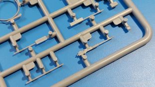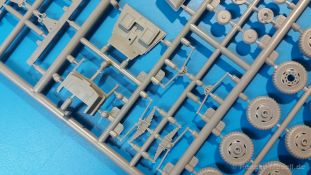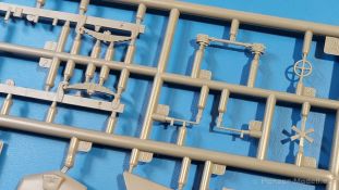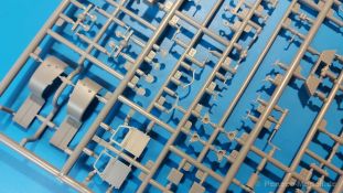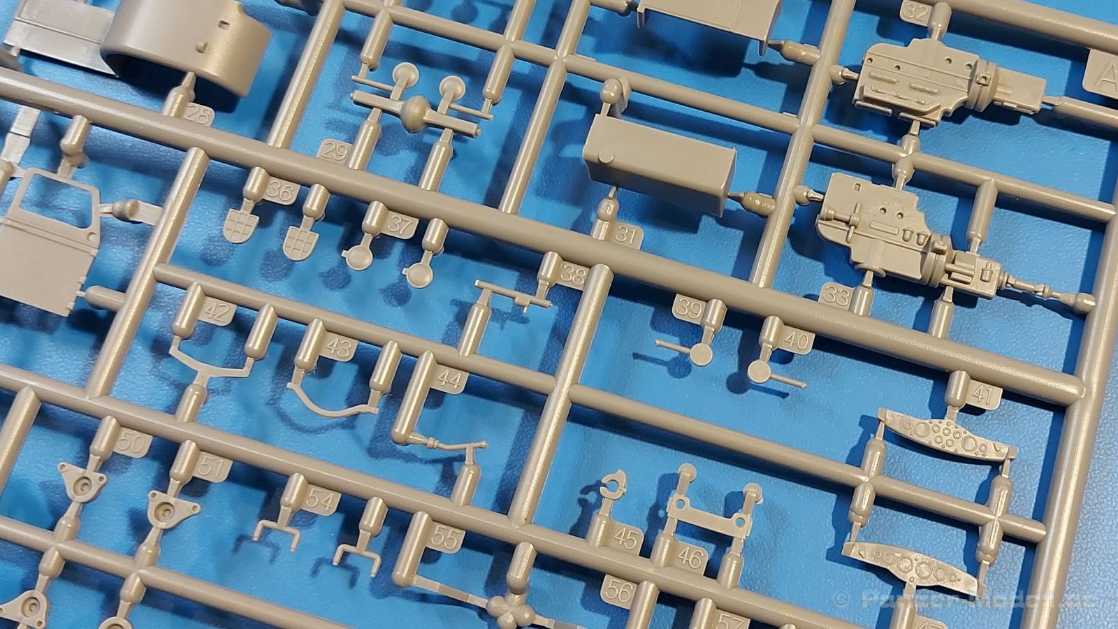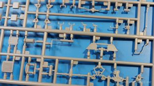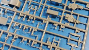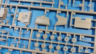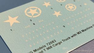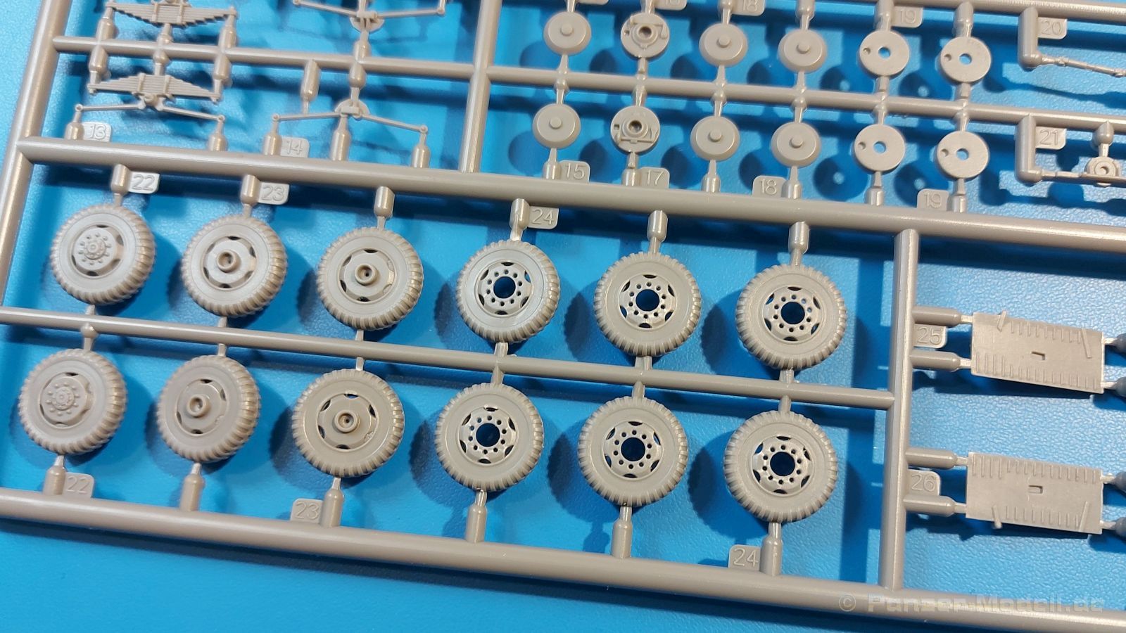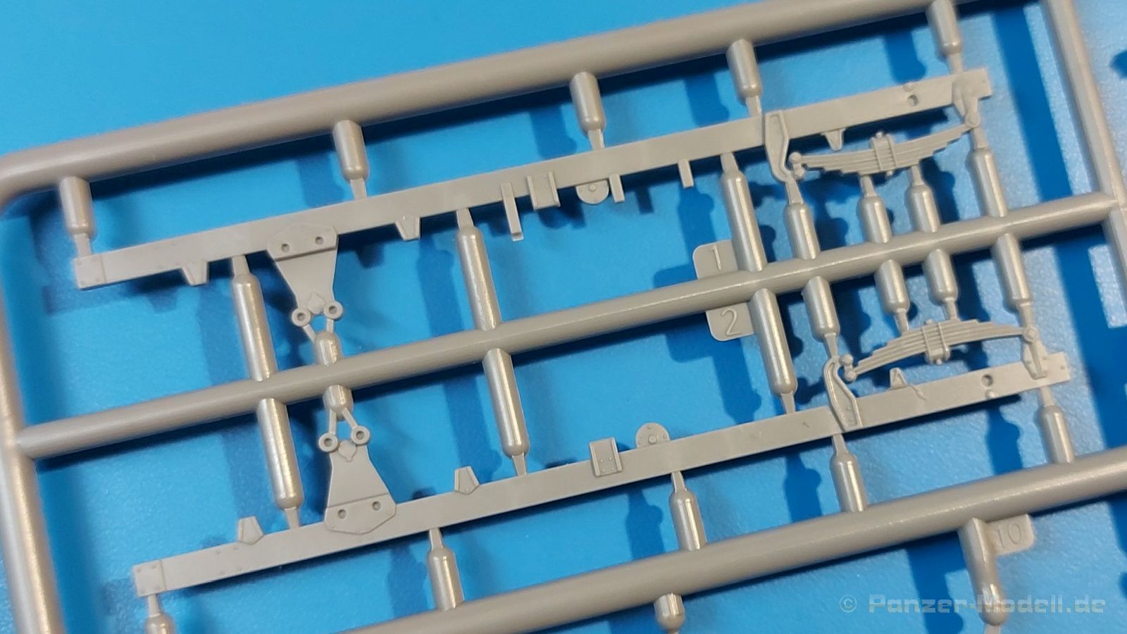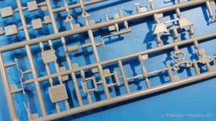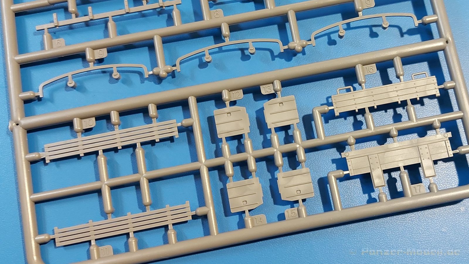 Das Original: Die Diamond T 96-er Reihe wurde im Auftrag der US-Armee zwischen 1939 und 1941 entwickelt. Eigentlich als Artilleriezugmaschine gedacht, gab es aber auch andere Versionen wie Transport-, Abschlepp- und Kipper-Lkw. Der T 968 war ein 3,6 to. Allrad-Transport-Lkw mit 8,3 to. Leergewicht und einer Zuladung bis 3,6 to. Mit dem 131 PS (98 kW) Motor konnte bis 60 km/h beschleunigen und kam mit einer Tankfüllung von 230 Litern bis zu 282 Kilometer weit. Zwischen 1940 und 1945 wurden von den zahlreichen Versionen über 30.000 Lkw produziert. (Informationsquelle: Wikipedia) Der Bausatz: IBG hat uns schon eine Reihe Diamonds beschert. Nun kommt aufbauend auf den Bausatz 72019 die Cargo Version mit dem M2 MG. Wir finden Im Karton 4 graue, 1 PE-Platine, Klarsichtfolie, Decals und die Bauanleitung. Die Spritzlinge A1, A2 und C kennt man bereits aus dem Bausatz 72019, während Q die Teile für das Führerhausdach und den MG Stand enthält. Die Spritzrahmen sind relativ dick im Vergleich zu den teils filigranen und gut detaillierten Teilen. Diese sind sauber ausgespritzt, ohne Grat und Versatz. Angüsse sind so gesetzt, dass Details nicht beeinträchtigt werden, aber bei sehr feinen Teilen wie z.B. dem MG oder den Stützen für den MG-Ring sollte man beim Abtrennen Vorsicht walten lassen. Störende Auswerferspuren sind mir nicht aufgefallen. Das Fahrgestell besteht aus einzelnen Längs- und Querträgern, so dass auch hier gut detailliert ist. An den Längsträgern sind die vorderen Blattfederpaket bereits angegossen, die hinteren gibt es als separate Teile. Die Räder machen einen sehr guten Eindruck das typische Profil ist vorhanden, die Felgen mit Durchbrüchen und Verschraubungen dargestellt. An den Achsen findet man sogar die tellerförmigen Bremszylinder. Kardanwellen, -getriebe und etliches Gestänge gibt es als separate Teile für besseren Detailgrad. IBG spendiert dem Diamond einen kompletten Motor, bei dem die wichtigsten Teile deutlich heraustreten. Das zwar in Plastik bereits vorhandene Kühlerlüfterrad wird durch ein feines PE-Teil ersetzt. Am Kühler sind die Rippen gut herausgearbeitet. Eigentlich schade, dass man ohne Eigeninitiative den Motorraum nicht offen darstellen kann. Das Fahrerhaus bekommt alle wichtigen Elemente wie Lenkstange, -rad, Schalthebel, Sitze. Bei der Instrumententafel kann zwischen der Version für den 968 und den 968A wählen. Die Türen gibt es separat, können also auch offen angebaut werden. Die Fenster des Fahrerhauses bestehen aus dünner Klarsichtfolie, was sie maßstäblich der Wahrheit näherbringt, den Einbau aber auch etwas tricky macht. Außenspiegel und Winkerhebel gibt es auch. Das geschlossene Dach ist im Bausatz enthalten, aber für diesen Diamond liegt das Dach mit dem MG-Stand bei. Dazu kommen die Haltestangen für den Drehring, der Drehring selbst, Gurtkasten und das M2-MG, das mit PE Teilen wie Lagerung und Handgriffen aufgewertet wird. Die Motorhaube besteht aus Ober- und Seitenteilen. Letztere mit angedeuteten Lüfterrippen. Der Kühlergrill besteht aus Plastik, aber IBG hat auch ein PE-Teil dafür. Man entfernt also die Plastikrippen und setzt stattdessen das PE Teil ein, was dem Aussehen der Front sicherlich zu Gute kommen wird. Die großen, markanten Kotflügel bekommen Tanks und Fahrscheinwerfer aus Plastik. Die Plastikschutzgitter der Lampen werden durch PE Teile ersetzt. Auch die Trittflächen auf den Kotflügeln sind aus PE, ebenso die Schlepphaken auf der Stoßstange. In die Stoßstange wird die feine Kabeltrommel der Seilwinde eingebaut. Die Pritsche besteht am Original aus verschraubten Brettern, was IBG auch sehr schön darstellt. Am Pritschenboden ist der Hilfsrahmen gleich angegossen. An der Frontwand befinden sich die Aufnahmen für die zwei Ersatzräder, wie gesagt, die Räder machen was her. Für die Seitenwände gibt es Sitzbänke. Laut Bauanleitung werden die heruntergeklappt angebaut, so dass Soldaten dort Platz nehmen können, aber die Teile lassen auch ein Hochklappen zu, wenn z.B. nur Fracht befördert wird. Auch die Heckklappe kann sowohl geschlossen als auch heruntergeklappt gebaut werden. 5 Spriegel schließen sozusagen die Pritsche nach oben ab. Es gibt keine Plane. Die müsste man ggfs. selbst herstellen. Die Schmutzfänger aus Plastik sind im Bausatz enthalten, aber kein Vergleich zu den ebenfalls beiliegenden Teilen aus PE, die maßstäblich natürlich besser sind. Gemäß Anleitung kann man mit den Decals 1 Fahrzeug einer unbekannten Einheit der US-Armee in West-Europa 1944 darstellen. Die Decals sind seidenmatt glänzend. Die 12-seitige Bauanleitung im A4 Format ist in schwarz-weiß mit farbigen Akzenten gehalten. Kurze Beschreibungen oder Anleitungen sind in Polnisch und in Englisch gehalten. Die erste Seite startet mit Zeichenerklärungen, PE- und Decalübersicht, sowie den benötigten Farben und gibt Farbnummern für Valejo Model Air, Hataka, Life Color, Mr. Hobby, AK Interactive und Mission Models an. Die Teile- und Spritzlingübersicht findet sich Seite 2. Der Bau des Fahrzeugs wird in 22 sinnvoll aufgeteilten, leicht verständlichen Schritten mit ausreichend großen Zeichnungen erklärt. Einzelne Baugruppen, die in einem späteren Bauschritt verbaut werden, erhalten eine weiße Nummer in einem Dreieck. Bei Verwendung der Baugruppe erscheint das Dreieck wieder, dann in schwarzer Schrift. Am Ende der Bauschritte gibt es noch Zeichnungen des fertigen Modells von schräg vorn links und rechts, bzw. schräg hinten. Die Anbringung der Decals und die Bemalungsanleitung des einen Fahrzeugs finden wir auf der letzten Seite. IBG hat viel aus dem Fahrzeug herausgeholt. Die Beigabe der PEs werten ihn weiter auf. Ein Schmuckstück bereits im Karton!