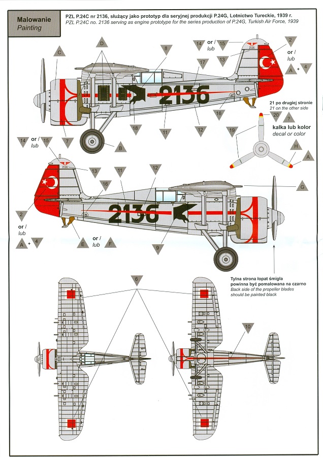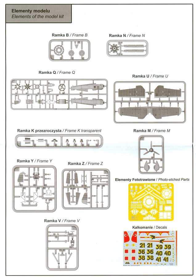 Die Decals sind wie gewohnt seidenmatt ohne Trägerrand. Auch für die Armaturentafel liegt ein recht farbiges Decal bei. Die 12-seitige Bauanleitung im A4 Format ist in schwarz-weiß mit farbigen Akzenten gehalten. Kurze Beschreibungen oder Anleitungen sind in Polnisch und in Englisch gehalten. Auf der ersten Seite finden wir etwas zur Geschichte des Flugzeuges in Polnisch und in Englisch. Seite 2 zeigt uns die Teileübersicht, allerdings ist die Folie für die Cockpitfenster nicht aufgeführt. Zu Beginn von Seite 3 finden wir eine Bemalungstabelle mit Farbnummern für Valejo, Hataka, Life Color, Mr. Hobby und AK Interactive und ein paar Zeichenerklärungen. 13 Bauschritte führen einen zum fertigen Modell in sinnvoll aufgeteilten, leicht verständlichen Schritten mit ausreichend großen Zeichnungen. Einzelne Baugruppen, die in einem späteren Bauschritt verbaut werden, erhalten eine weiße Nummer in einem Dreieck. Bei Verwendung der Baugruppe erscheint das Dreieck wieder, dann in schwarzer Schrift. Am Ende der Bauschritte gibt es noch 1 Zeichnung des fertigen Modells in 3 Ansichten. Die Anbringung der Decals und die Bemalungsanleitung von 2 Fahrzeugen finden wir auf den letzten Seiten. Ein nettes, kleines Fliegerchen mit nicht alltäglichen Markierungen. Und man kann sich an einem Ganzmetallfinish probieren. Mit etwa 11,- EUR kann man dieses Modell in Deutschland erwerben.