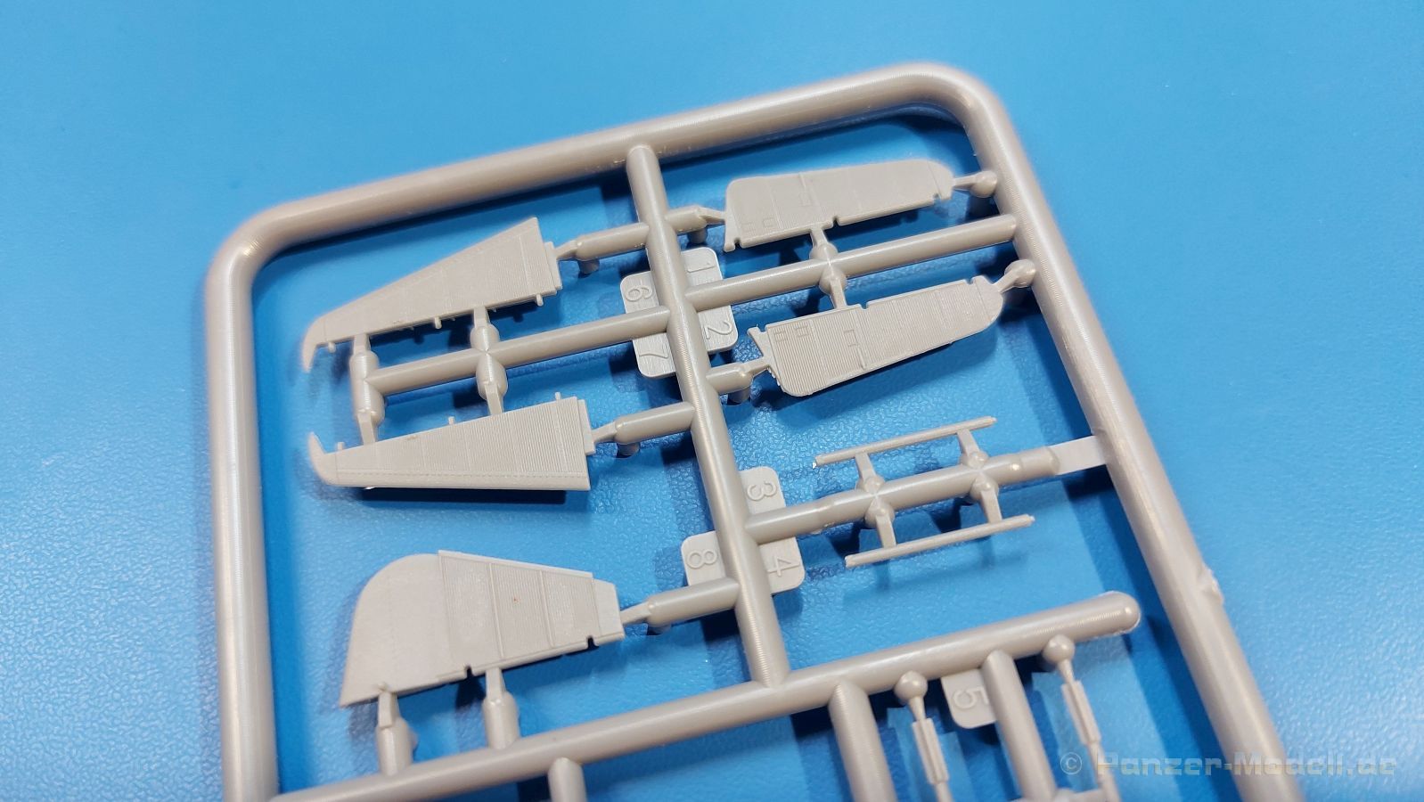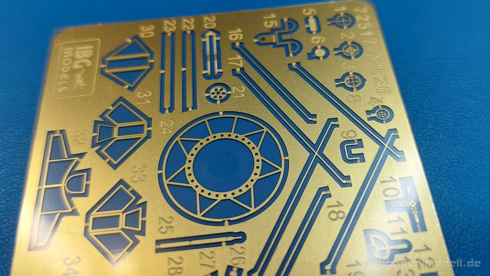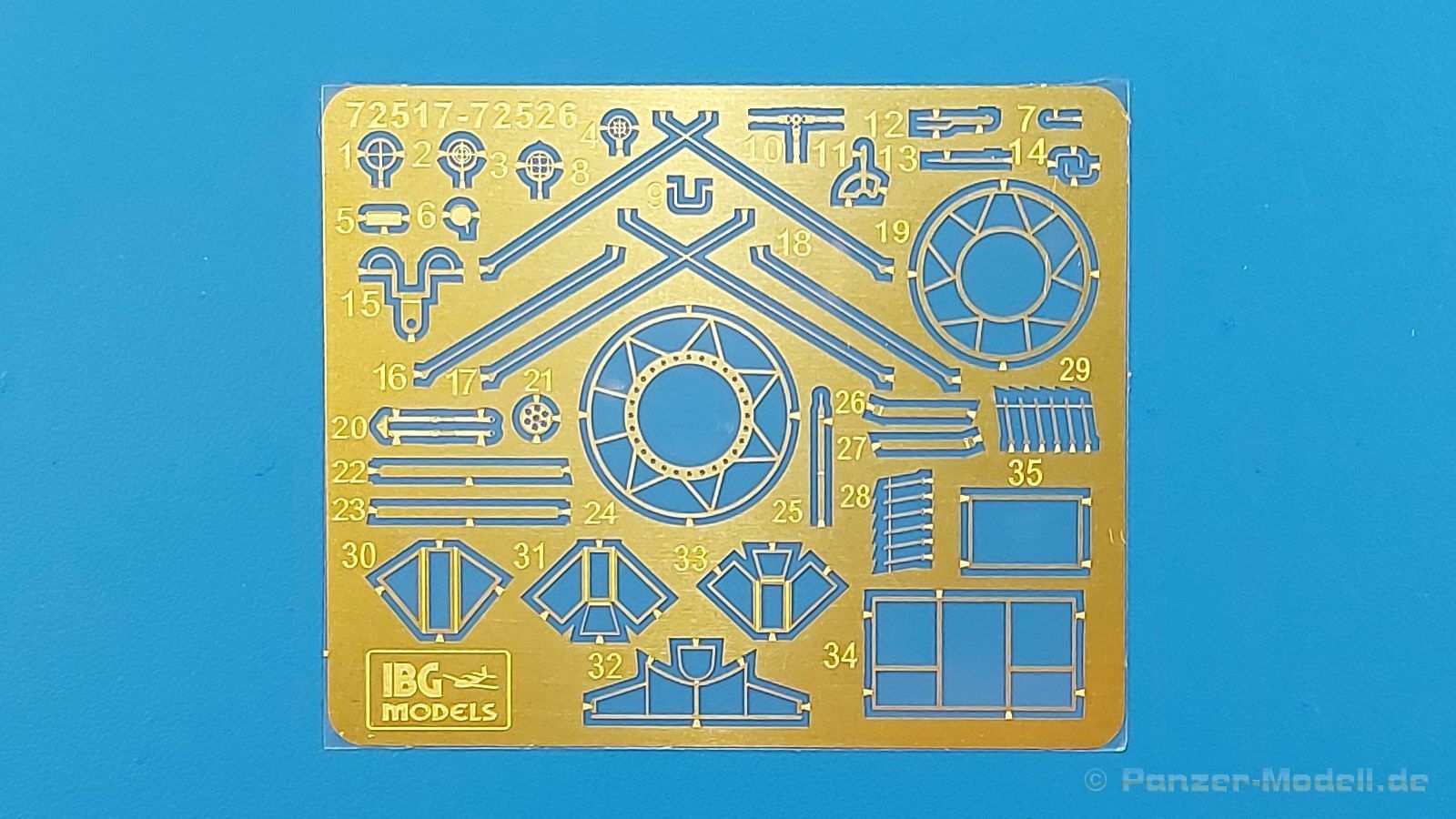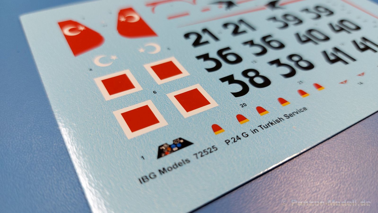 Das Original: Das PZL P.24 war ein, in Polen zwischen 1936 und 1939, für den Export produziertes, einmotoriges Jagdflugzeug, das auf Elementen des PZL P.11 aufbaute. Die Hauptnutzerländer waren Bulgarien, Griechenland, Rumänien und die Türkei. Mit dem 970 PS (723 kw) 14-Zylinder-Doppelsternmotor erreichte es 430 km/h. Die Bewaffnung bestand aus zwei 7,7mm MG und zwei 20 mm Kanonen, alle im Flügel untergebracht. Der Bausatz: IBG präsentiert uns hier ein Modell des interessanten Hochdeckers im Kleid der türkischen Luftwaffe. Wir finden im Karton 8 graue und 1 Klarsichtspritzling, 1 PE-Platine, Klarsichtfolie, Decals und die Bauanleitung. Die Spritzrahmen sind relativ dick im Vergleich zu den teils filigranen und gut detaillierten Teilen. Diese sind sauber ausgespritzt, ohne Grat und Versatz. Angüsse sind so gesetzt, dass Details nicht beeinträchtigt werden. Grobe Auswerferspuren sind mir nicht aufgefallen. Das Cockpit besteht aus Bodenplatte, Sitz und Steuerknüppel. Sitzgurte, Pedale und Trimmrad sind aus PE. Das Trimmrad PE-21 ist in der Anleitung fast nicht zu sehen. Da es sehr blass ausgedruckt ist. Im Cockpitbereich in den Rumpfhälften sehen wir feine Spanten. Für die Armaturentafel gibt es ein buntes Decal. Die Rumpfhälften mit versenkten Gravuren zeigen bereits viele Details. Der Motor besteht aus 2 Ringen zu je 7 Zylindern. Dazu kommt ein Ring mit den Auspuffauslässen, ein PE Ring, eine gelochte Abdeckung und die Motorabdeckung aus einem Teil. Unterhalb der Haube findet ein Luftkanal seinen Platz. Die Oberseite des geknickten Flügels besteht aus einem Teil, die Unterseite aus zweien. Die Flügelteile zeigen eine sehr feine Riffelung und etliche Wartungsklappen. Die Querruder werden separat angebaut. Der Knickflügel sitzt auf dem Rumpf vor der Cockpithaube auf und wird auf jeder Seite von 2 Stützen am Rumpf abgestützt. Auch die Heckflügel haben separate Ruder und auch je 2 Stützen pro Seite. Seitenleitwerk und Seitenruder sind ebenfalls als separate Teile vorhanden. Wie bereits beim Flügel finden wir beim Höhen- und Seitenleitwerk feine Rippen und Riffelungen. Das feststehende Fahrwerk besteht aus V-Trägern pro Seite, die mittels PE-Gestänge gesichert werden. Die Räder sind wie beim Original einfach gehalten. Der Hecksporn ist bereits an den Rumpfhälften angegossen. Pro Seite kommen 2 winzige Bomben unter die Flügel. Propeller und Nabe bestehen aus einer Einheit und werden fest mit der Motornabe verklebt. Oben in der Mitte des Knickflügels wird eine Visiereinrichtung aus PE Teilen angebracht. Bei der Cockpithaube hat die Wahl zwischen Klarsichtteilen aus Plastik oder Rahmen aus PE, in die Folien als Cockpitverglasung eingesetzt werden. Anfänger werden sich vielleicht eher mit den Plastikteilen begnügen, Fortgeschrittene versuchen sich wohl eher an PE und Folien. Gemäß Anleitung kann man 2 Flugzeuge der türkischen Luftwaffe mit den Decals darstellen: