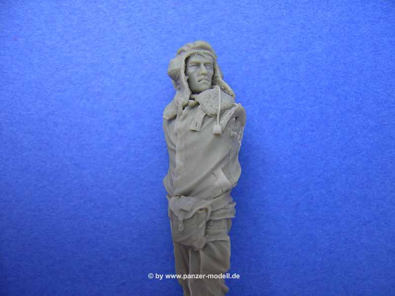 Das Gewehr ist übrigens ebenfalls sehr schön und fein detailliert dargestellt. Eine kleine Base aus Resin für die Präsentation liegt bei. Auf ihr sind bereits Abdrücke von Stiefeln und Kettenspuren modelliert. Die feinen Details der Figur wie z. B. der Pelzkragen an der Jacke, das Kabel für die Panzerschutzhaube, der "fiese" Gesichtsausdruck, der Faltenwurf an der Kleidung und Ausrüstung...