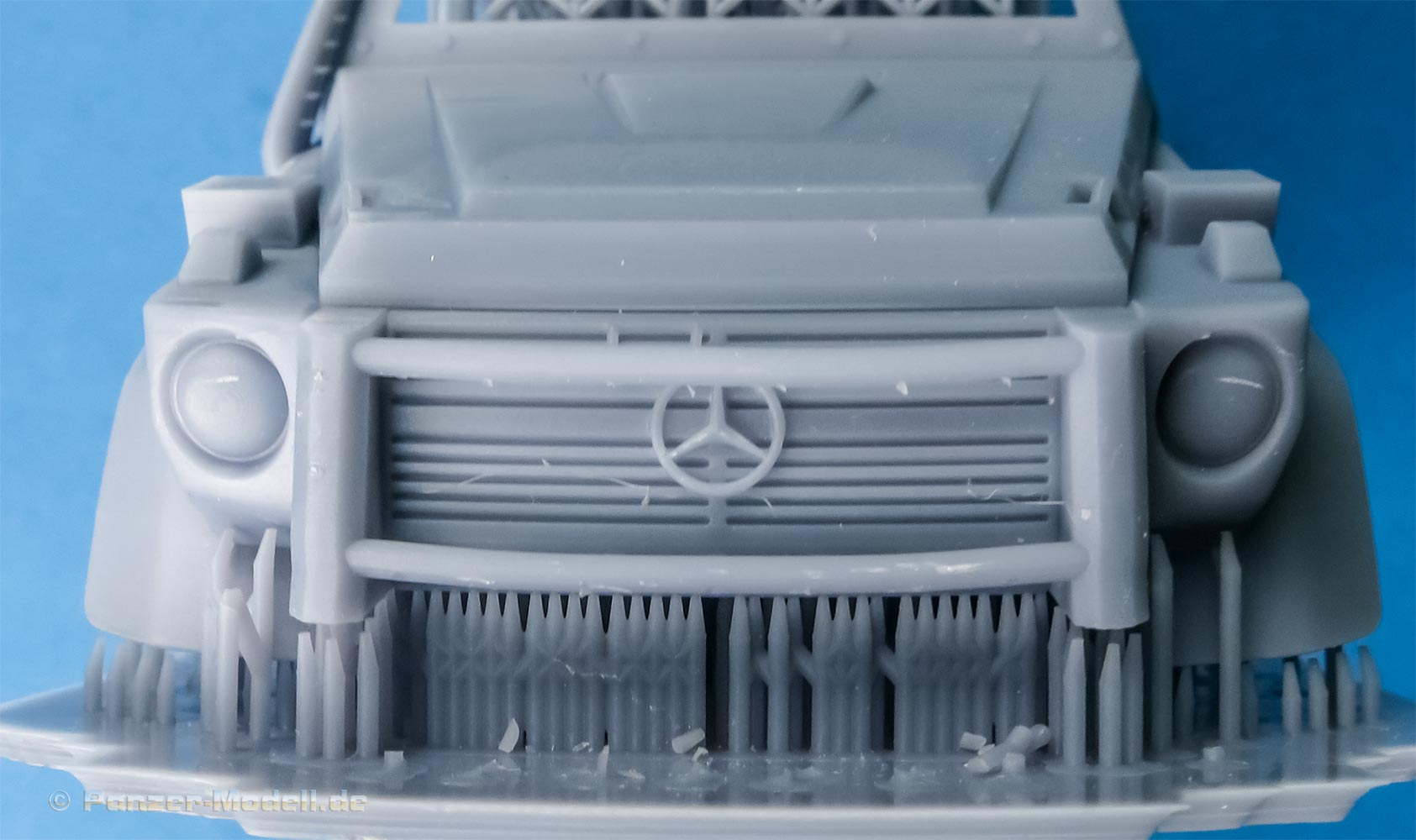 Diese Teile sind in Grunde durchweg gut gedruckt, verzugsfrei und mit schönen aufgedruckten Details. Die Karosserie erfreut mit nahezu komplettem Druck von vorn bis hinten, also von der Kühlermaske mit Rammschutz über die Motohaube bis an die hinter Aufbaukante.