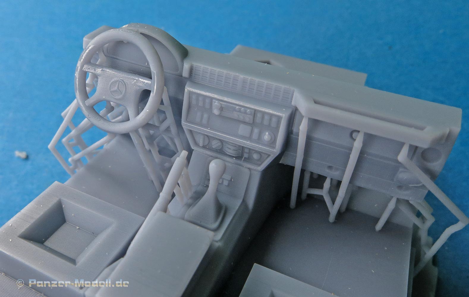 Der Innenraum ist im Grunde einteilig mit Bodenplatte, Armaturenbrett und bereits angedrucktem Lenkrad. Das Armaturenbrett ist wirklich toll mit feinen Details gedruckt.