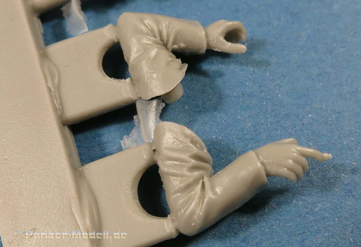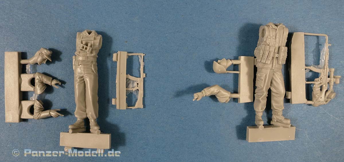 Die Posen der beiden Figuren sind beide stehen, der Infanterist mit der Waffe in der rechten Hand (etwas in Rambo Manier) und die linke Hand je nach Anbau deutend oder abstützend. Der Kommandant mit leicht angewinkelten Armen, die Hände so dass man diverse Sachen wie etwas eine Karte, eine Waffe, o.ä. einlegen kann und damit sehr flexibel einsetzbar