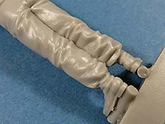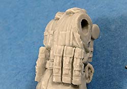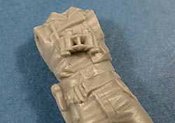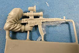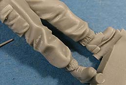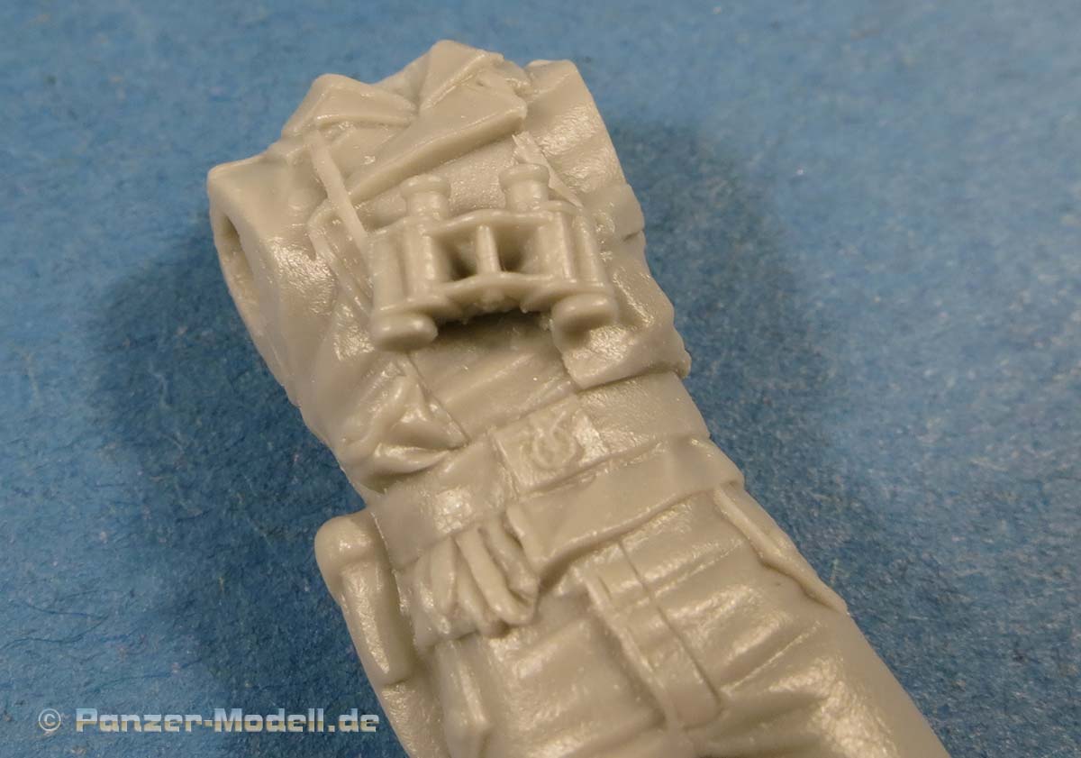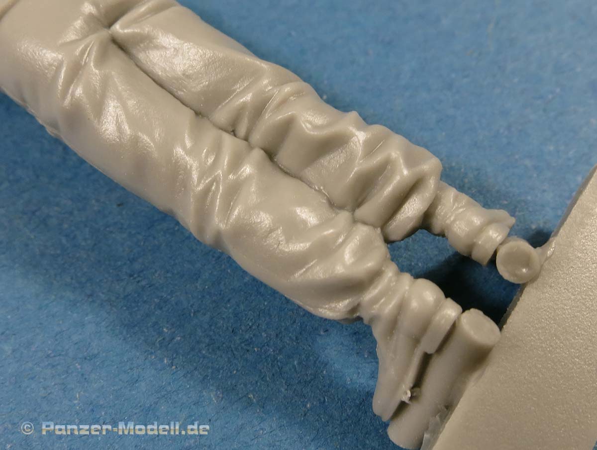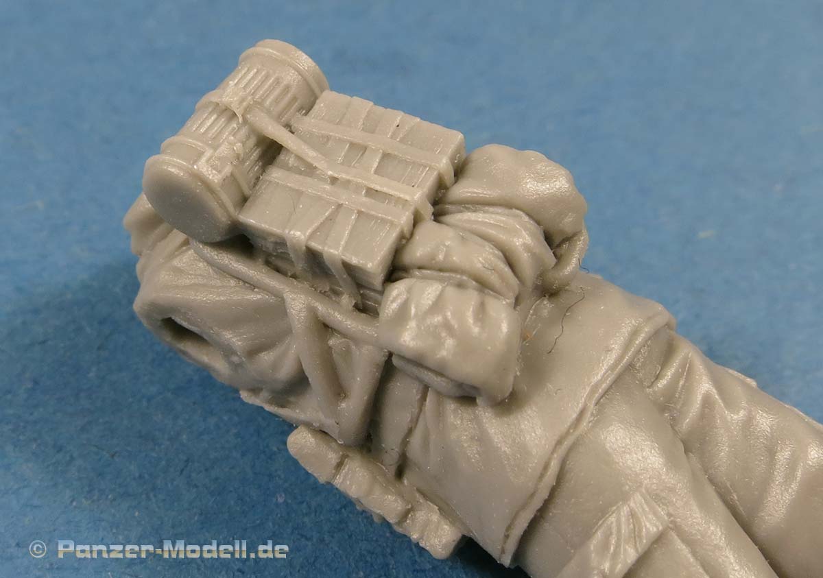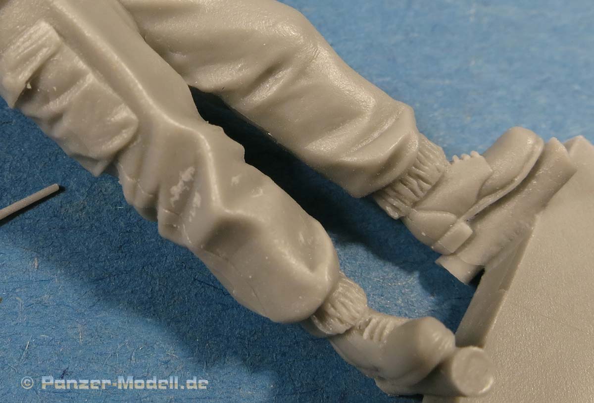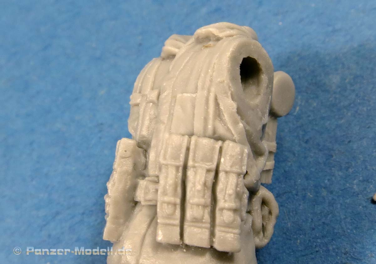 Allein die bereits angegossenen Teile beim Infanteristen sind ganz großes Kino. Auf dem Rücken die Batterie für das Infrarotnachtsichtgerät des Gewehrs, die Gasmaskendose und eine eingerollte Plane. Man kann sogar die einzelnen Schnürriemen erkennen. Fantastisch. Auch die Details mit dem tollen Faltenwurf der Hose und dem Bund am Beinabschluss gefallen extrem gut.