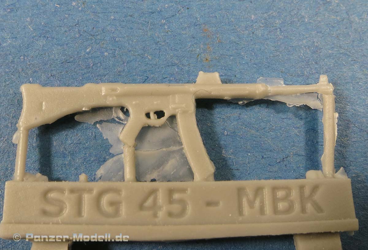 Für den Kommandanten liegt ein einzelnes Sturmgewehr 45 bei, ein Entwurf von Mauser, der zu Kriegsende in die Produktion gehen sollte, aber nur wenige Waffen wirklich fertggestellt wurden. Auch hier der Guss und die Darstellung ganz ausgezeichnet. Auch wieder mit filigranen Teilen sodass beim Versäubern vorsichtig gearbeitet werden muss