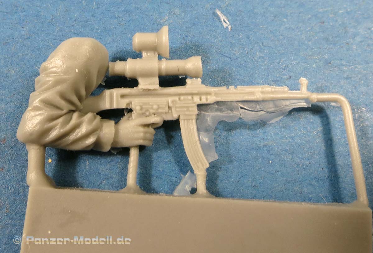 Kommen wir zu den Waffen - diese sind ebenfalls fein und detailliert in Resin gegossen der Infanterist trägt ein Sturmgewehr 44 mit Nachtsichtgerät "Vampir" bereits mit an den rechten Arm gegossen. Damit ist ein perfekter Sitz der Waffe in der Hand garantirt. Der Guss ist absolut hervorragend und im Bereich des Gewehrs sehr filigran. Hier muss man schon ein bisschen aufpassen beim Versäubern nichts abzubrechen. Teils finden sich hier ein paar Fischhäute, die aber schnell entfernt sind.