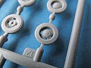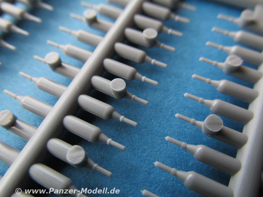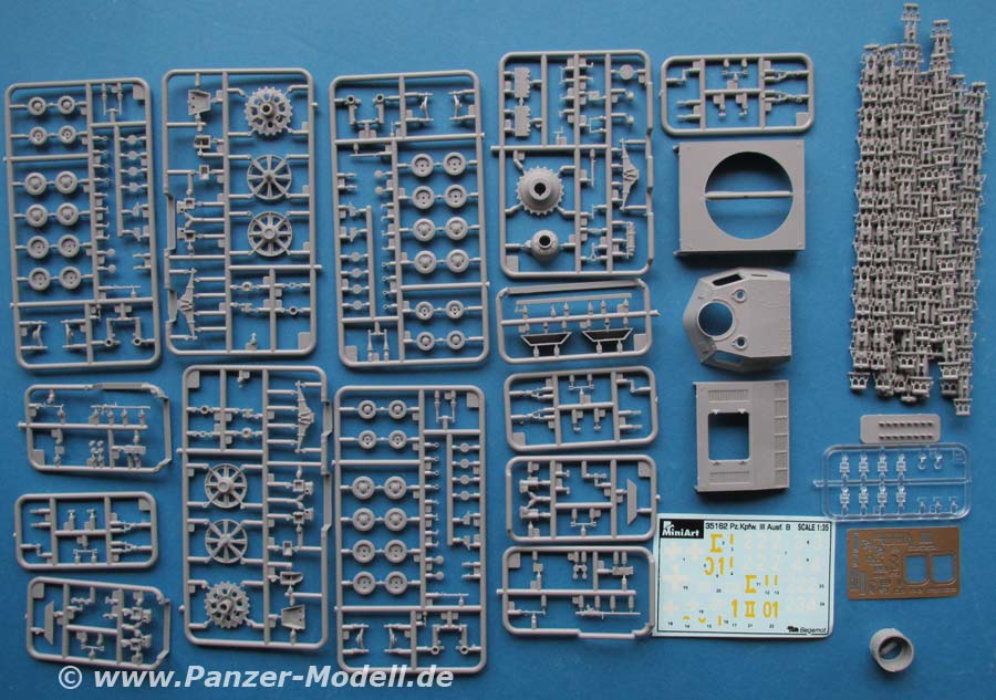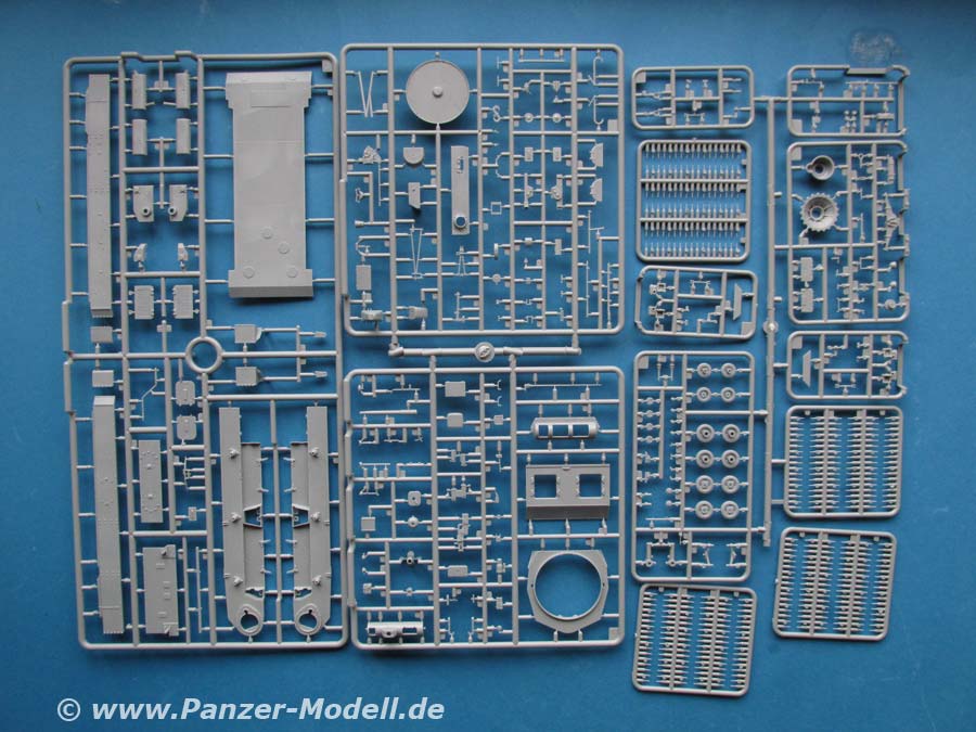 Es finden sich 21 größere und kleinere Spritzlinge in hellgrauem Plastik, ein Spritzling in durchsichtigem Plastik, das Panzerkastenoberteil, Motordeck, Turmoberteil, Kommandantenkuppel, 18 Spritzlings-Stränge mit je 12 Kettengliedern, eine kettenbauhilfe, eine PE Platine und ein Decalbogen. Insgesamt 1057 Plastikteile!