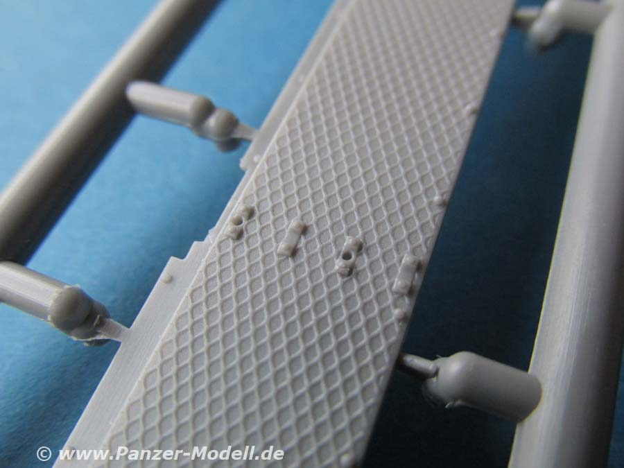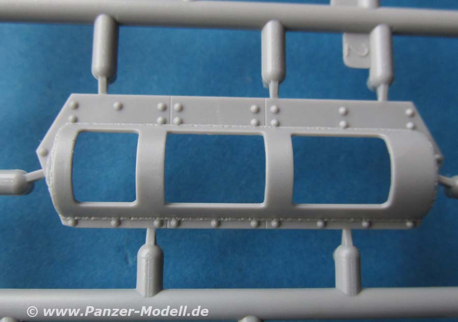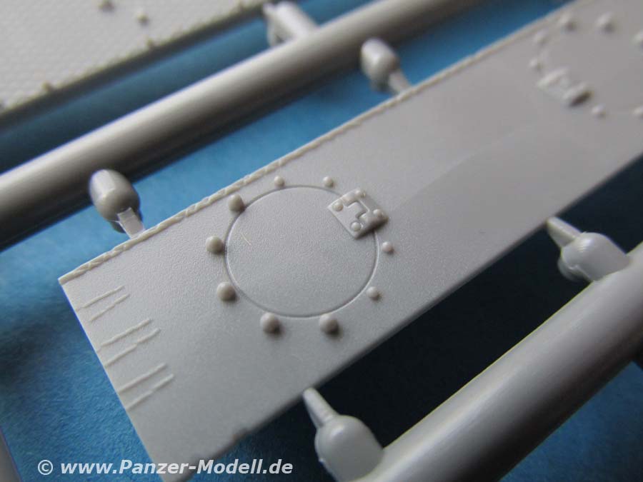 Die Unterwanne setzt sich aus Bodenplatte und den Seitenteilen zusammen. Auch das Oberteil setzt sich aus mehreren Teilen zusammen, wie die Bugplatte, Hauptteil, Motordeck. Die Darstellung der Nieten und Schweißnähte ist eine echte Augenweide, gerade die unregelmäßige Struktur und Stärke der Schweißnähte ist sehr gut gelungen.