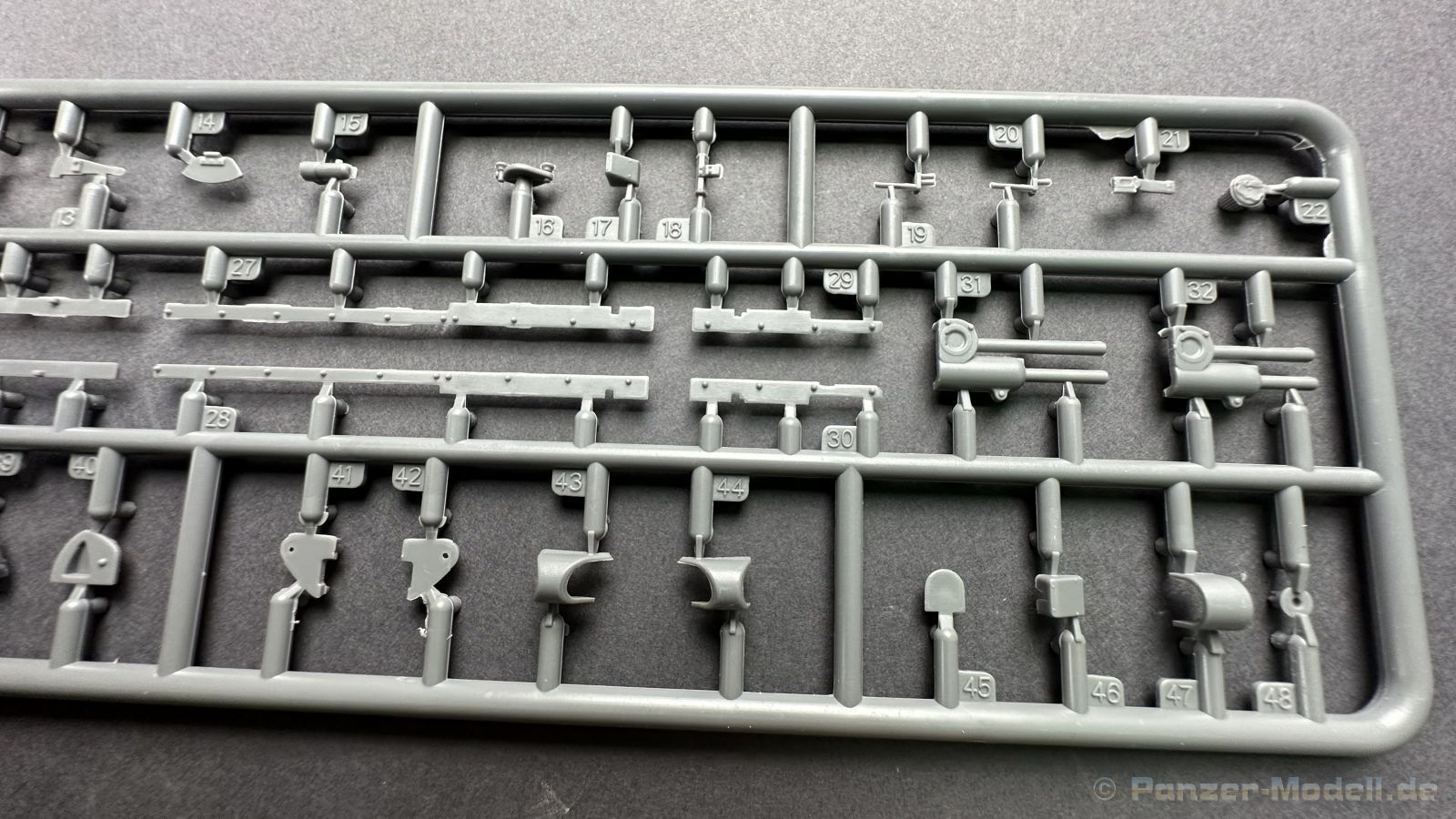76 Baustufen gibt es zu vervollständigen, die Anleitung ist klar und leicht zu verstehen. Wo man sehr gut auspassen sollte, ist die Bezeichnung der einzelnen Spritzlinge, durch die Verwandtschaft mit den Bausätzen inkl. Inneneinrichtung haben wir sehr viele Buchstabenkombinationen mit Groß und Kleinbuchstaben. Die Farbangaben für die 5 verschiedenen Decalvarianten reichen von Vallejo, Mr Color C Farben, AK Real Colors, Mission Models, Ammo of Mig bis zu Tamiya. Pro Decalvariante finden wir mindestens 4 Ansichten + Besonderheiten zur Bemalung bzw. Anbringung der Naßschiebebilder, die übrigends aus dem Hause Cartograf stammen und für eine hohe Qualität sorgen Die Wanne besteht aus mehreren Teilen, die zusammengefügt werden müssen, auch hier ist Vorsicht geboten da, wenn die Wanne nicht konsequent gerade ausgerichtet wird es später zu Problem kommen wird bzgl. der Passgenauigkeit der weiteren Aufbauten. Man kann gut sehen das Mini-Art aus seinem Füllhorn an bereits vorhanden Bausätzen geschöpft hat, auch an Bausätzen mit Inneneinrichtung. An vielen innen liegenden Bauteilen sind die Aufnahmen zu erkennen die benötigt werden, um eine Inneneinrichtung zu bauen, die Teile liegen aber nicht mit dabei. Ein wenig schade ist das die Luken und Motorraumklappen alle offen dargestellt werden können aber keinerlei Inhalt zum Füllen beiliegt, da lobe ich mir immer noch Dragon die eine rudimentäre Inneneinrichtung beigelegt haben. Da bleiben nur die Optionen, Luken zu oder Luken auf und mit Figuren bemannen. Leider weisen doch viele Bauteile Fischhaut auf, was z.b. an den Einzelgliederketten, die noch dazu 3 Angüsse haben, ziemlich ärgerlich ist, da hier dem Modellbauer eine fiese Sisyphusarbeit an die Hand gegeben wird. Die späten Merkmale der StuH, sind nach meinem Wissen gut eingefangen worden, neben dem fehlenden Narbendeckel auf den Antriebsrädern, dem von innen zu bedienenden MG zur Selbstverteidigung finden wir noch gummisparende Rücklaufrollen und andere Kleinigkeiten, die eine späte StuH ausmachen. Im allgemeinen sin die Bausätze von Mini Art Hyperdetaliert , um mal ein paar Beispiele zu nennen wir finden auf den Laufrollen endlich mal einen anderen Hersteller, nämlich Vorwerk , dann sind Nieten, Gravuren und Schweißnähte hervorragend dargestellt. Die Kettenbleche sind von oben und unten mit Gravuren versehen und wie es aussieht auch der korrekten Wiedergabe des Riefelbleches, alleine das wäre schon ein Grund zum Kaufen ïwas sich leider auch in den immensen Spritzlingen bzw. Bauteilen niederschlägt bzw. Bauteilen. Die Kettenglieder müssen geklebt werden, ähnlich wie bei den Magic Tracks von Dragon, es empfiehlt sich also, erst alles Glieder zu versäubern, das Laufwerk zusammen zu bauen und dann die Kette zu montieren damit alles passt, wenn der Kleber angezogen ist. Werkzeuge sollen laut Anleitung mit Halterungen aus Ätzteilen befestigt werden. Die Schürzen und die Umrandung für Gepäck liegen als Ätzteile dabei, etwas frickelig sieht die Montage der Schürzenhalterung aus, hier ist viel sorgsam geboten. Interessanterweise liegt dem Bausatz kein Abschleppseil dabei, die Kauschen ja, ein Seil jedoch nicht. Erfreulicherweise liegt ein einteiliges Kanonenrohr dabei für die 10,5 Haubitze, leider sind die Züge ein wenig in den oberen Kunststoff eingeschnitten, hier hilft ein wenig Schmirgeln. Richtig ist, dass die Mündungsbremse nicht dabei ist, diese entfiel im Laufe des Jahre 1944. Zusammenfassend würde ich sagen, hier bekommt der geneigte Modellbauer einen Bausatz der die bisher erscheinen Bausätzen anderer Hersteller überlegen ist, jedoch ein wenig Liebe benötigt um ein tolles Modell zu bauen, ich würde sogar soweit gehen und sagen das der Bausatz aufgrund seiner kleinen und filigranen Bauteile, den Ätzteilen nicht Anfängerfreundlich ist und einen etwas erfahrenen Modellauer benötigt. Für mich persönlich schließt sich ein lang gehegter Traum, ich baue mit dieser StuH 42 den Panzer nach, der in den Farbaufnahmen bei den Seelower Höhen mit Schwingschürzen zu sehen ist.