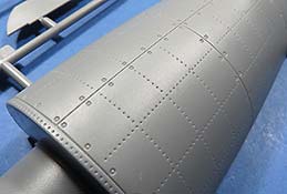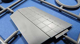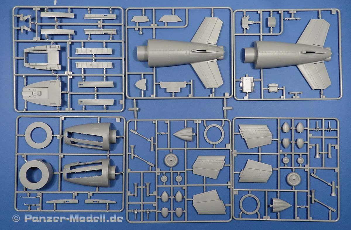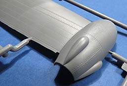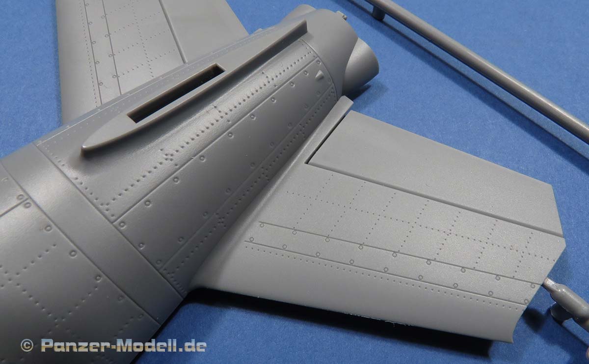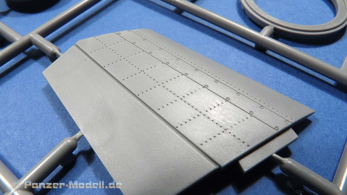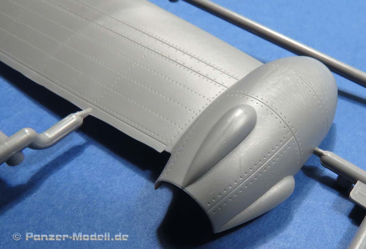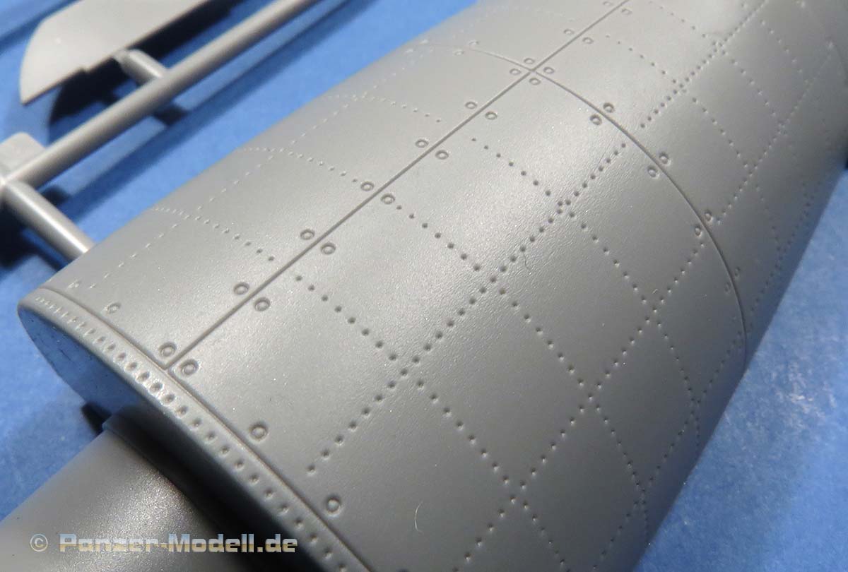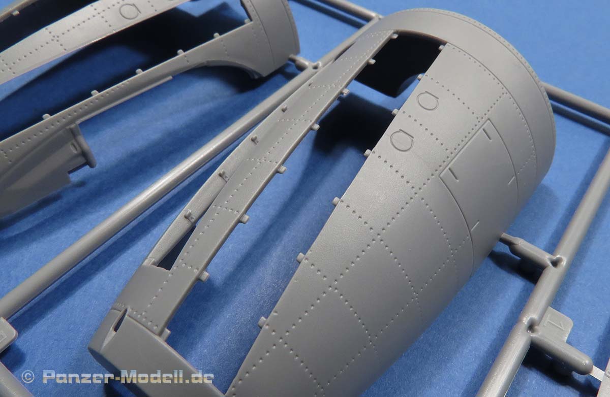 Der Rest der Oberflächenstrukturen ist phänomenal fein detailliert mit hunderten von Nieten, sauber und fein dargestellt. Die Rumpfteile seitzen sich aus jeweils zwei Halbschalen zusammen.