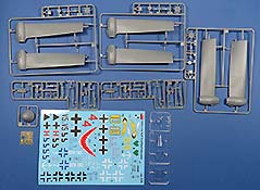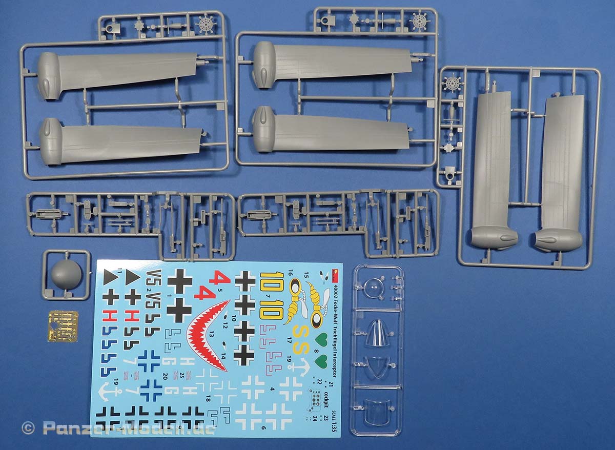 Der Karton enthält 12 graue Spritzlinge, ein Klarsichtspritzling, eine PE Platine und ein Decalbogen.