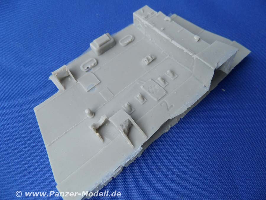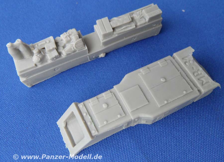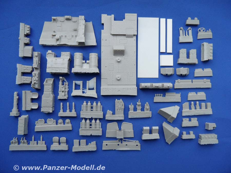 Inneneinrichtung M88A1 US Army Ein Problem des M88 von AFV ist die fehlende Inneinrichtung, welche durch die großen Seitentüren besonders auffällt bzw. eben nicht auffällt! Dies wird seit einigen Jahren schon von MR-Modell behoben in Form ihrer Inneneinrichtung aus Resin. Die Qualität der Teile ist sehr gut! Lediglich ein wenig Grat ist zu entfernen. Enthalten ist Alles außer der großen Winde im Wannenbug. Diese ist aber eh nicht zu sehen. Die Bodenplatte weiß durch ihre schöne Struktur zu gefallen und passt, wie ich aus eigener Erfahrung weiß, wie der Rest perfekt in die AFV-Wanne. Die Regale für Munition usw sind aus beiliegendem Plastisheet selbst zu erstellen. Auch an die ausklappbaren Trittstufen wurde gedacht. Insgesamt ein sehr guter Umbausatz! Und der M88 hat das echt nötig! Sicher auch für den M88A2 zu benutzen, wenn man kein totaler Nietenzähler ist (hab ich gemacht! Läuft!). Aufgrund der Menge, Größe und Qualität der Teile geht der Preis von ca. 48,- EUR auch noch in Ordnung!